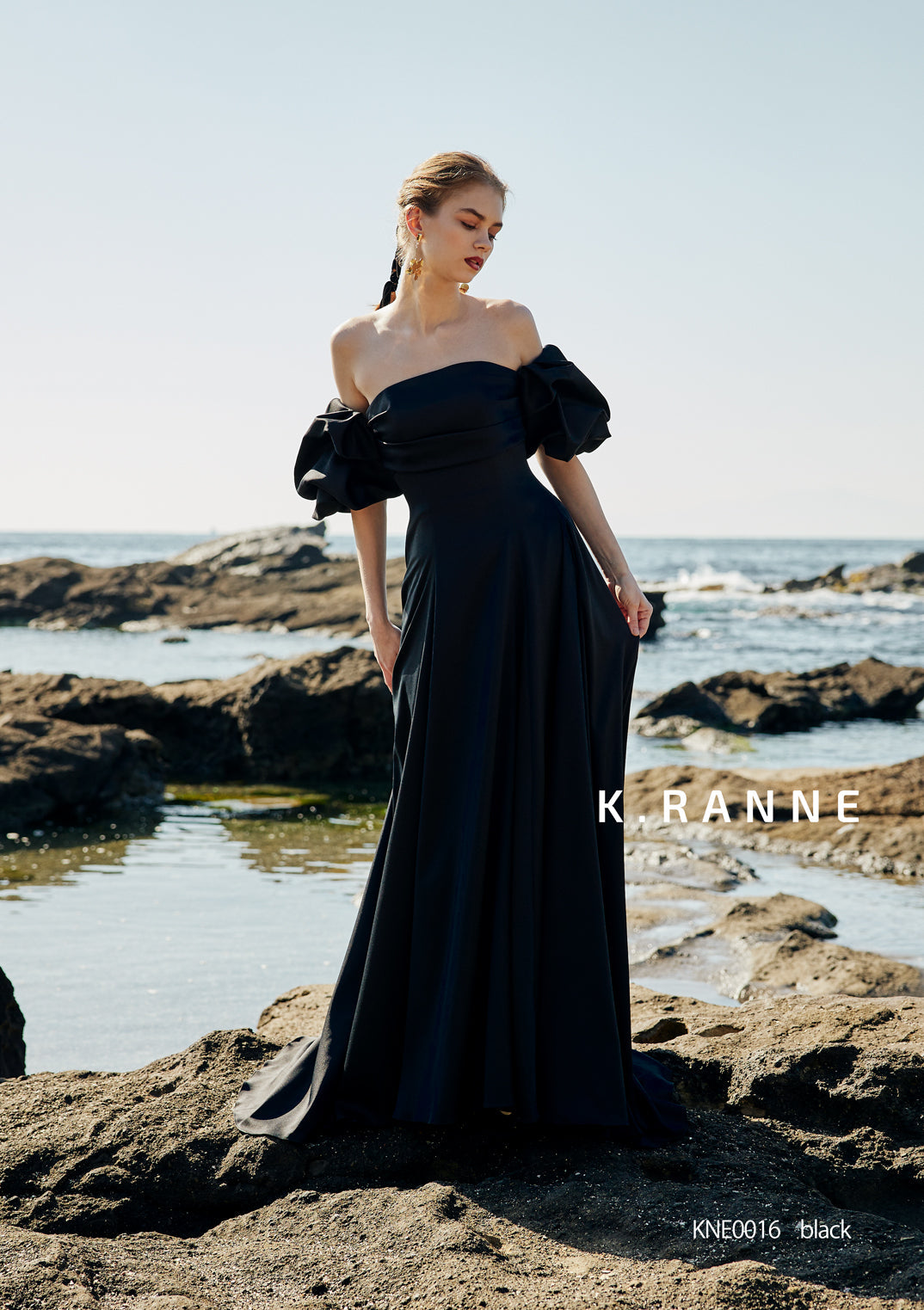 トレンドカラーであるブラックのマットサテンを使用。胸元のニュアンスドレープから切り替わるフィット&フレアのシルエットがスタイルアップを叶えます。取り外し可能なトレンドのパフスリーブと、バックのアシンメトリーなリボンが目を引く一着