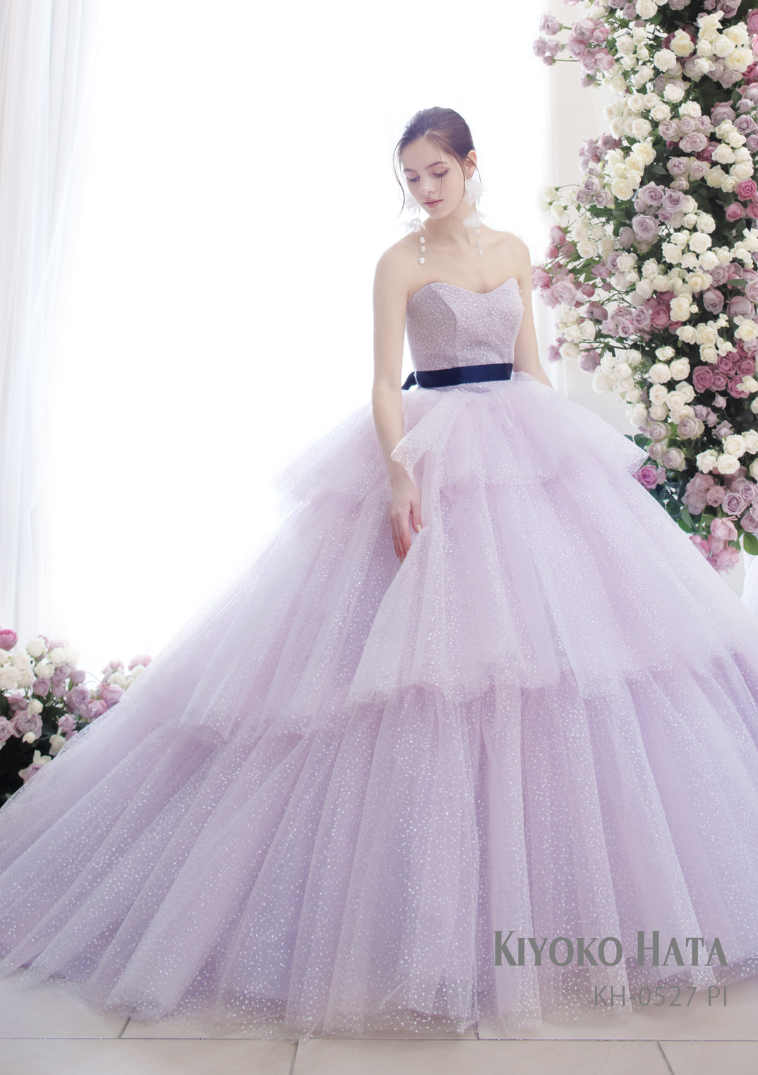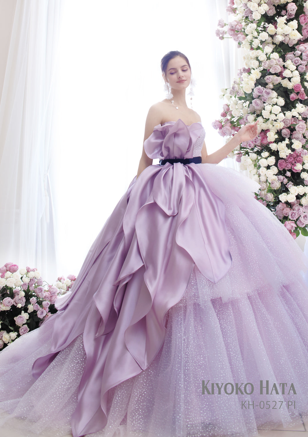 「祝福」「壮大な美しさ」「無垢」「雄大な愛」…他にも沢山愛らしい花言葉を持つカサブランカが主役のドレス。カサブランカを光沢感と上質なサテン生地にする事で気高い優美さを演出。お花を取り外すとボリュームたっぷりの輝くグリッター3段チュールでゴージャスなプリンセスに。