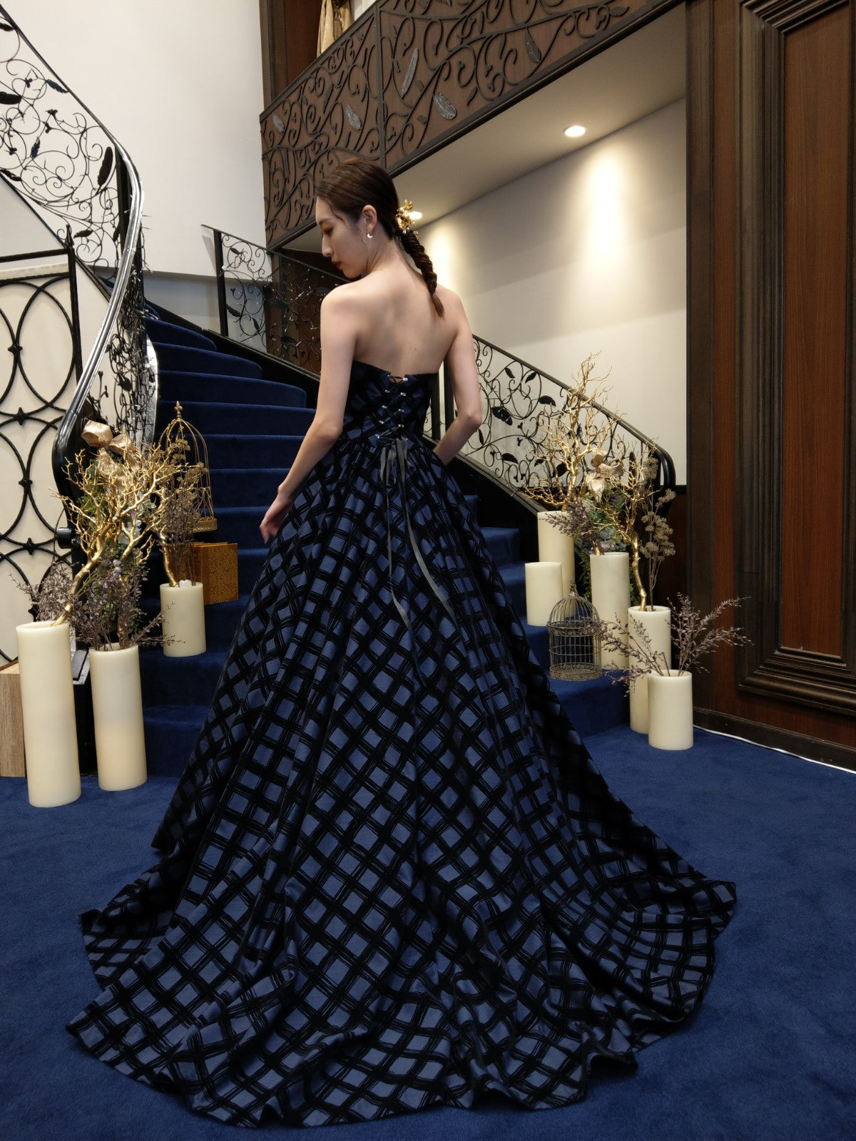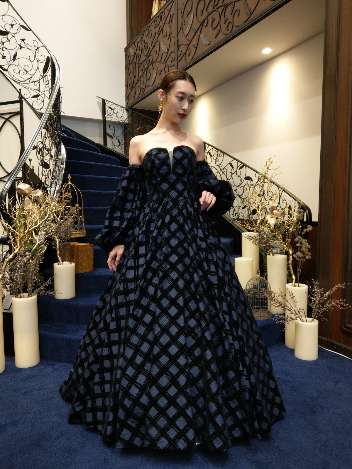 流行のプランジネックラインにビッグパフスリーブ。ベルベット素材のバイアスチェック柄がインパクト大でお洒落な花嫁様におススメの一着。※パフスリーブは取り外し可能。