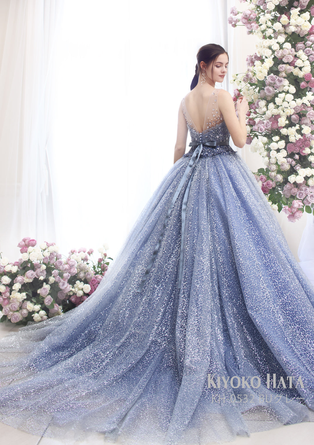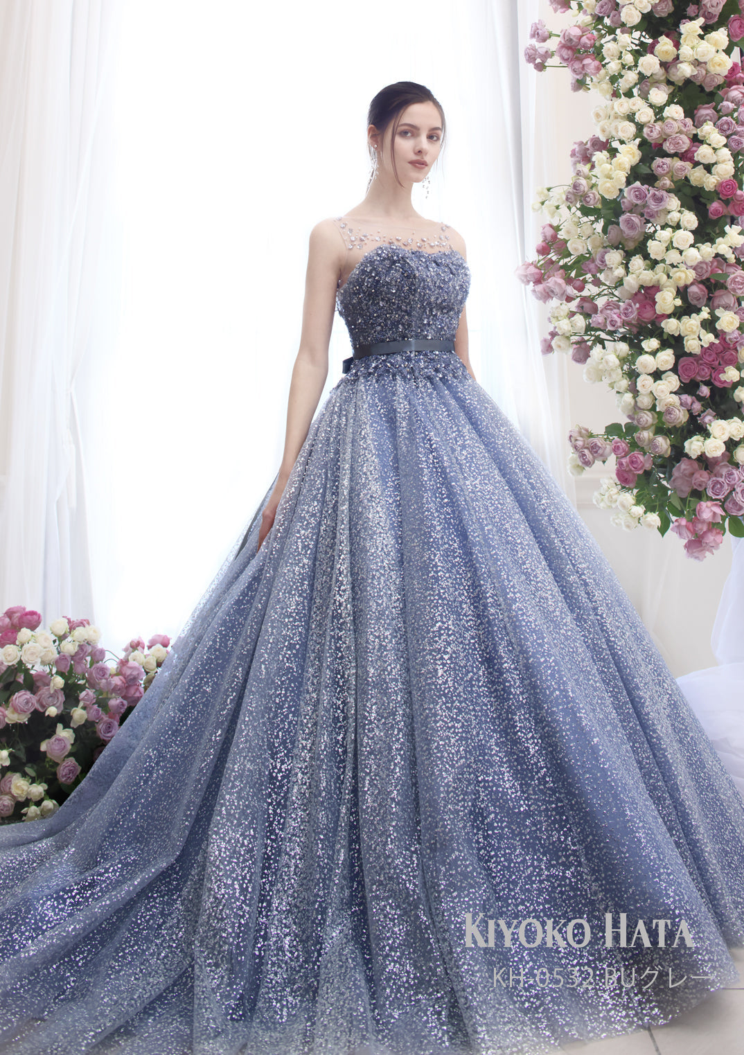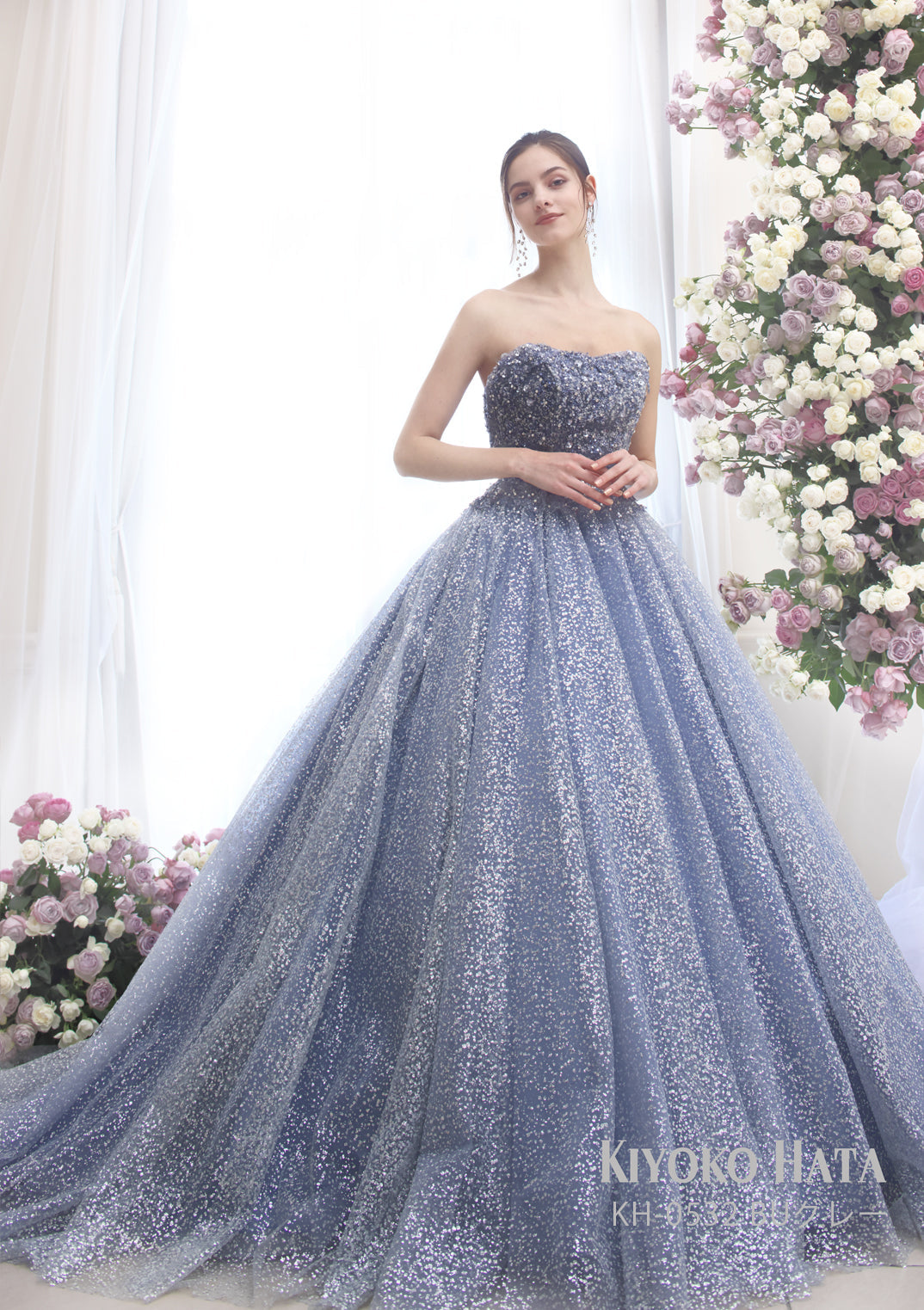 繊細で美しいインド製ビジューレースとグリッターの組み合わせで奥行きのある輝きがスパークルゴージャスを実現させました。大人エレガントな色合いとの相性が花嫁自身をドラマチックな宝石の様に煌めかせるプリンセスラインのドレス。ヨークは取り外せます。