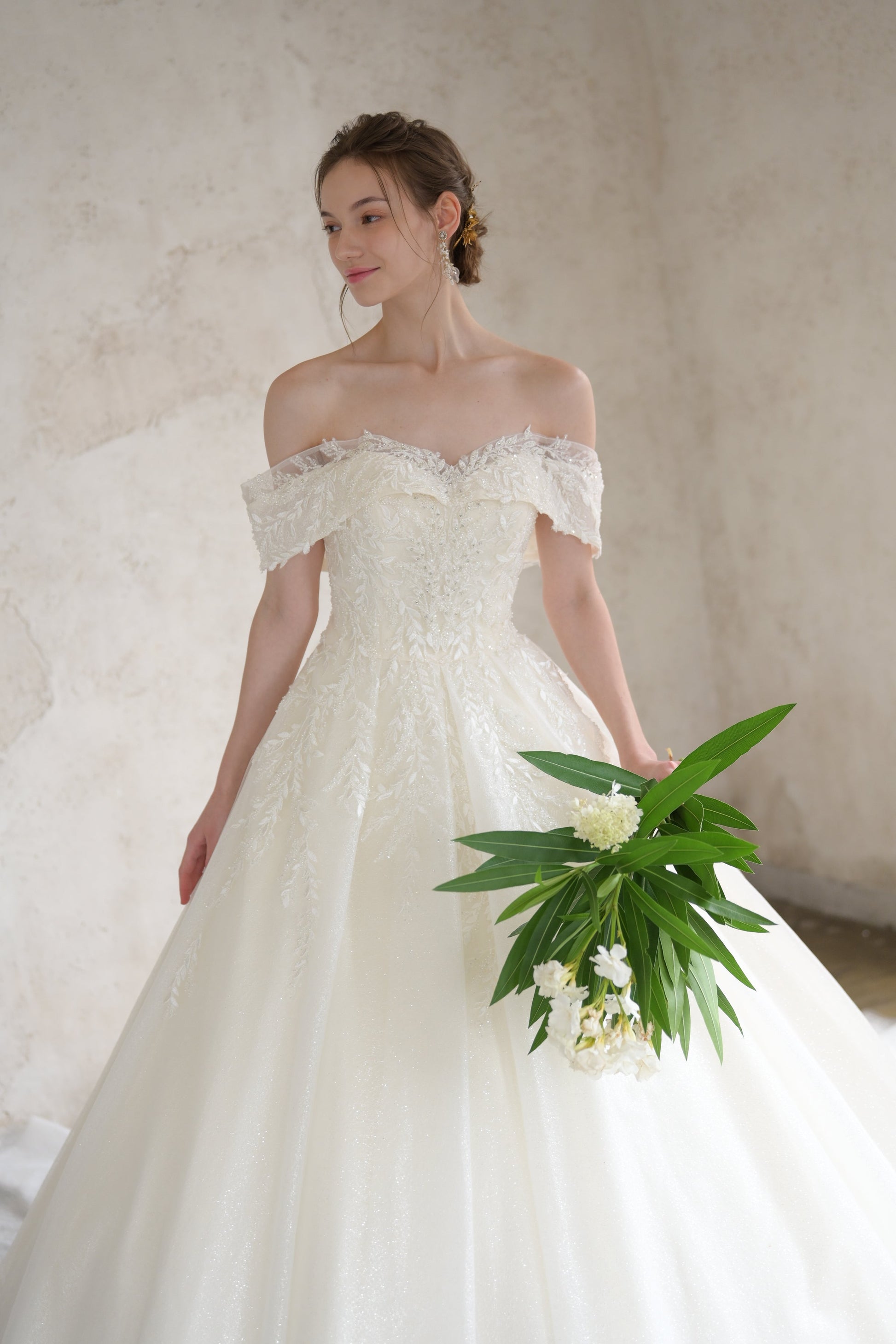すっきりと美しいシルエットに上品な煌めきが洗練された印象のドレス。全体に網目模様のチュールにグリッターを施した煌めきの素材を重ねて、輝きだけでなくハイクラスな質感を感じさせます。また、レースは繊細なリーフ柄に細やかなビージングをケープから流れるように施し、肩回りを透かせることで軽やかに、ハートネックラインが女性らしい一着。