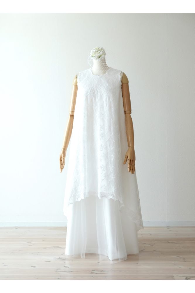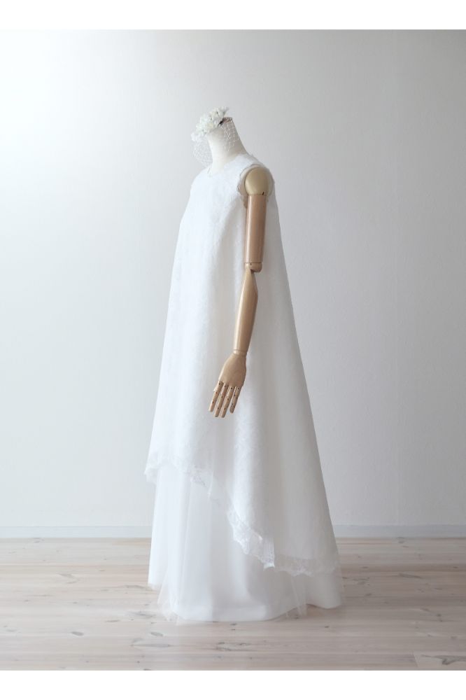 ドレスには珍しいテントラインのシルエットに、チュールのスカートを重ねています。