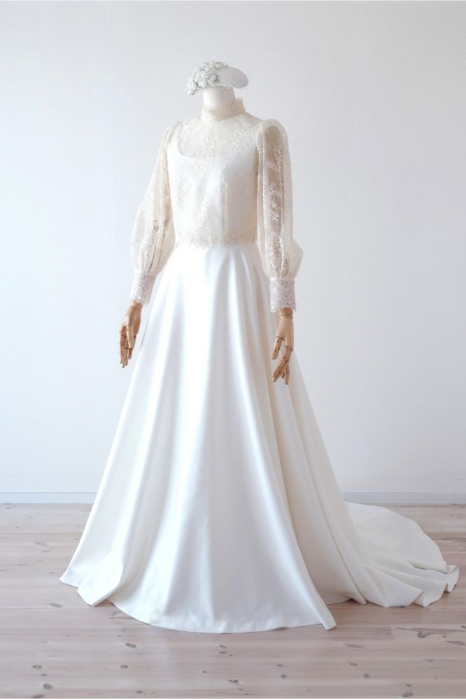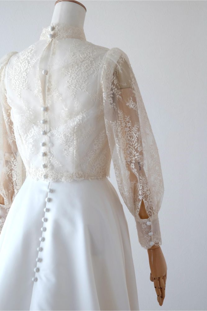 スタンドカラーの衿元、幅の広いカフスがクラシカルなボレロと、シンプルなドレスの2WAYドレスです。
