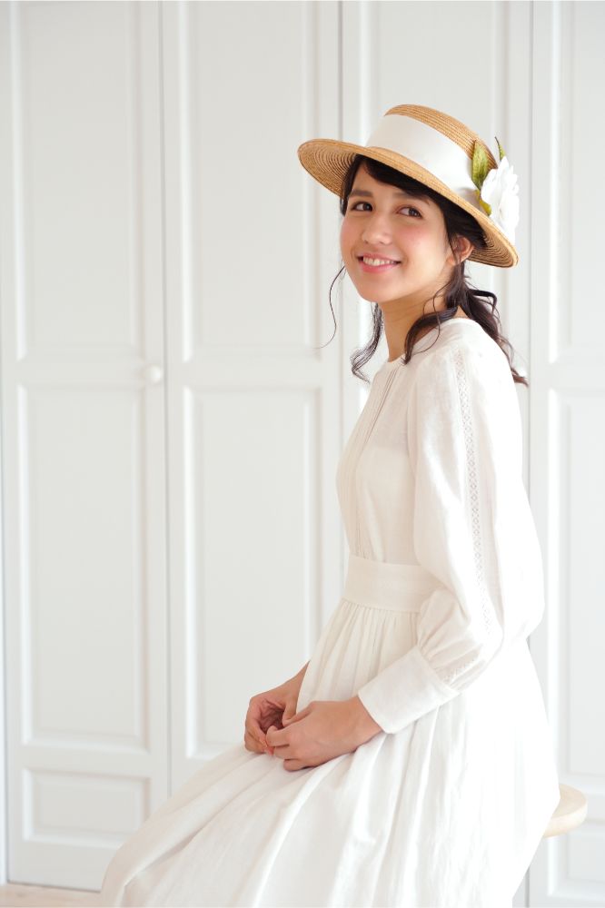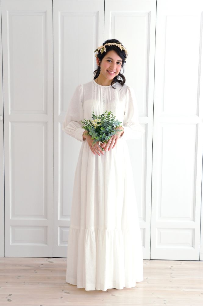 リネンに洗いをかけたナチュラルな素材を使用した、クラシカルなスタイルのドレス。
