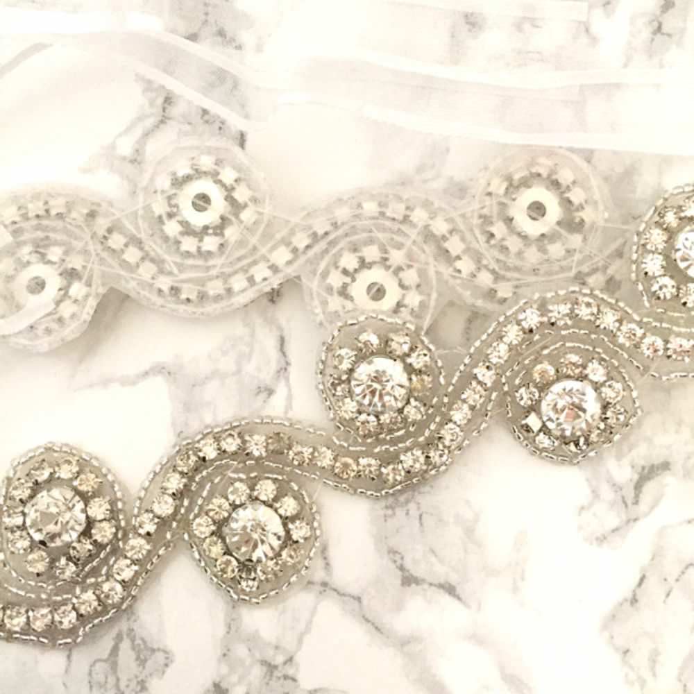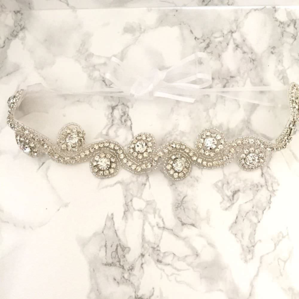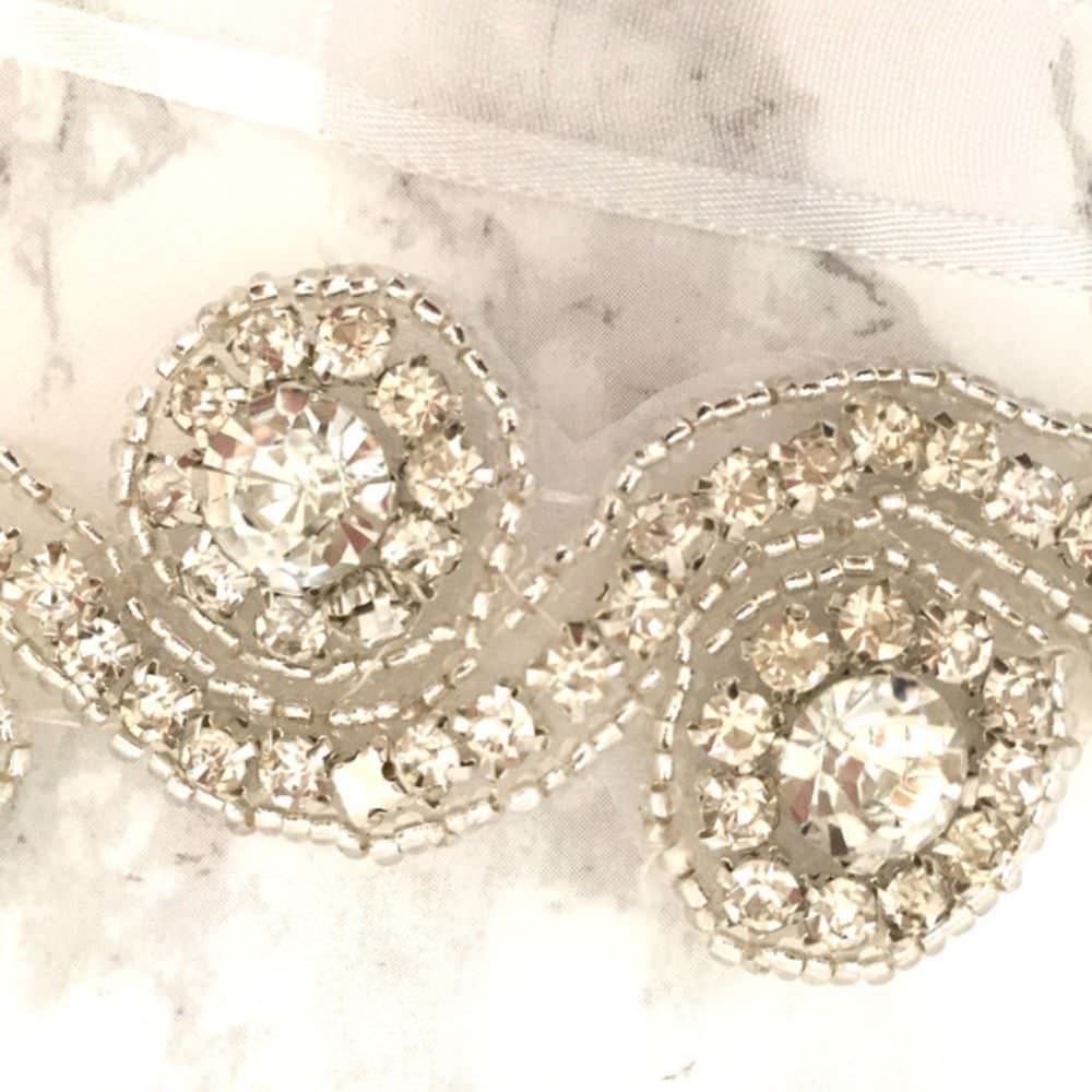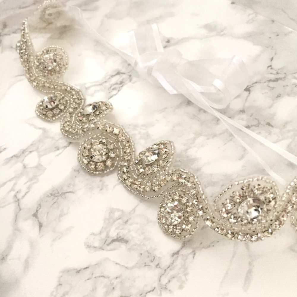 ビーズとストーンを縫い付けており、リボンで結ぶパターンで、使いやすいです。