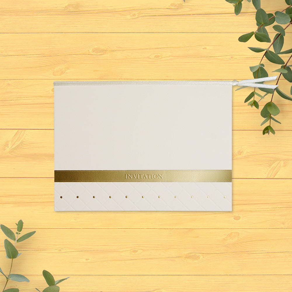 すそに施したキルティング風の模様が洗練された大人の雰囲気を醸し出します。リボンを思わせるシャンパンゴールドの箔押しは繊細で上品な光沢を放ち、ぬくもりのあるアイボリーの紙との相性も抜群です。パーティーをセンス良く彩るペーパーアイテムです。