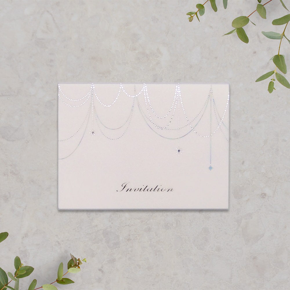 カバーと半透明スリーブの模様が重なった時に、1つの絵柄が現れる遊び心あふれるカードです。シャンデリアのように輝く模様はシルバーとレインボーの2種類の箔を贅沢に使用し、ウェディングらしいきらびやかな印象に仕上がっています。清楚なイメージのアイボリー。