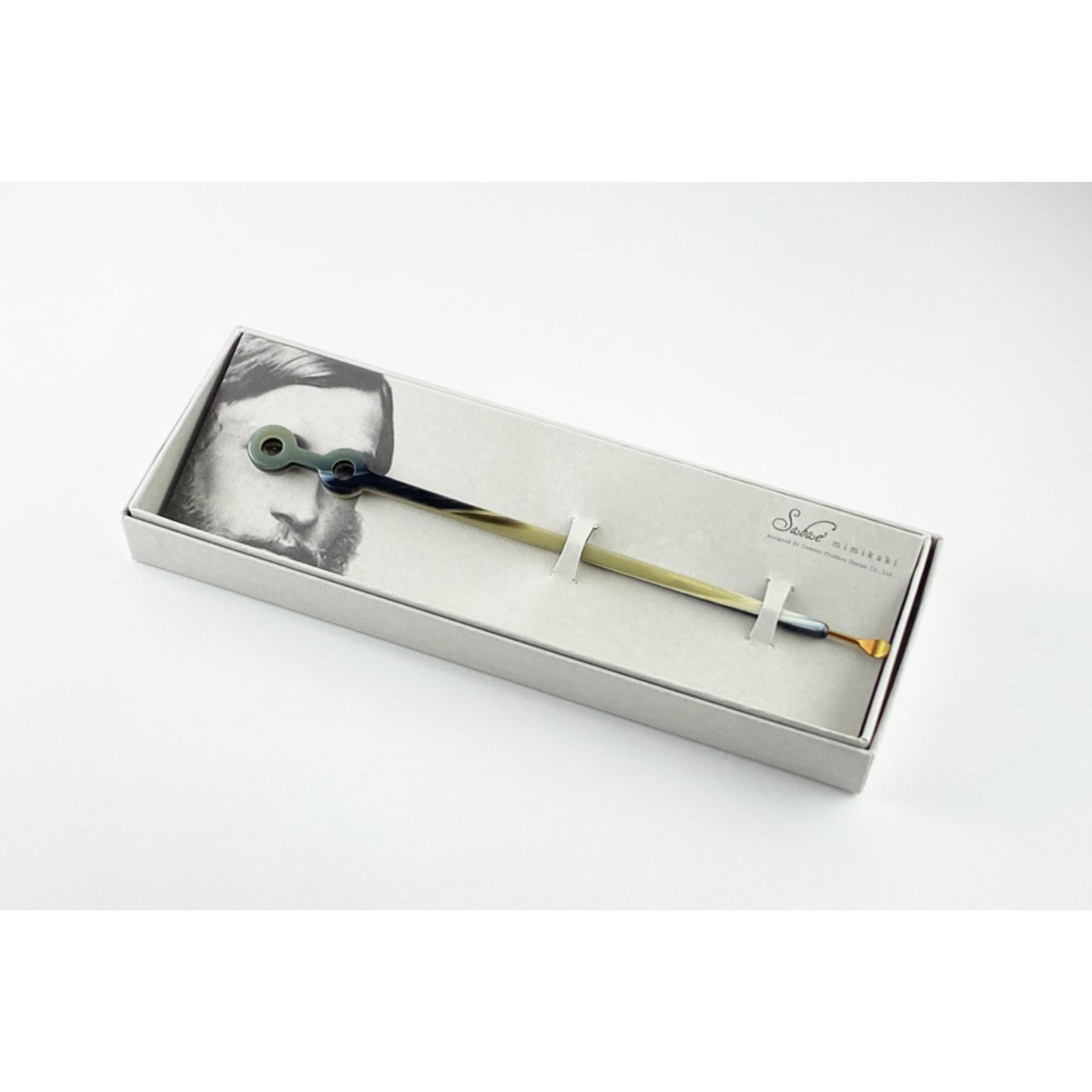 素材が持つ独特のカラフルさに、先端部に高級感のあるチタンを組み合わせました。セルロースアセテートは、弾力性・吸湿性で人体との親和性も良い素材特性をもち、 ミミカキ先端部には、高級感のあるβチタンを組み合わせています。 チタンの特性であるアレルギーがない、錆びない、軽いに加え板バネと呼ばれるほど バネのように弾力があります。先端部分のチタンはセルの種類によって色を変えています。 みみかき好きの方から掻きやすい角度を伺い、調整、決定したこだわりの角度です。