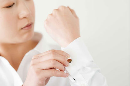 結婚式などのフォーマルの装い、昇進祝い、ギフトにおすすめです。 セルロースアセテートを使った今までにないカフスは、独特の存在感があります。押し込むだけで簡単に装着でき、金属製のものよりも軽めの印象となっているので、カフスボタンのビギナーにもオススメ。貼り合せたアセテートシートをカフスの形に削り出す技術には、日本の職人技が光ります。 ジャケットの袖口からちらりと覗く煌めきは、ついつい眼がいってしまうさりげないお洒落心を感じさせる。 特に袖口を折り返して二重になったダブルカフスは、通常シングルタイプのものに比べとてもお洒落で、留めるなら断然こちらの方がお似合い。さりげなくキラリと光るカフスで、今までになかった手元のオシャレをお楽しみください。