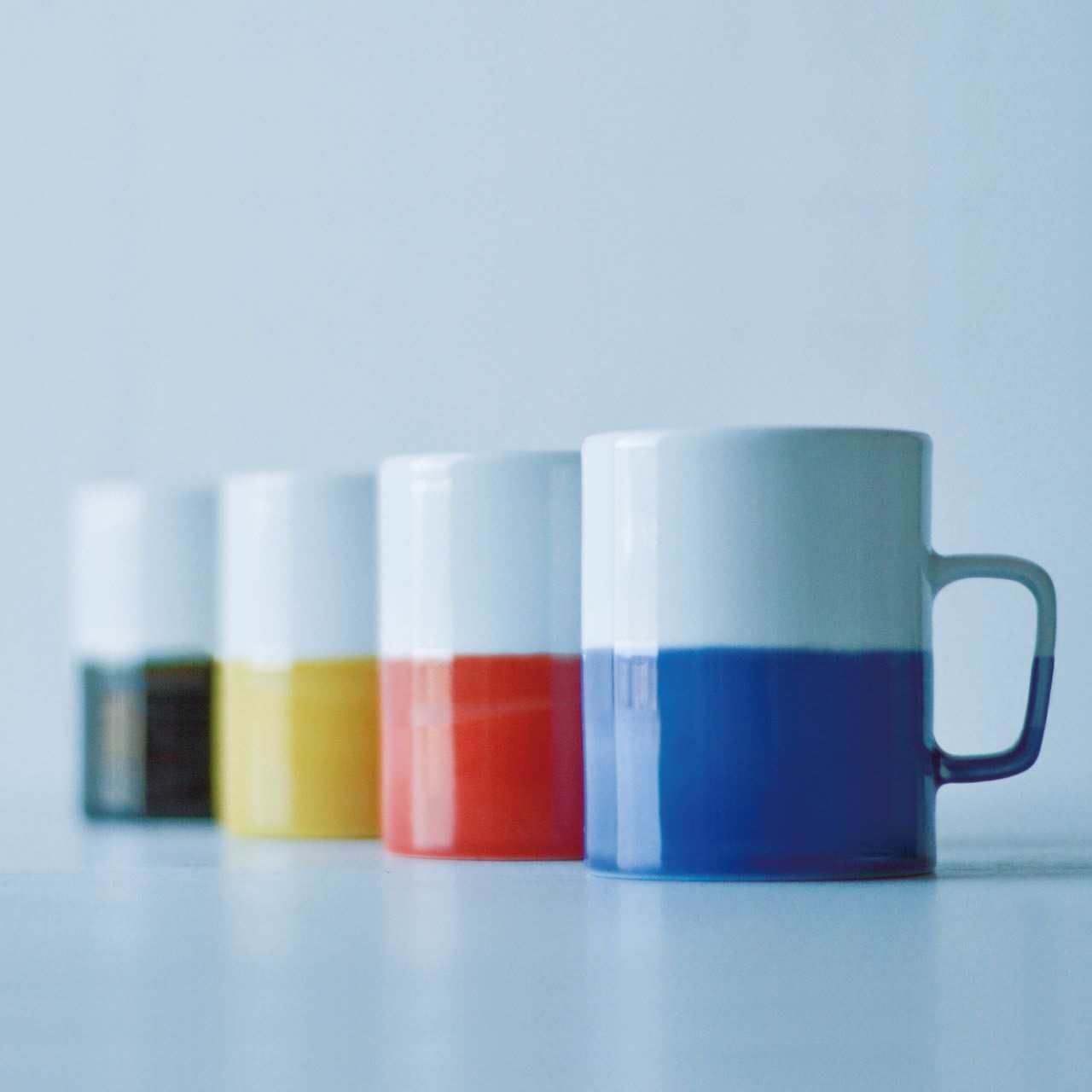 「かけわけ」という伝統的な手法で、上下半分ずつ異なる釉薬を施したマグは、境目部分のニュアンスに、手仕事ならではの味わいが感じられます。機能性にもすぐれており、軽くて持ちやすく、円柱のフォルムには安定感があります。