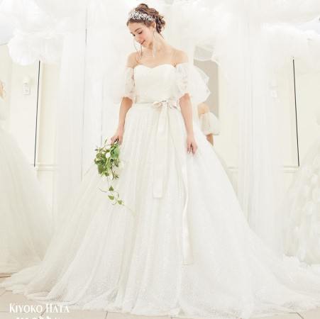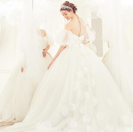 クリスタルのように輝くグリッターをびっしり敷き詰めトレーンにはお花が施されています♡パフスリーヴもお好みでご利用頂けます♪
