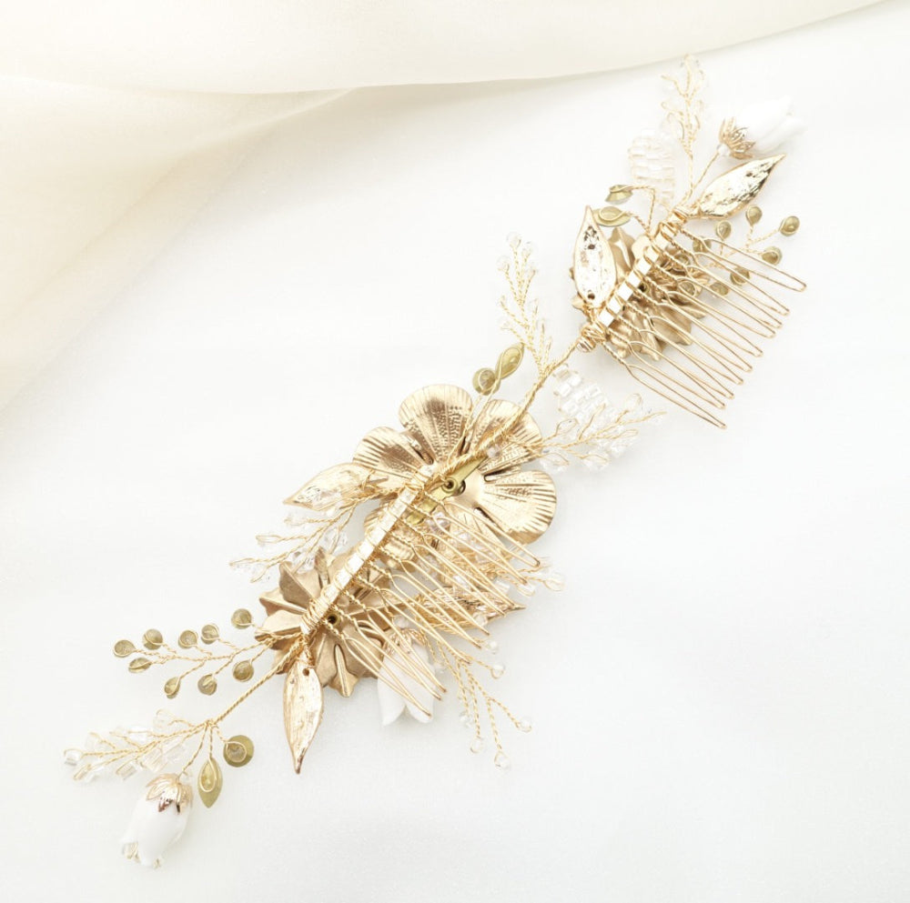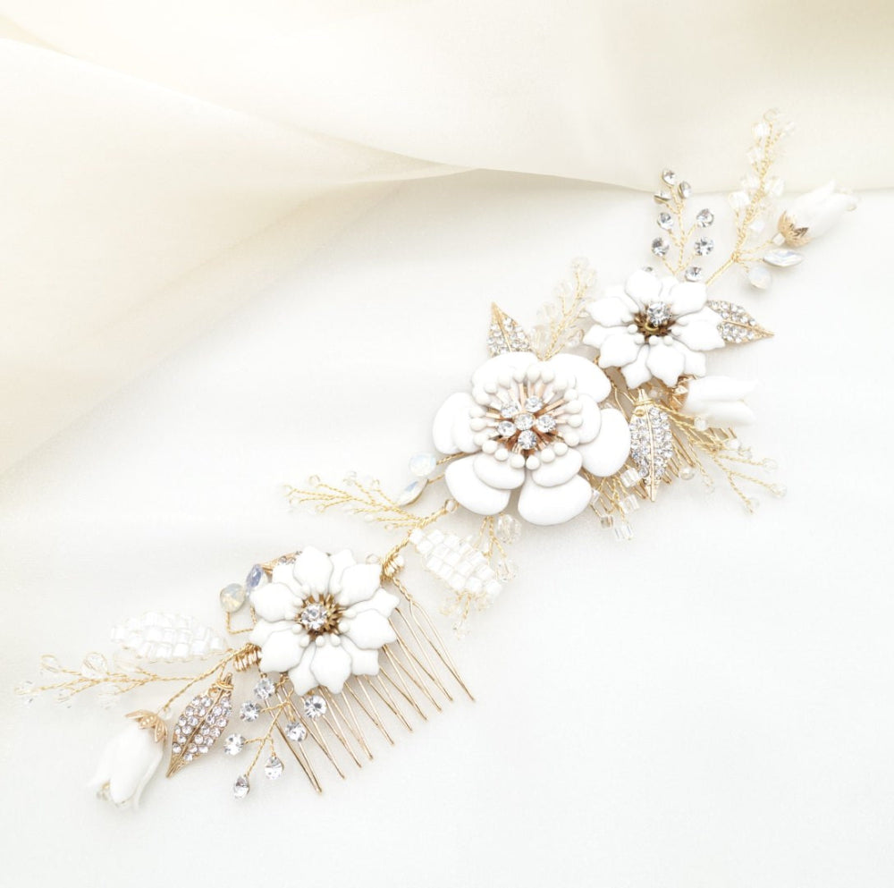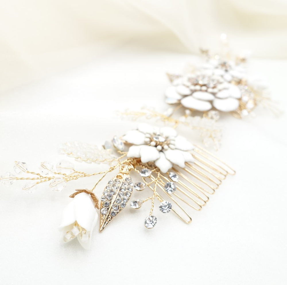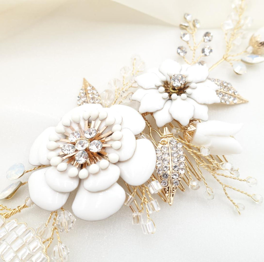 ホワイト樹脂塗料でコーティングされた大きなフラワー(大・中)、樹脂の蕾フラワー(小)、ラインストーンが埋め込まれたリーフ、ビーズやラインストーンの小枝ヘッドドレス。