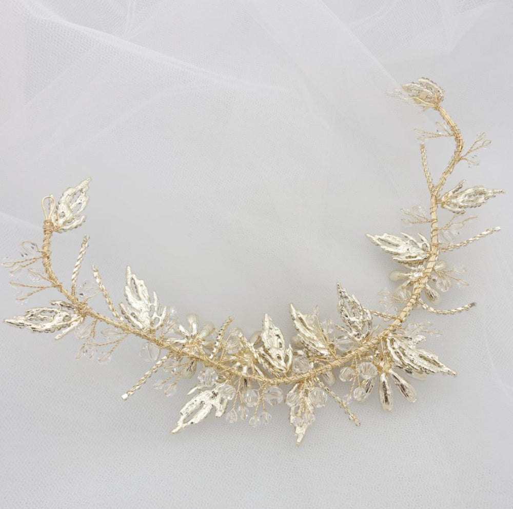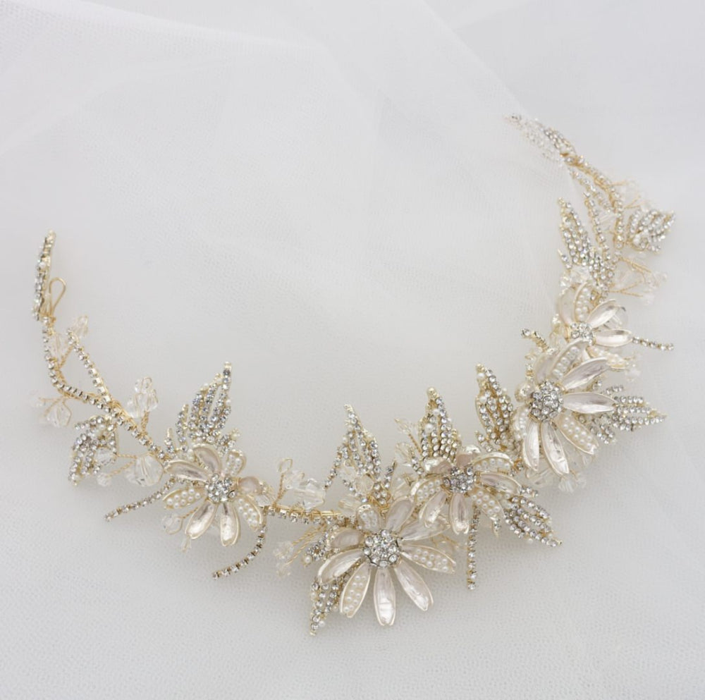 デイジーフラワーとリーフモチーフのヘッドドレス。