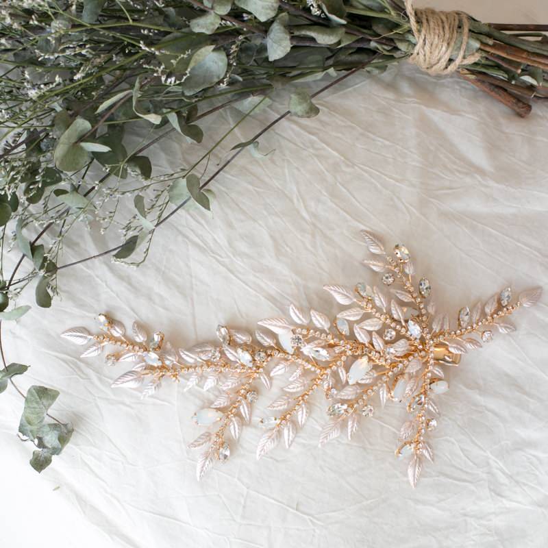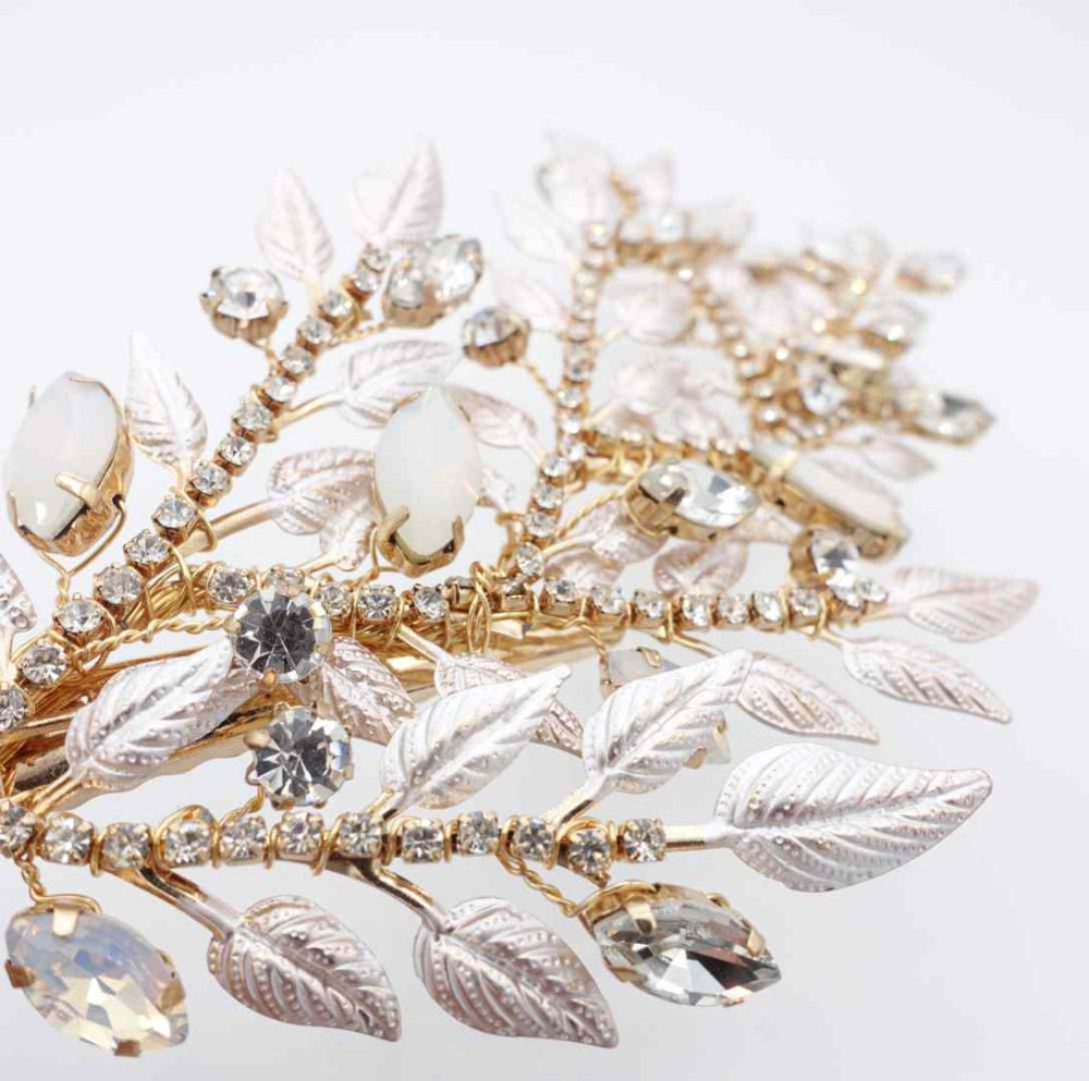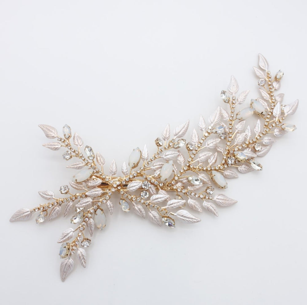 枝部分に縁どられたビジュー。大中小粒のクリアストーン、乳白色系のストーンのリーフが程よく施されております。
