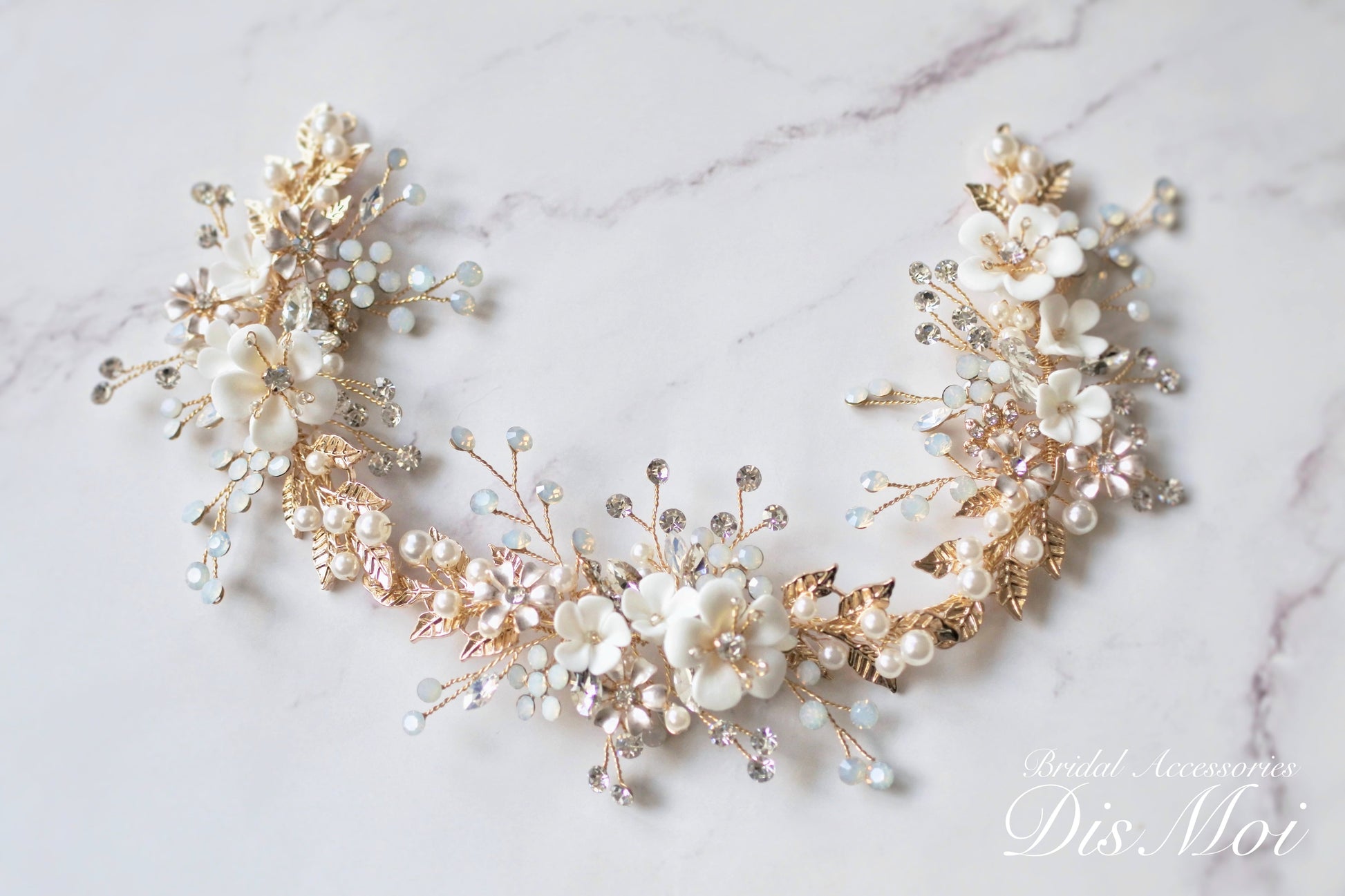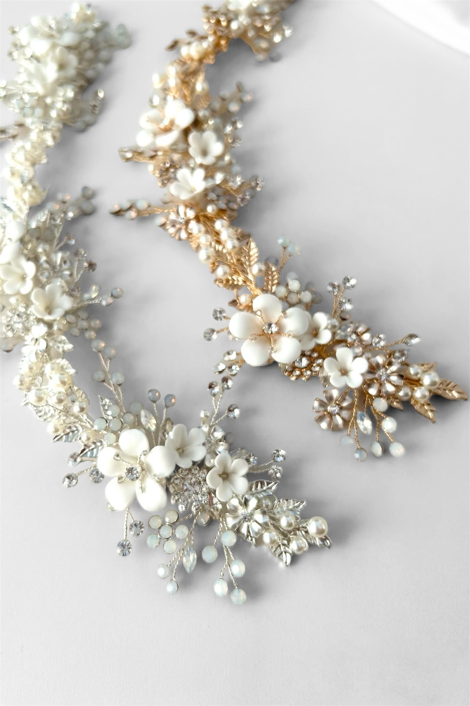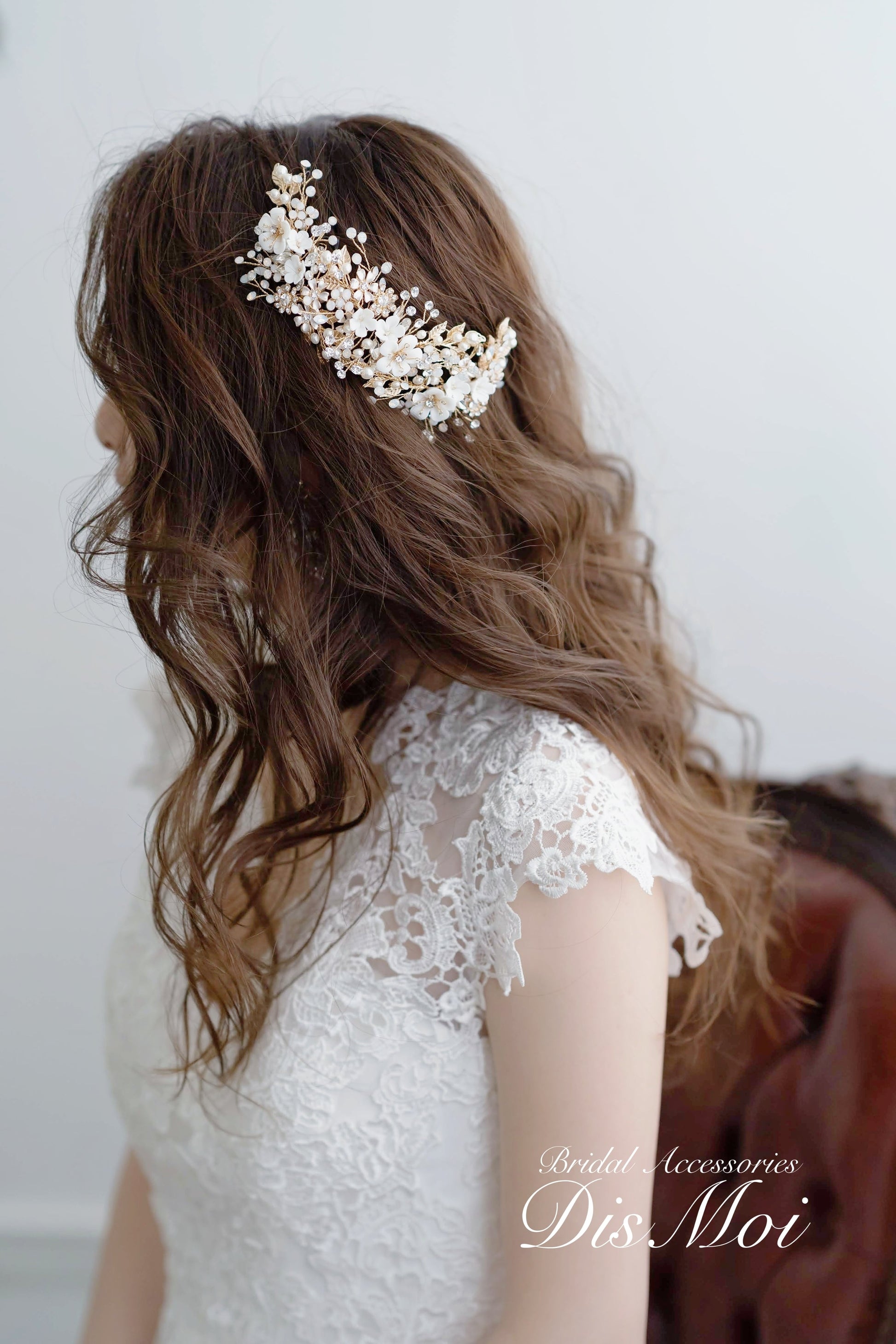華奢なワイヤーに編み込まれたパールやクレイフラワーモチーフがエレガントな小枝アクセサリーです。