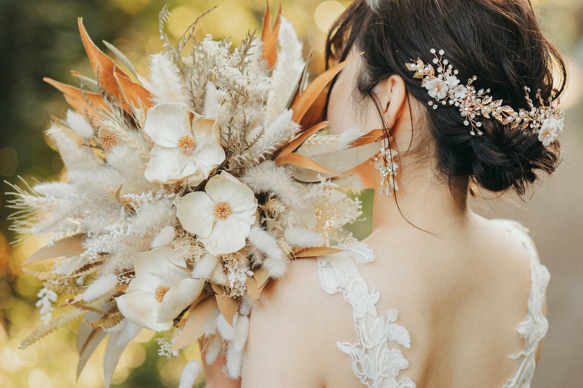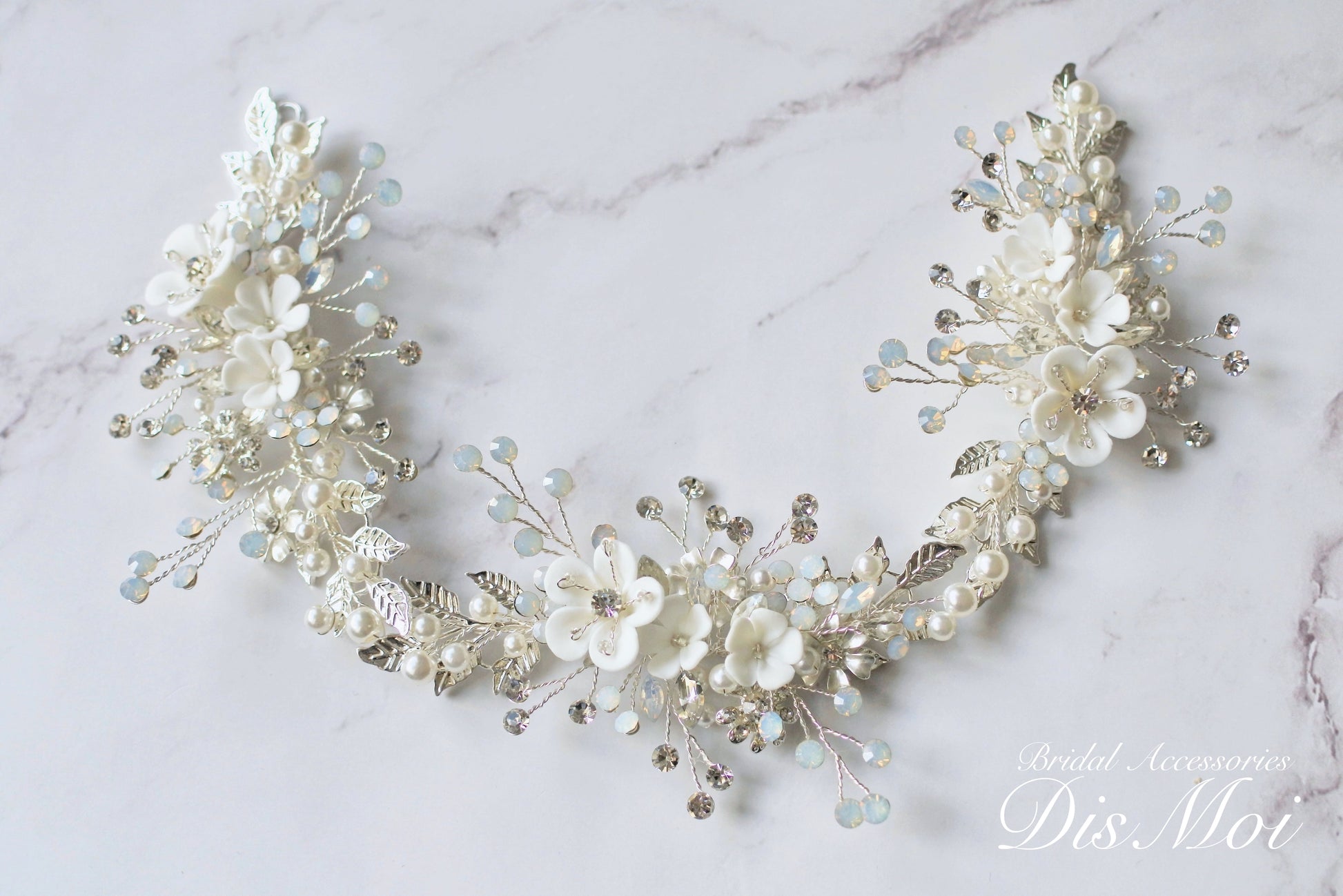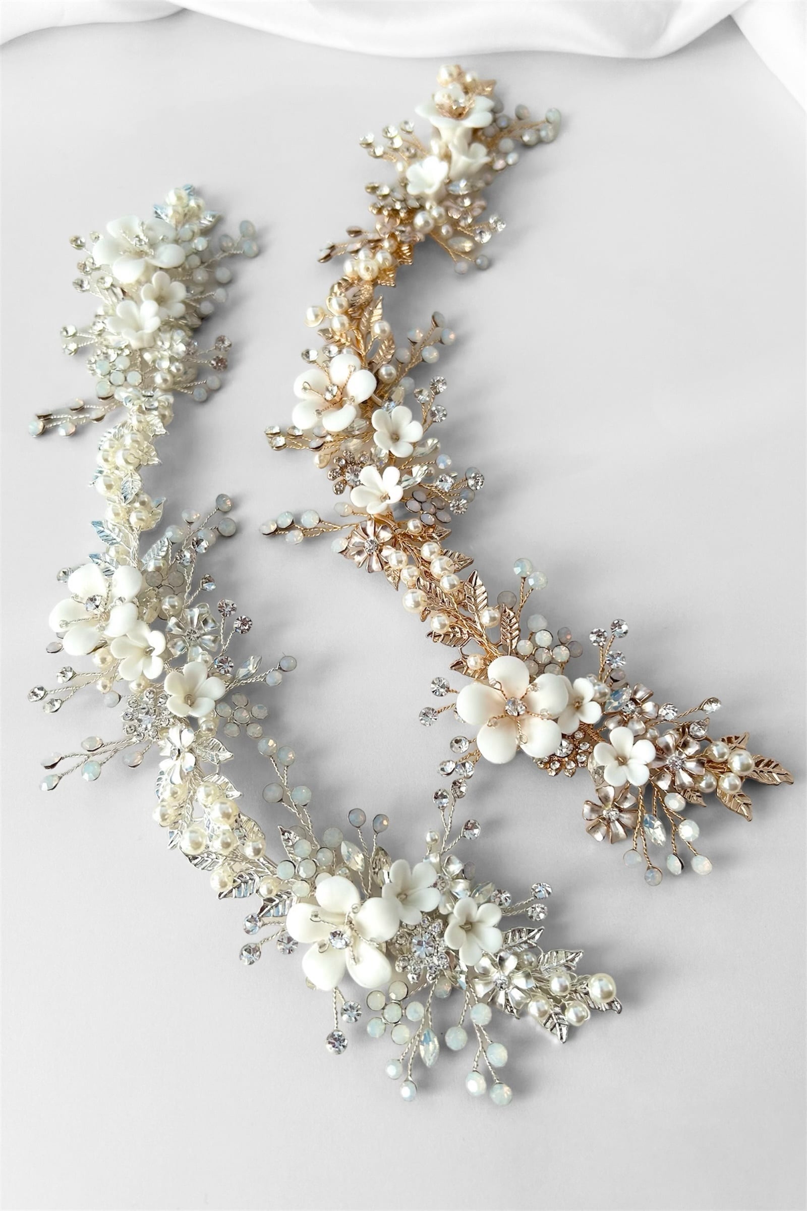 華奢なワイヤーに編み込まれたパールやクレイフラワーモチーフがエレガントな小枝アクセサリーです。