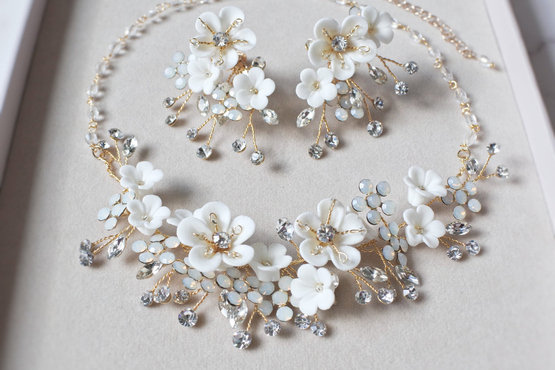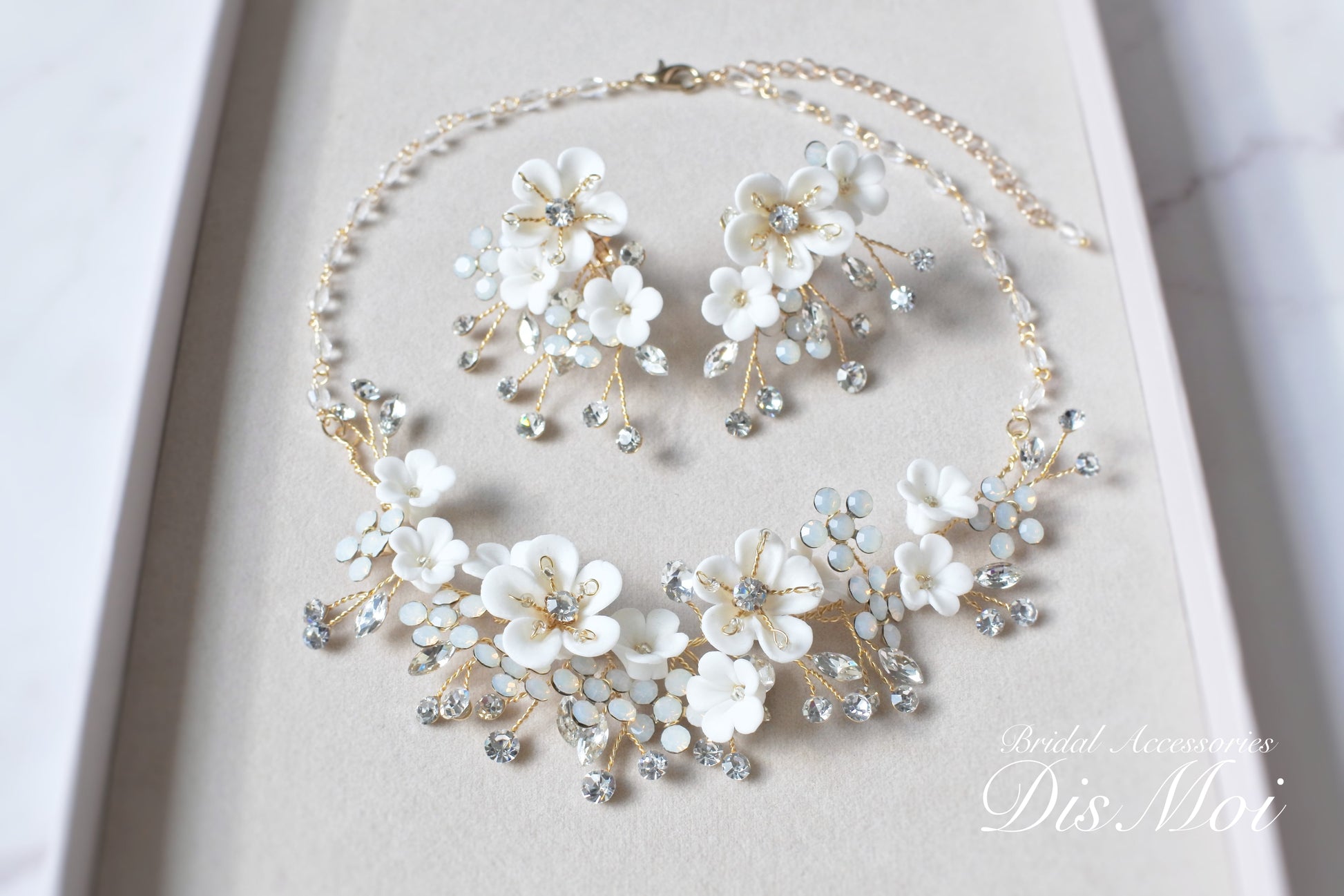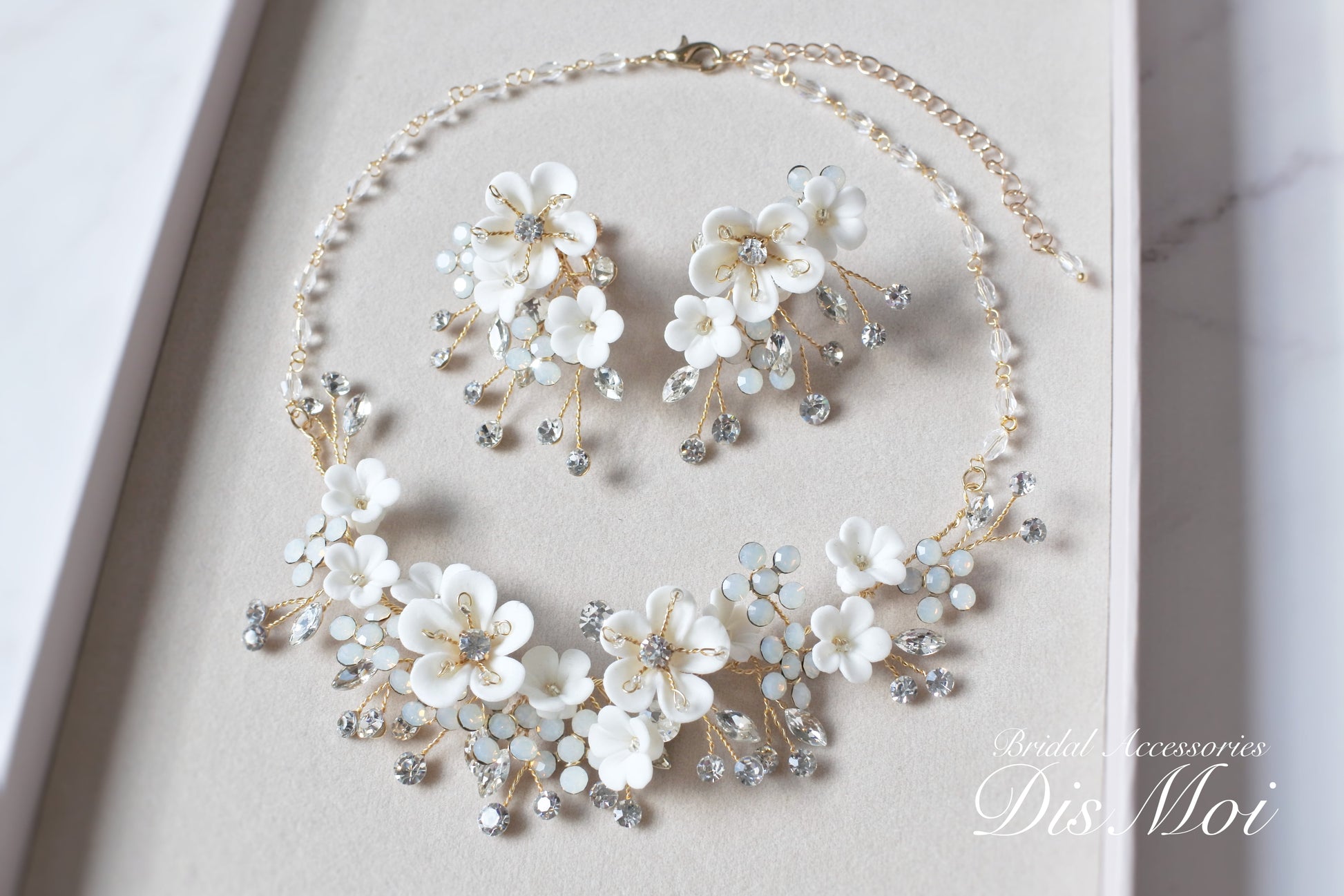クレイフラワーのネックレスとイヤリングのセットです。