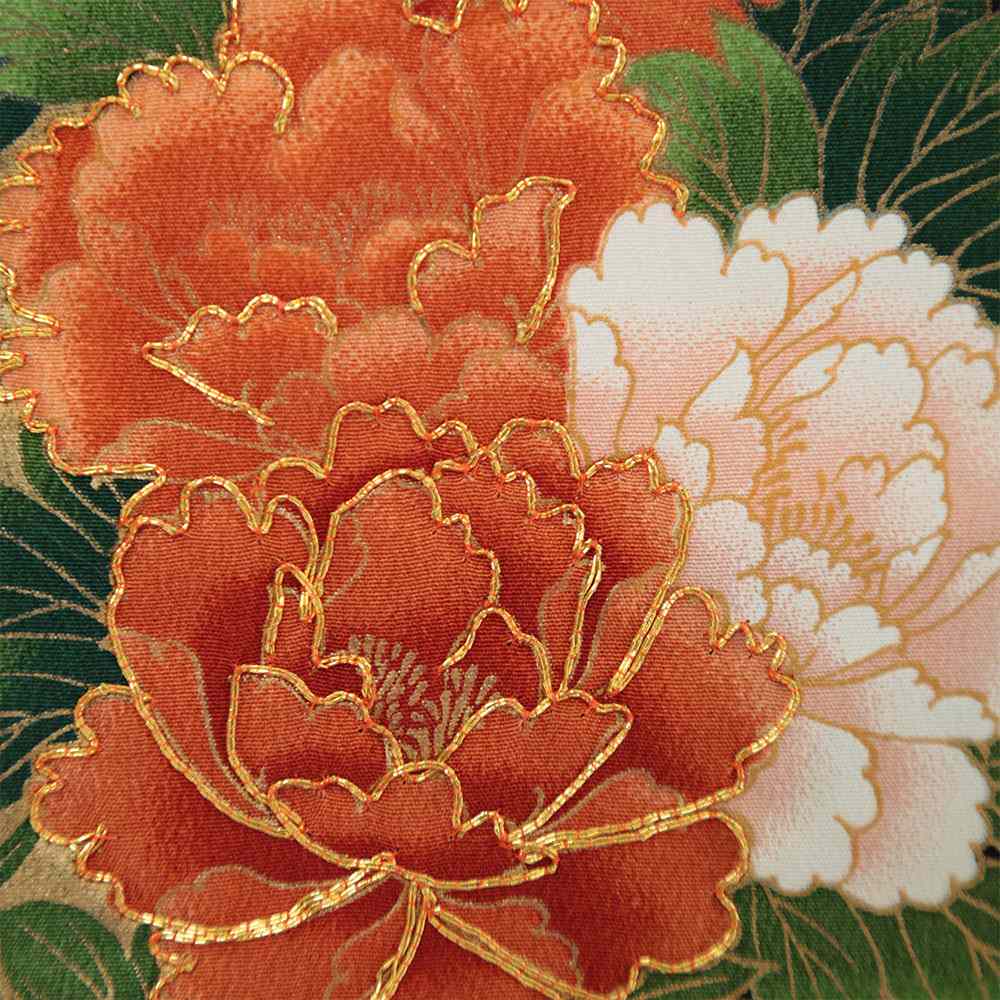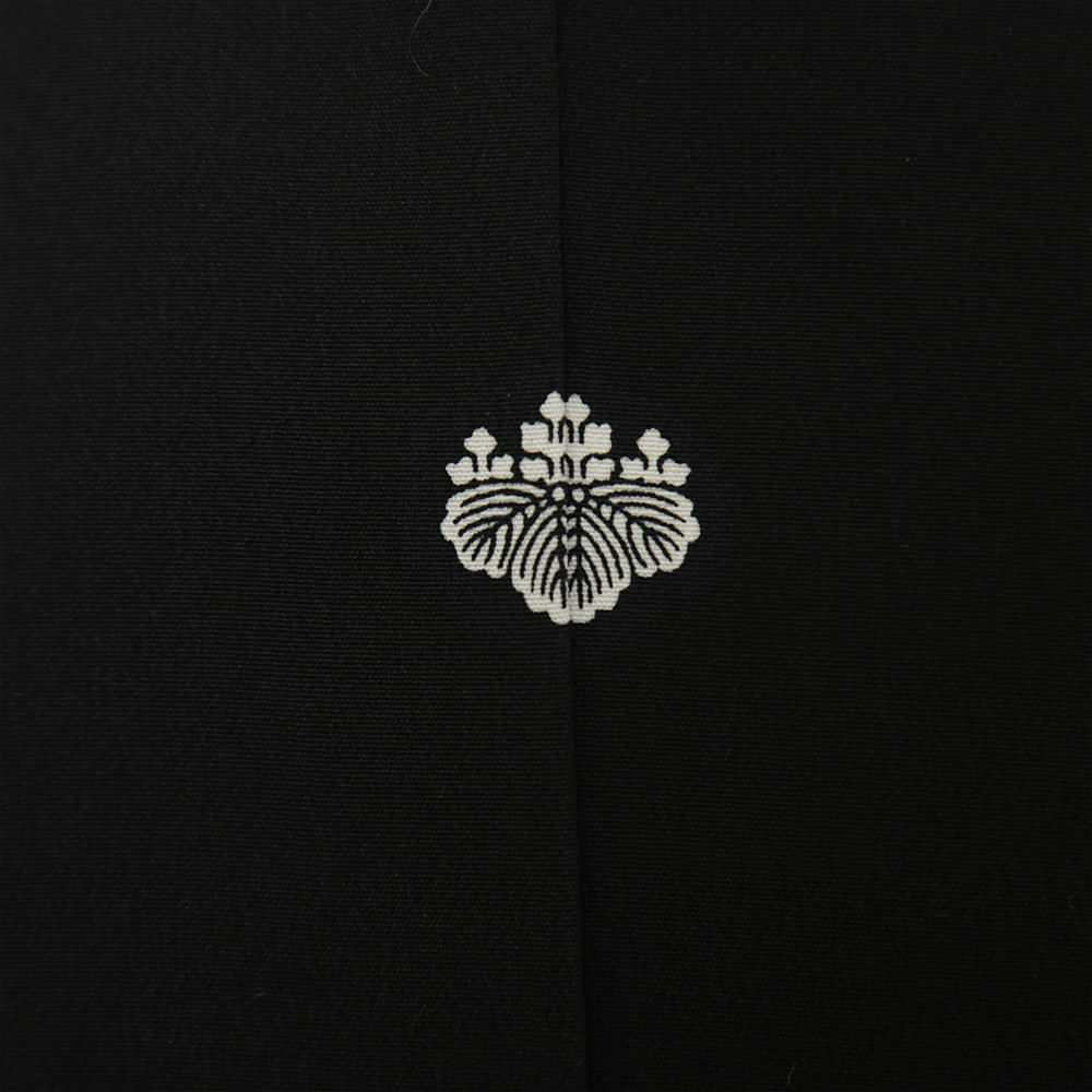 飴色と琥珀(コハク)色のぼかしに沿うように、一部金駒刺繍を施した花の丸文や地紙文・熨斗などがあしらわれた華やかかつ上品な一枚。五三の桐の五ッ紋入り。