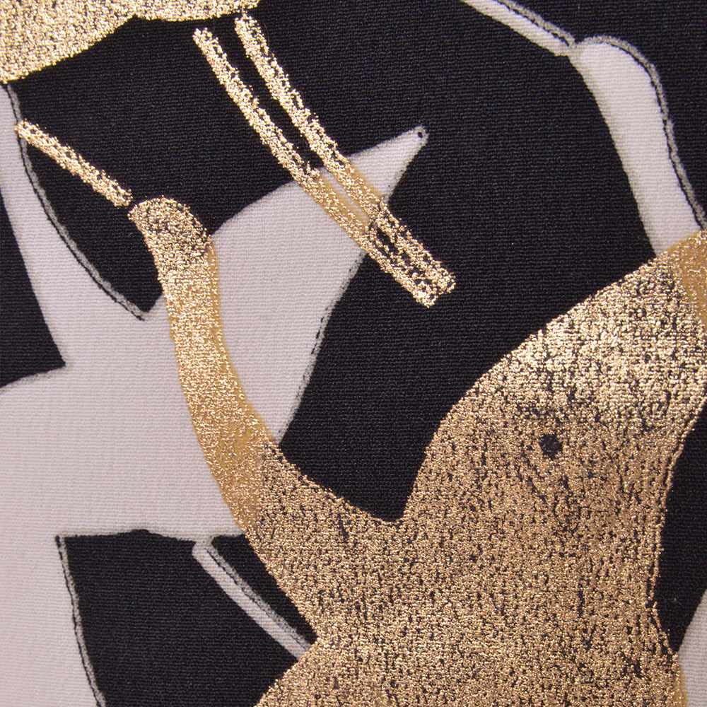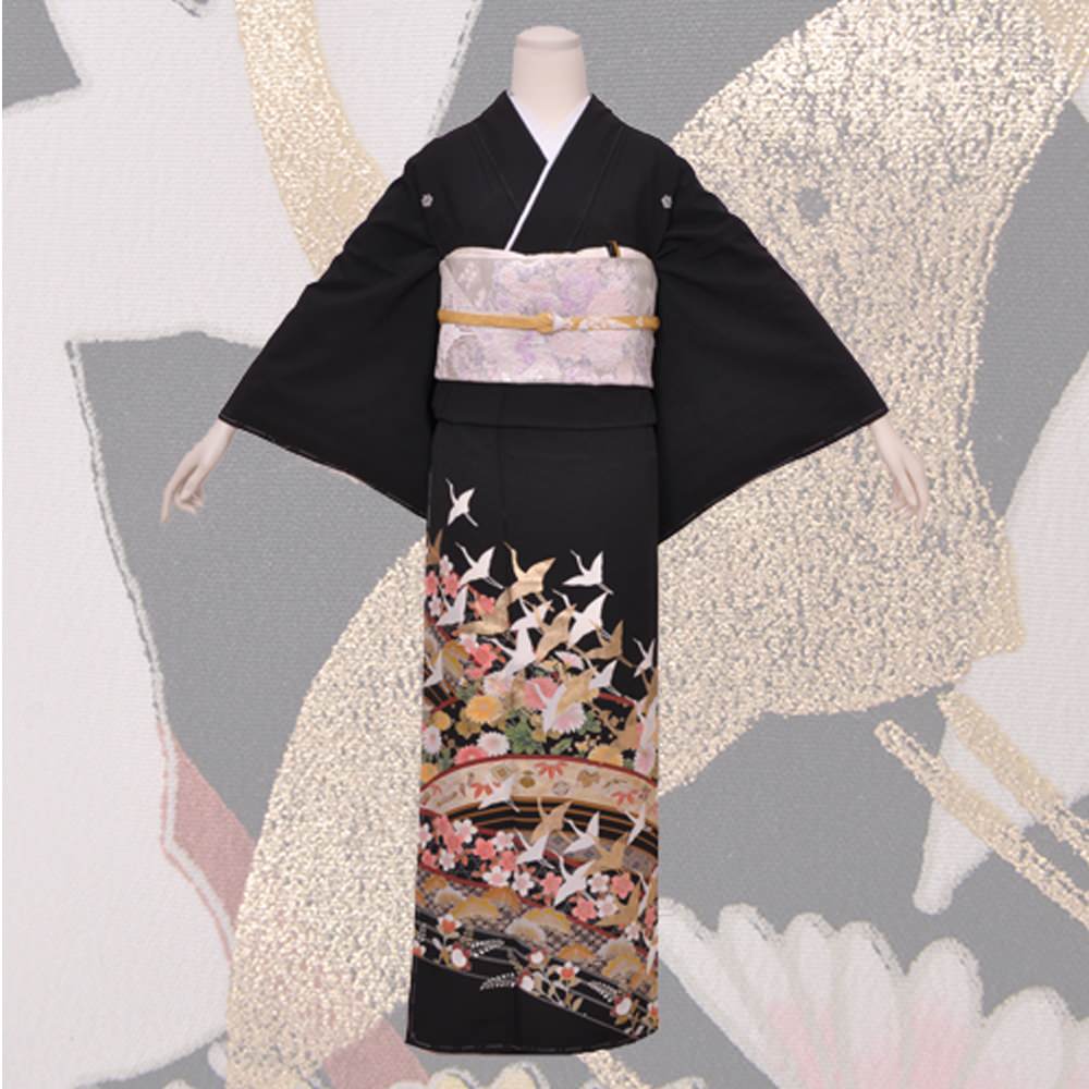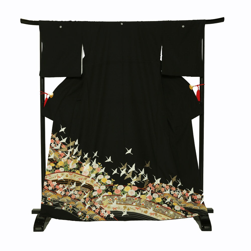 ブランド『H・L』の一品。四季草花や吉祥文様があしらわれた裂取りの周りに、箔置きの飛鶴が描かれた華やかな一枚。五三の桐の五ッ紋入り。