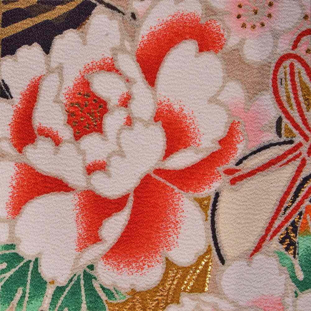 ブランド『H・L』の一品。格天井などがあしらわれた道長取りに沿うように、扇文や松や藤などの四季草花が配された上品な一枚。五三の桐の五ッ紋入り。