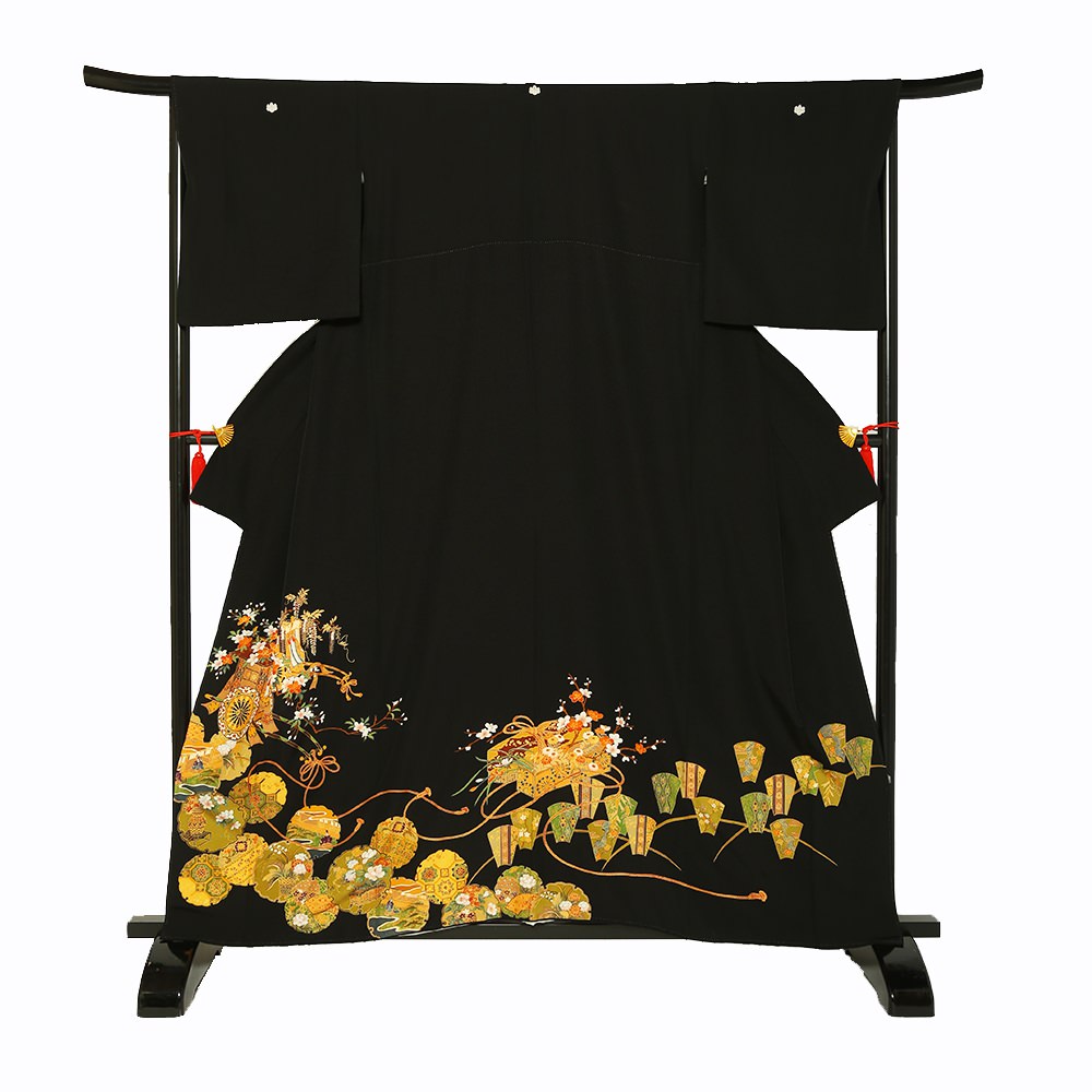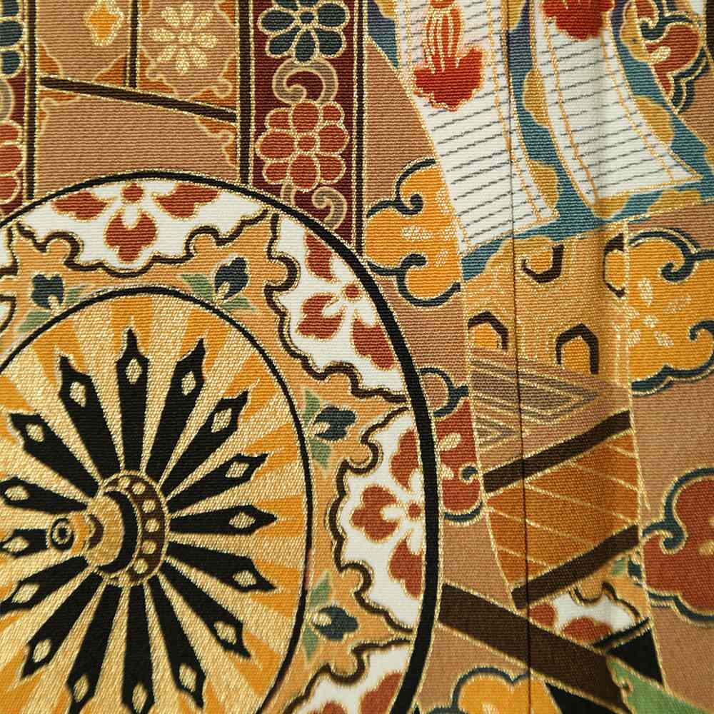 藤や桜などをあしらった御所車や文箱の下に、蜀江文や物語文を描いた雪輪が配された古典的な一枚。五三の桐の五ッ紋入り。