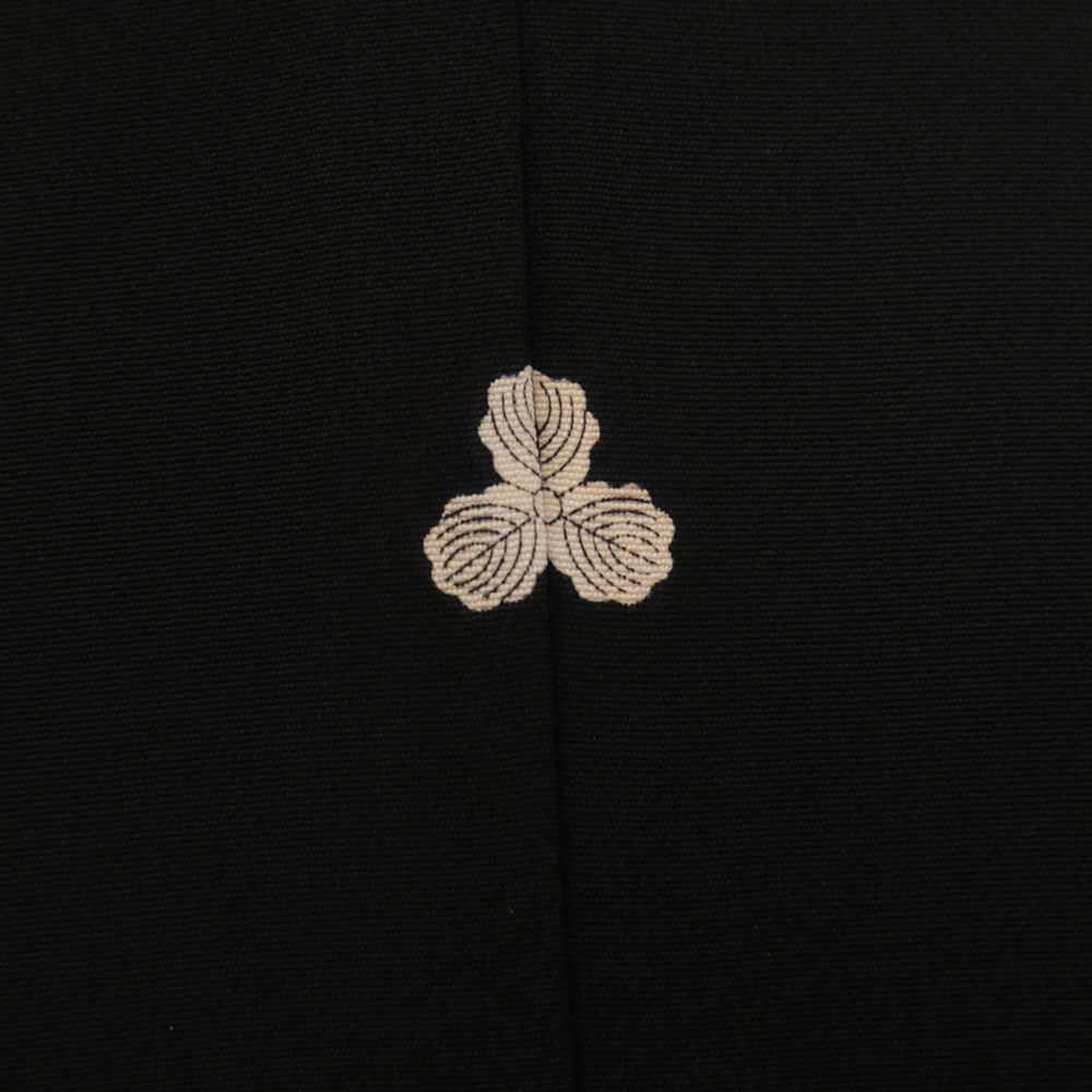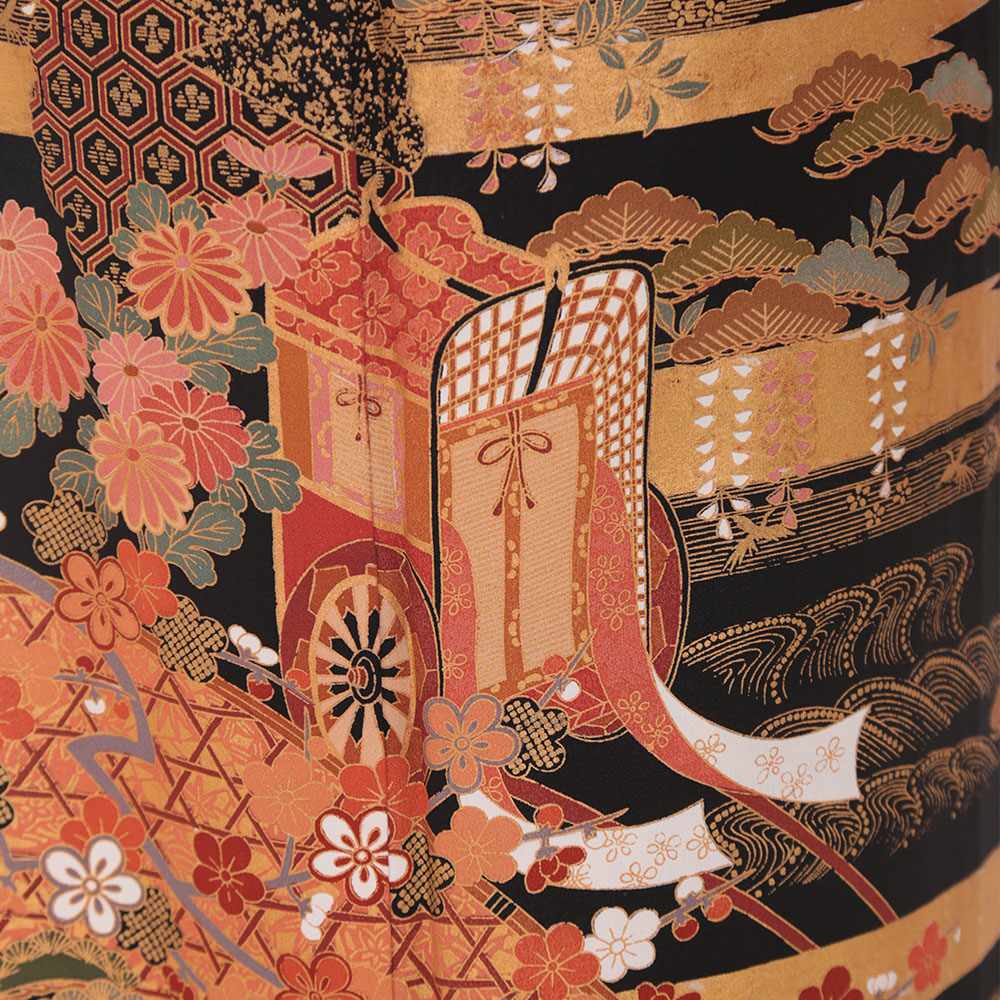 金の縁取りが施された籠目に松や梅、菊、藤、御所車が配され、霞模様や波模様があしらわれた上品かつ落ち着きのある一枚。三つ柏の五ッ紋入り。