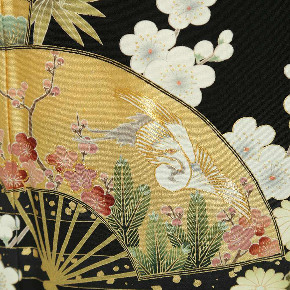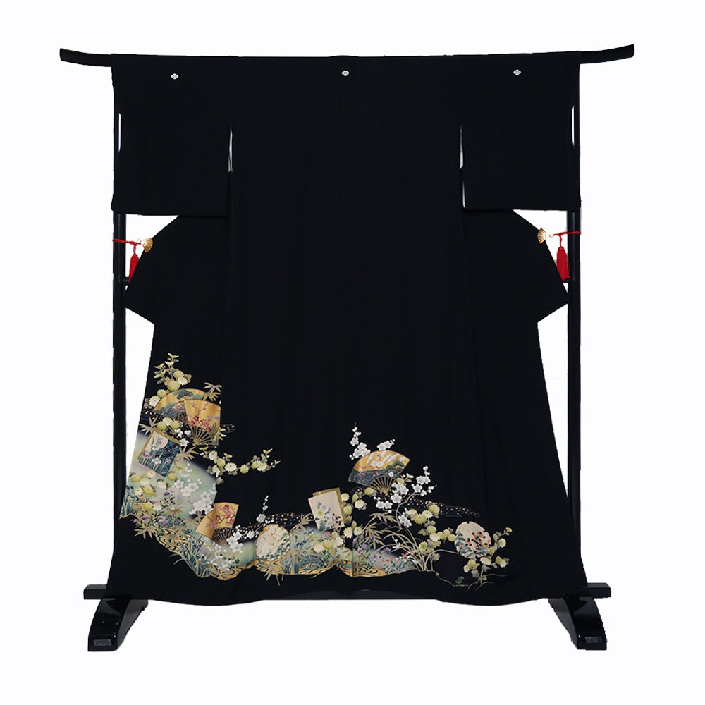 流水に杜若があしらわれた淡い色合いのぼかしに沿って、箔置き加工や一部金駒刺繍を施した扇文や色紙・雪輪が配された華やかかつ上品な一枚。木瓜の五ッ紋入り。ワイドサイズ。
