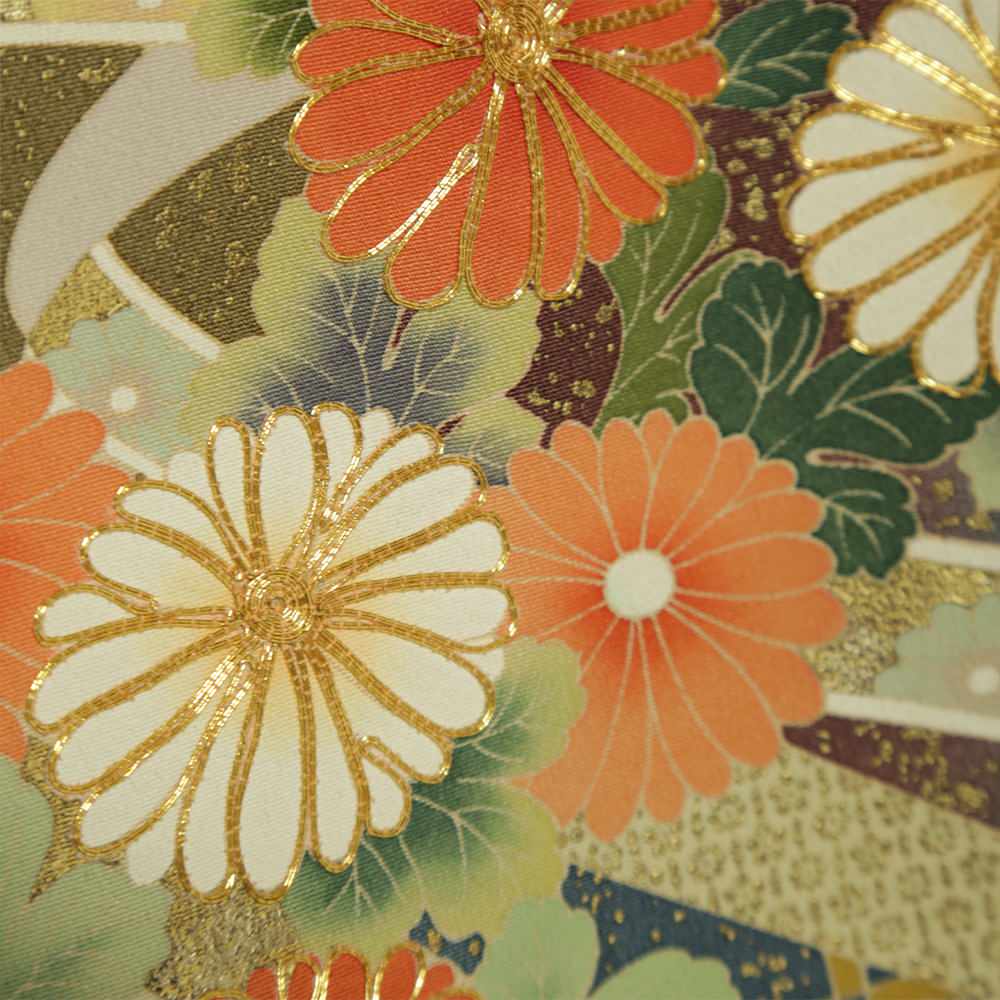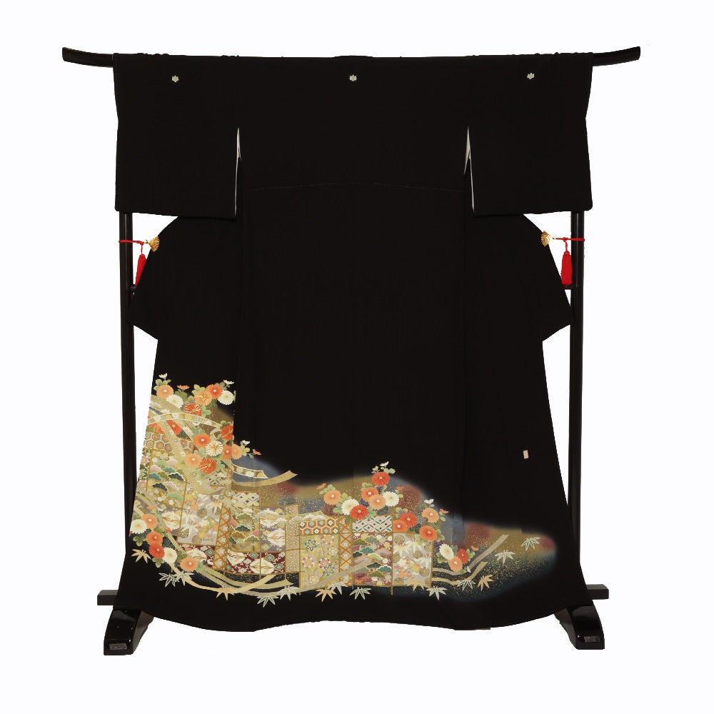 作家物の一品。金砂子を鏤めたぼかし内に、松竹梅などの吉祥文様をあしらった格子や熨斗が描かれ、一部金駒刺繍を施した菊が配された古典的かつ華やかな一枚。五三の桐の五ッ紋入り。