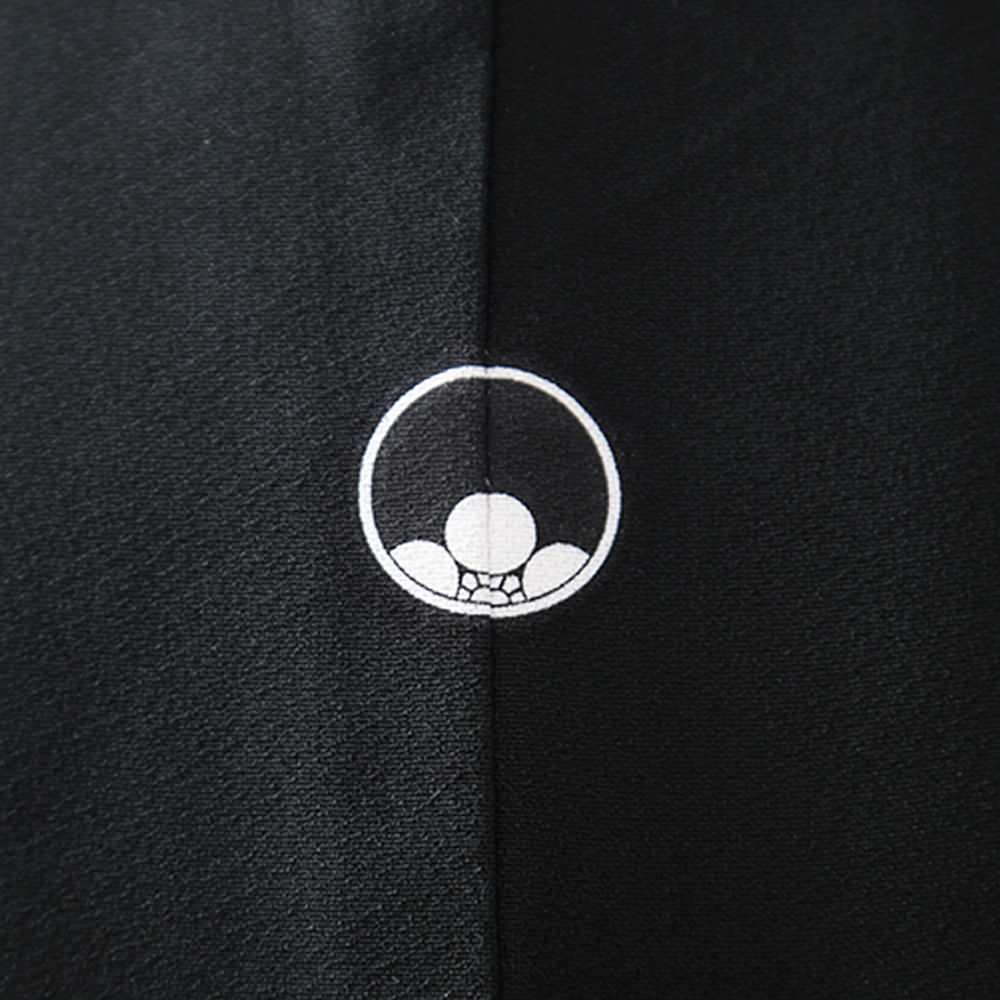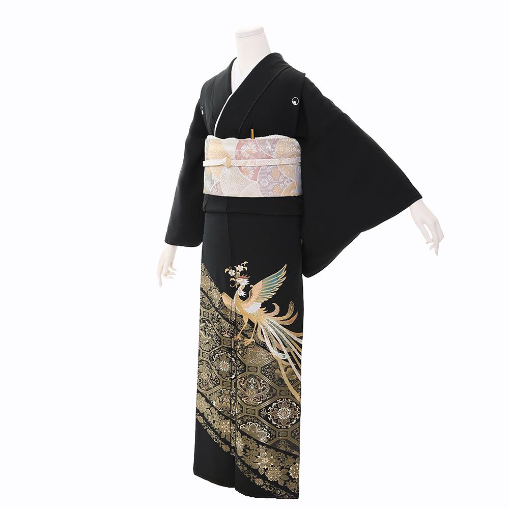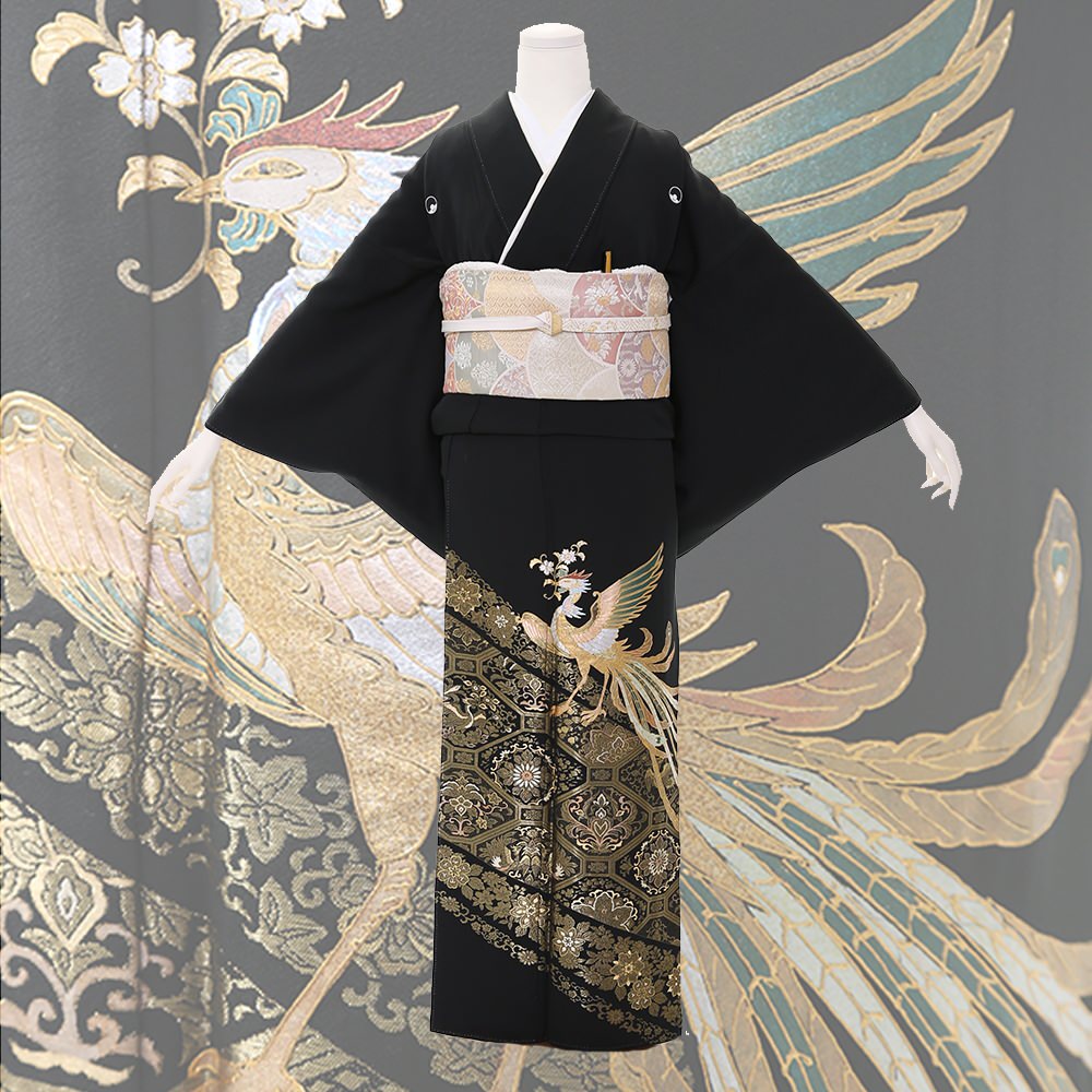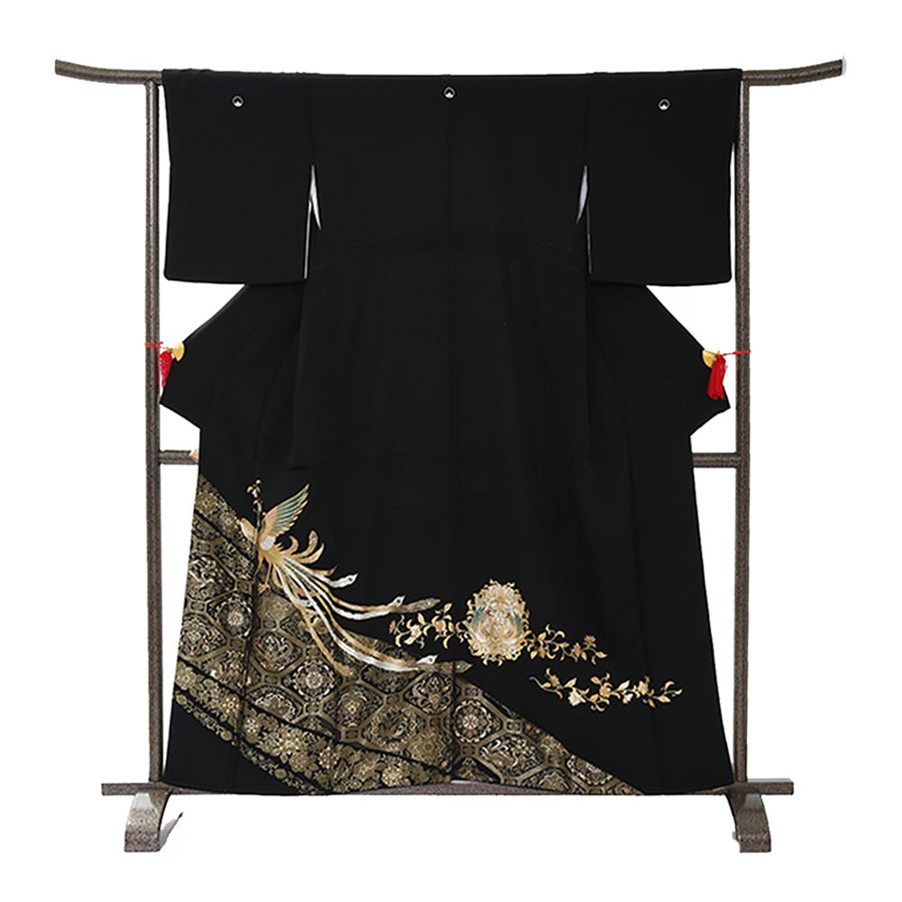 金彩加工を用いて大胆に花を咥えた立鳳凰が配され、斜め格子に有栖川錦文様や宝相華が描かれた気品ある一枚。糸輪に覗き梅鉢の五ッ紋入り。