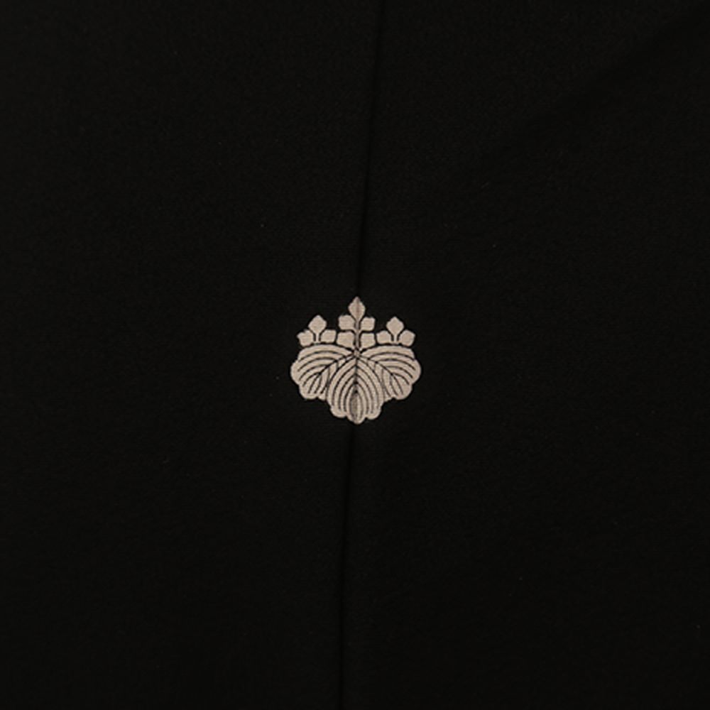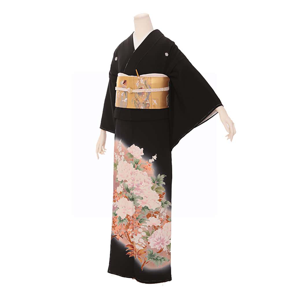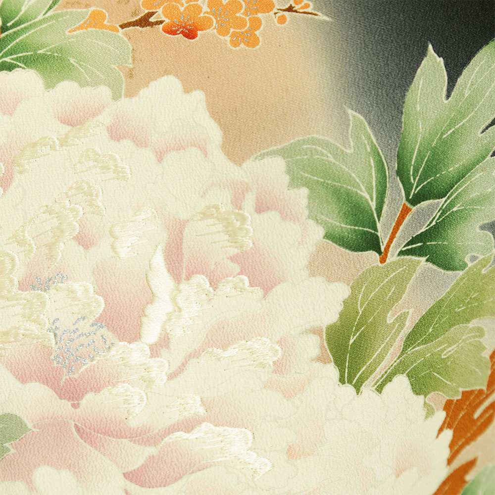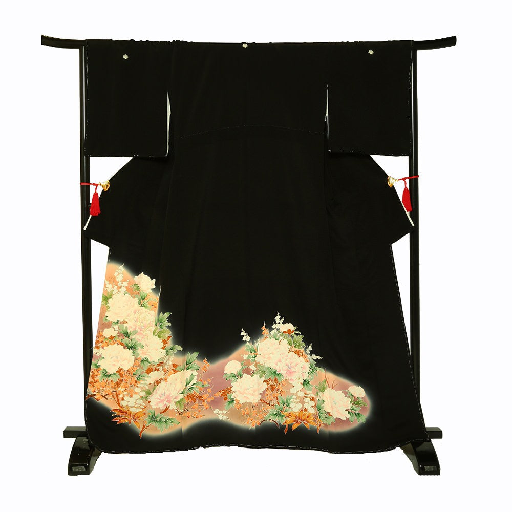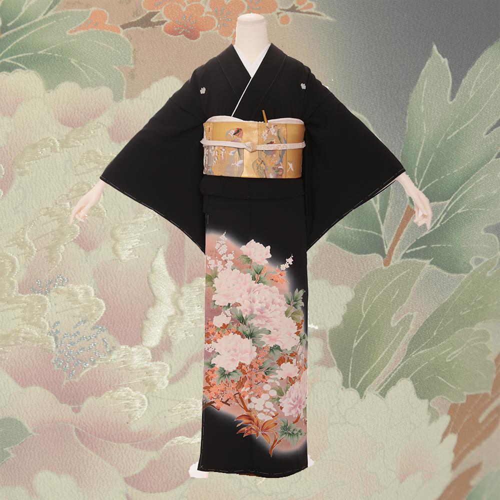 霞に菊、梅、刺繍を用いた大輪の牡丹が描かれた上品な一枚。五三桐の五ッ紋入り。