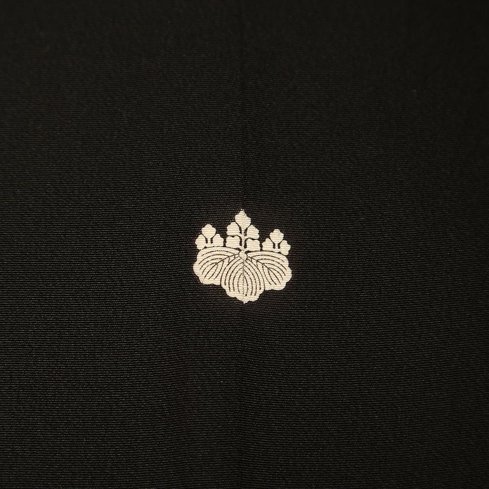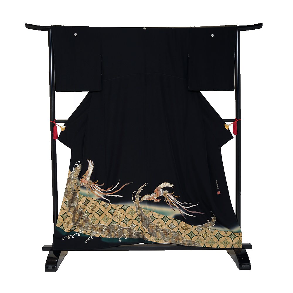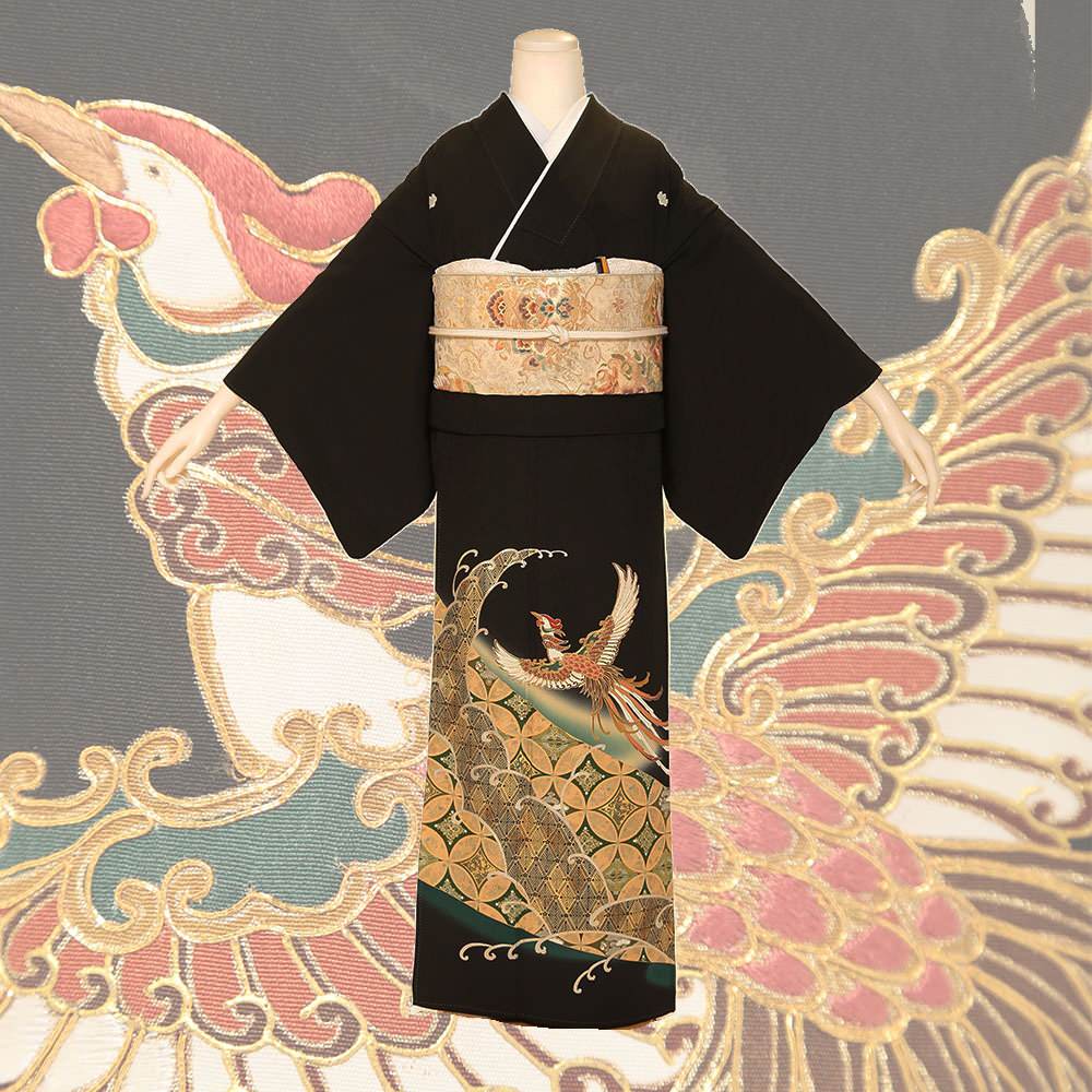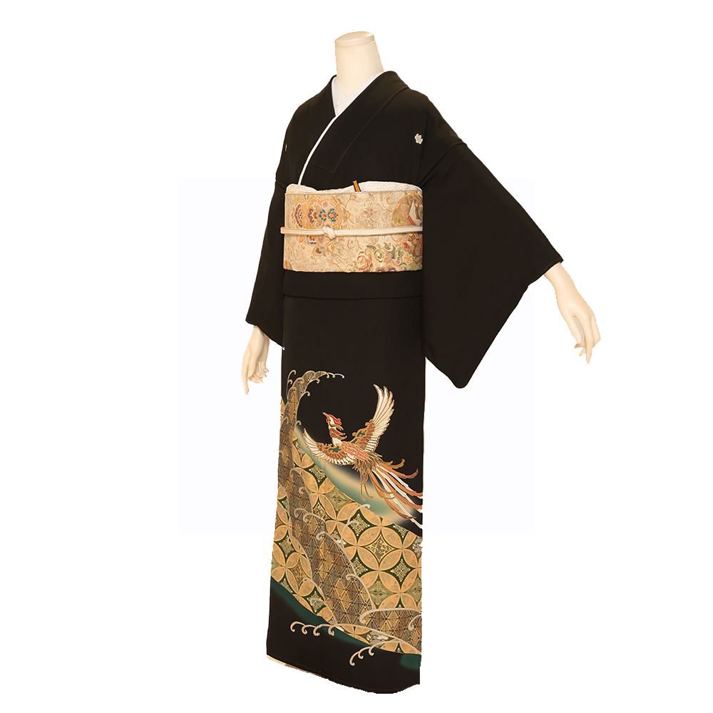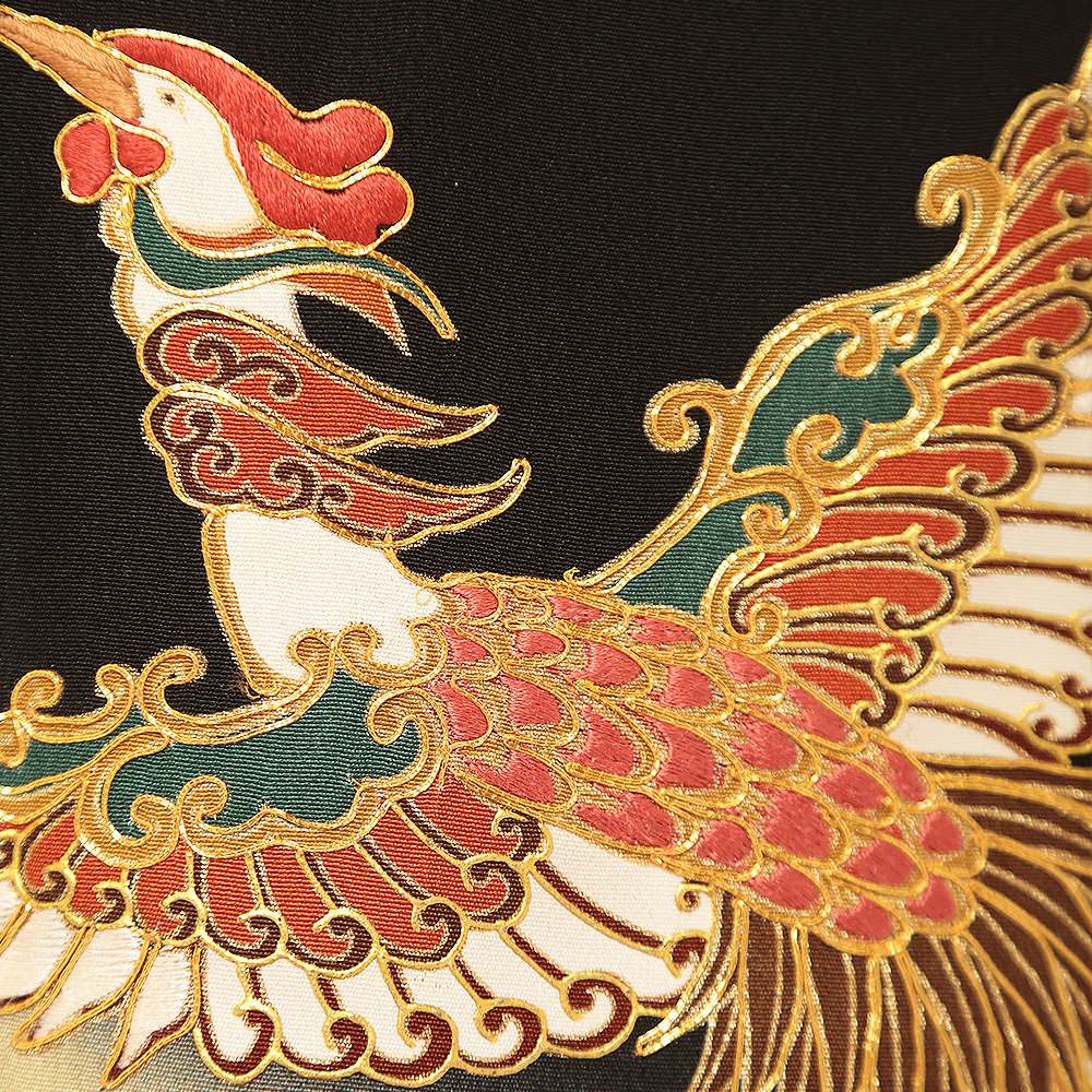 作家物の一品。箔押しをふんだんに使用した七宝や松菱の慶長波の上を金駒刺繍を施した鳳凰が舞い飛ぶ、豪華かつ重々しい一枚。五三桐の五ッ紋入り。