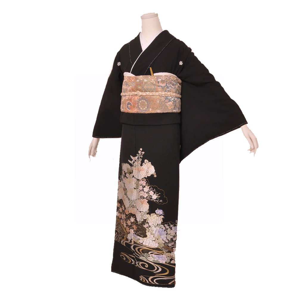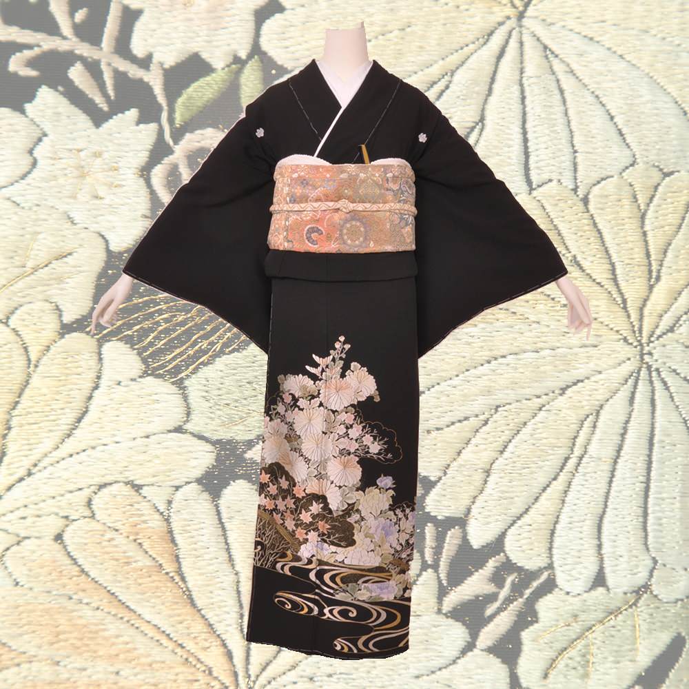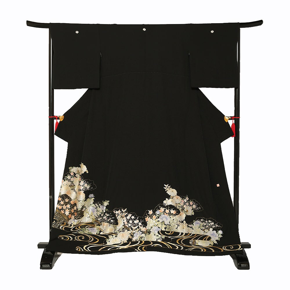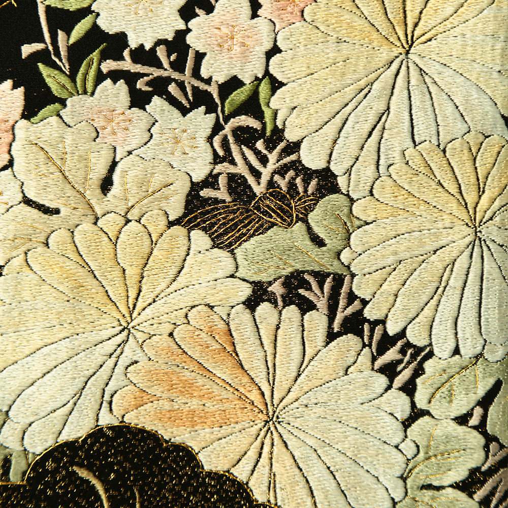 山口美術織物の一品。刺繍を用い描かれた流水に菊や桜・牡丹や紅葉など四季草花があしらわれ、その周りには金糸を織り込んだ霞が施された華やかかつ豪華な一枚。五三の桐の五ッ紋入り。