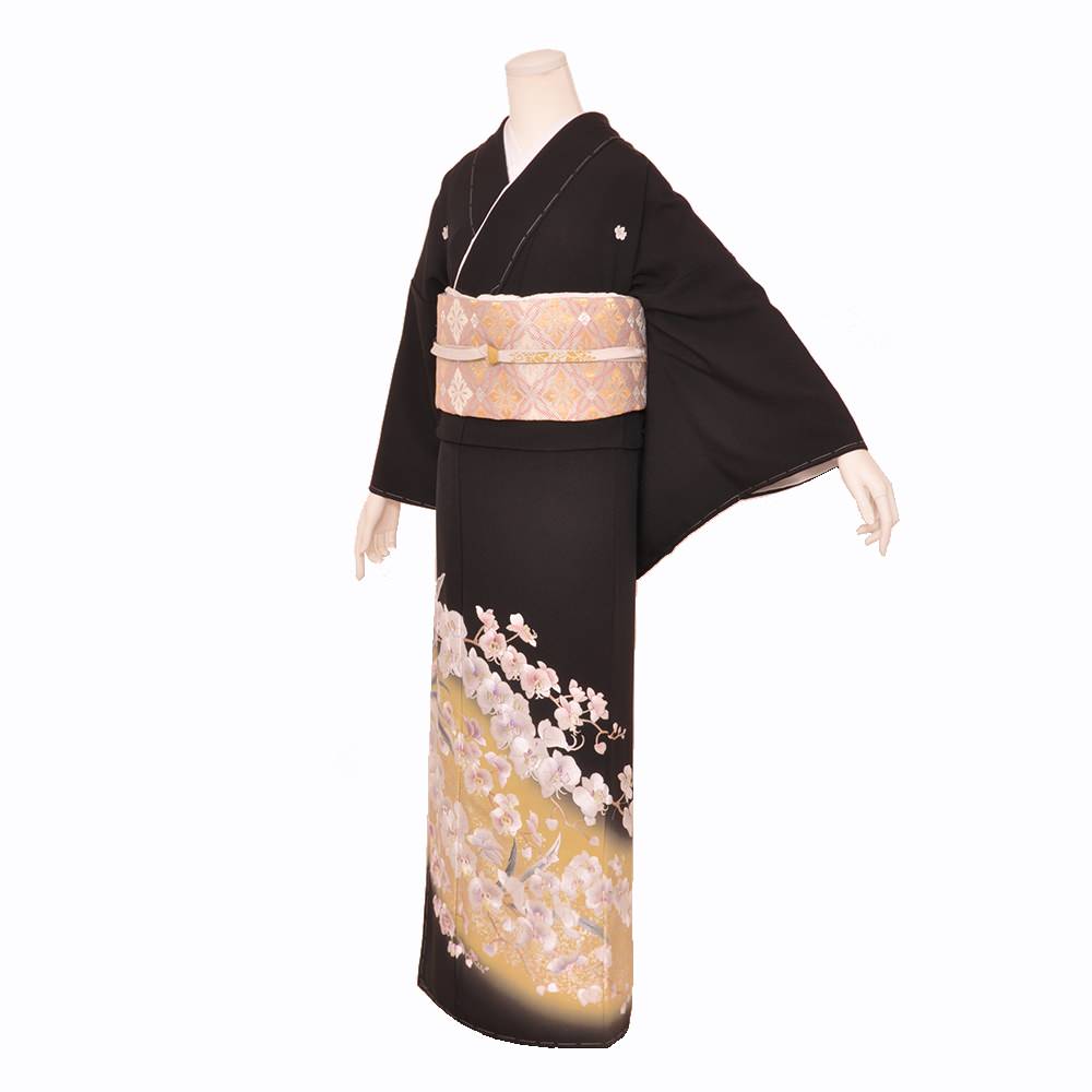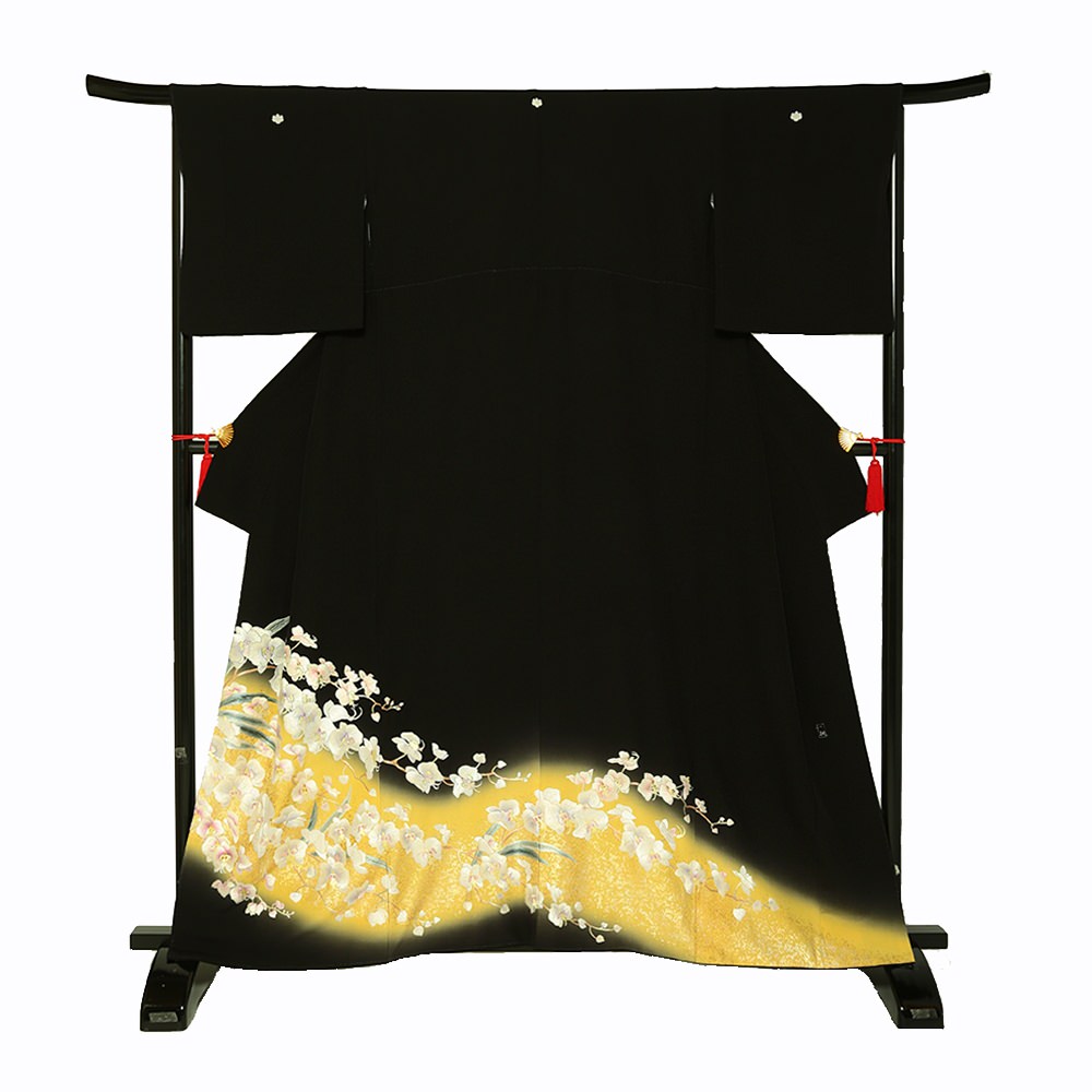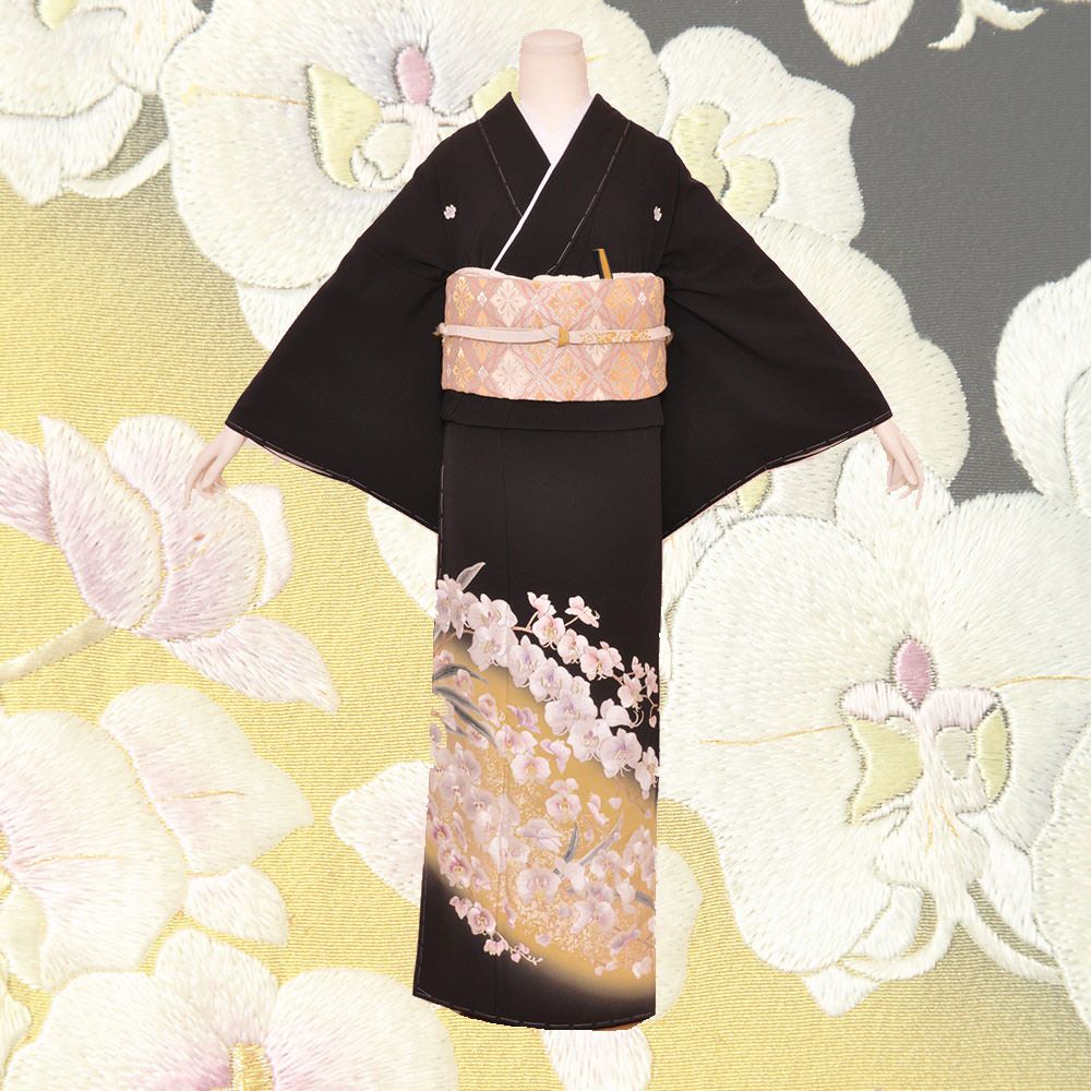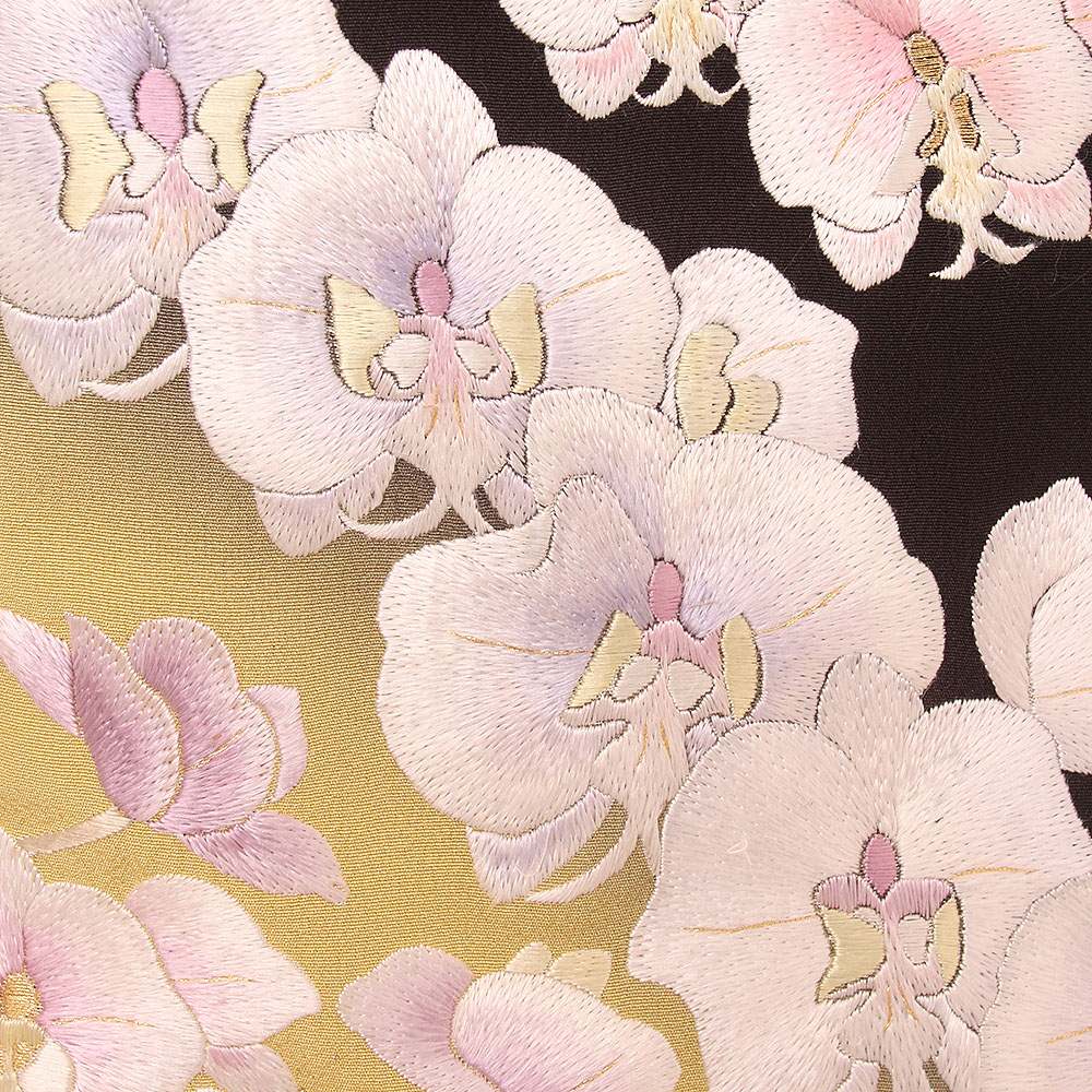 作家物の一品。金砂子を鏤めた芥子(カラシ)色のぼかしに沿って、刺繍を用い描かれた胡蝶蘭があしらわれた華やかかつ豪華な一枚。五三の桐の五ッ紋入り。