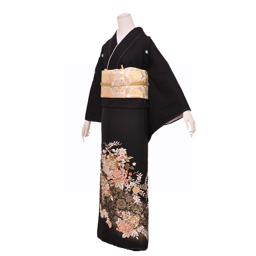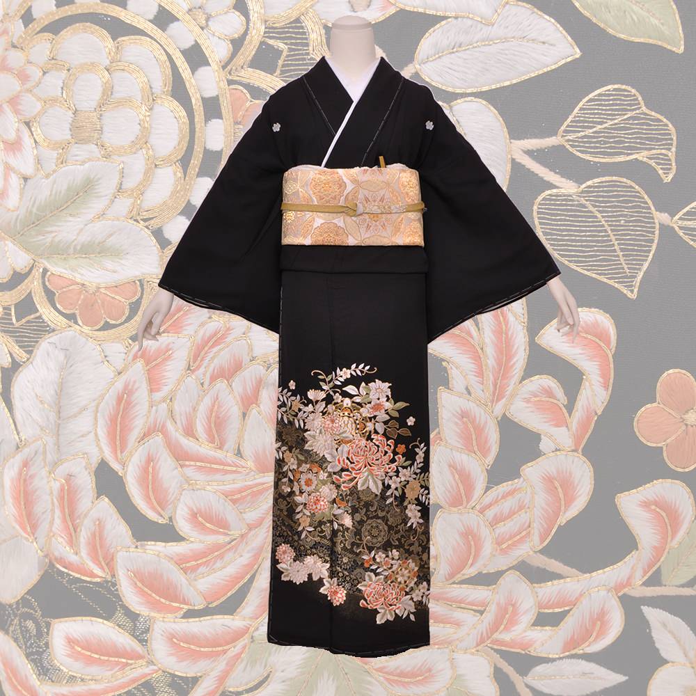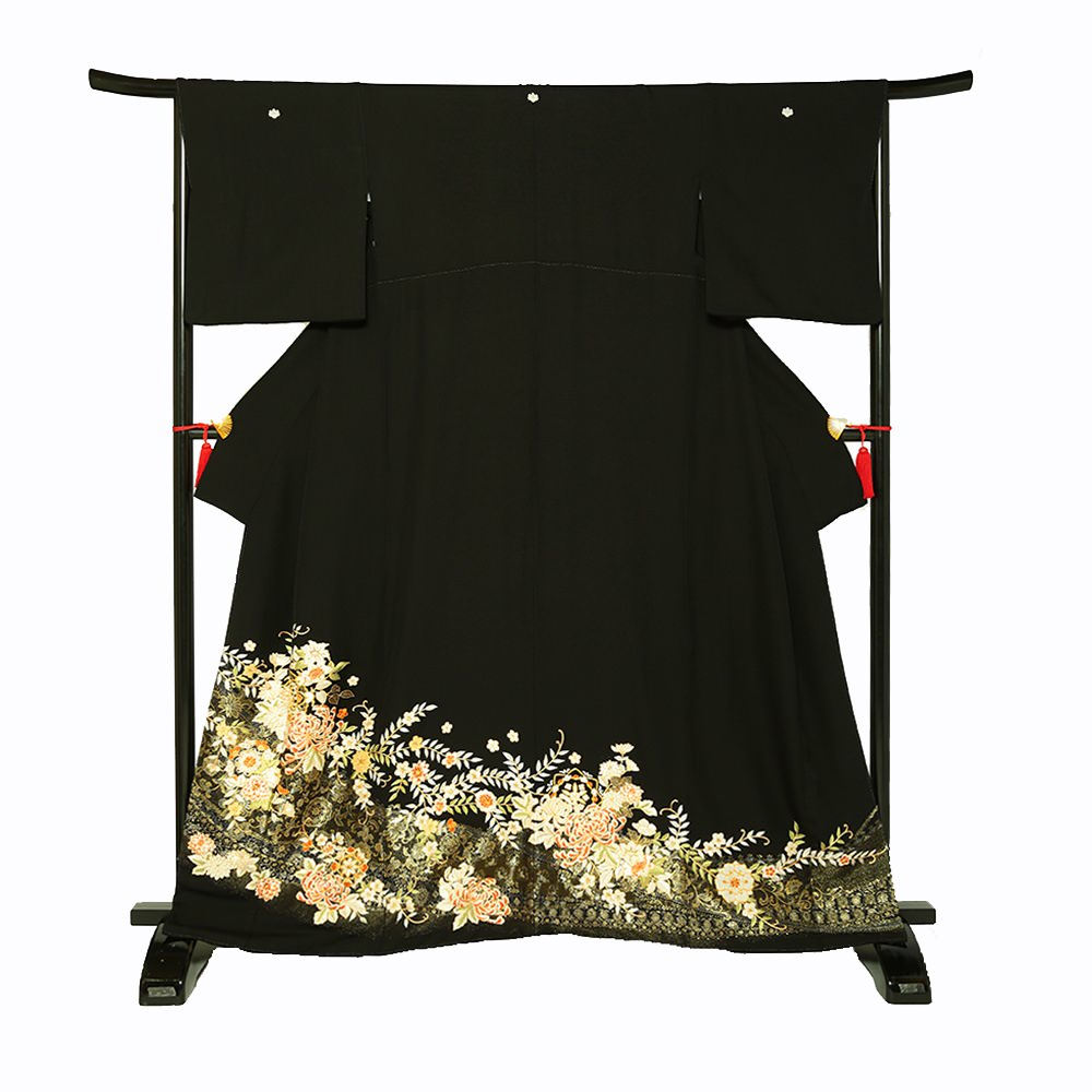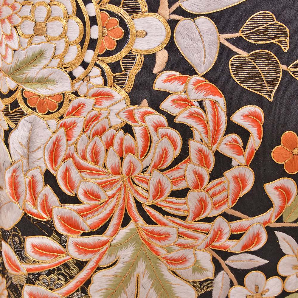 金駒刺繍や刺繍を用い描かれた華文や菊・梅などがあしらわれた豪華な一枚。五三の桐の五ッ紋入り。