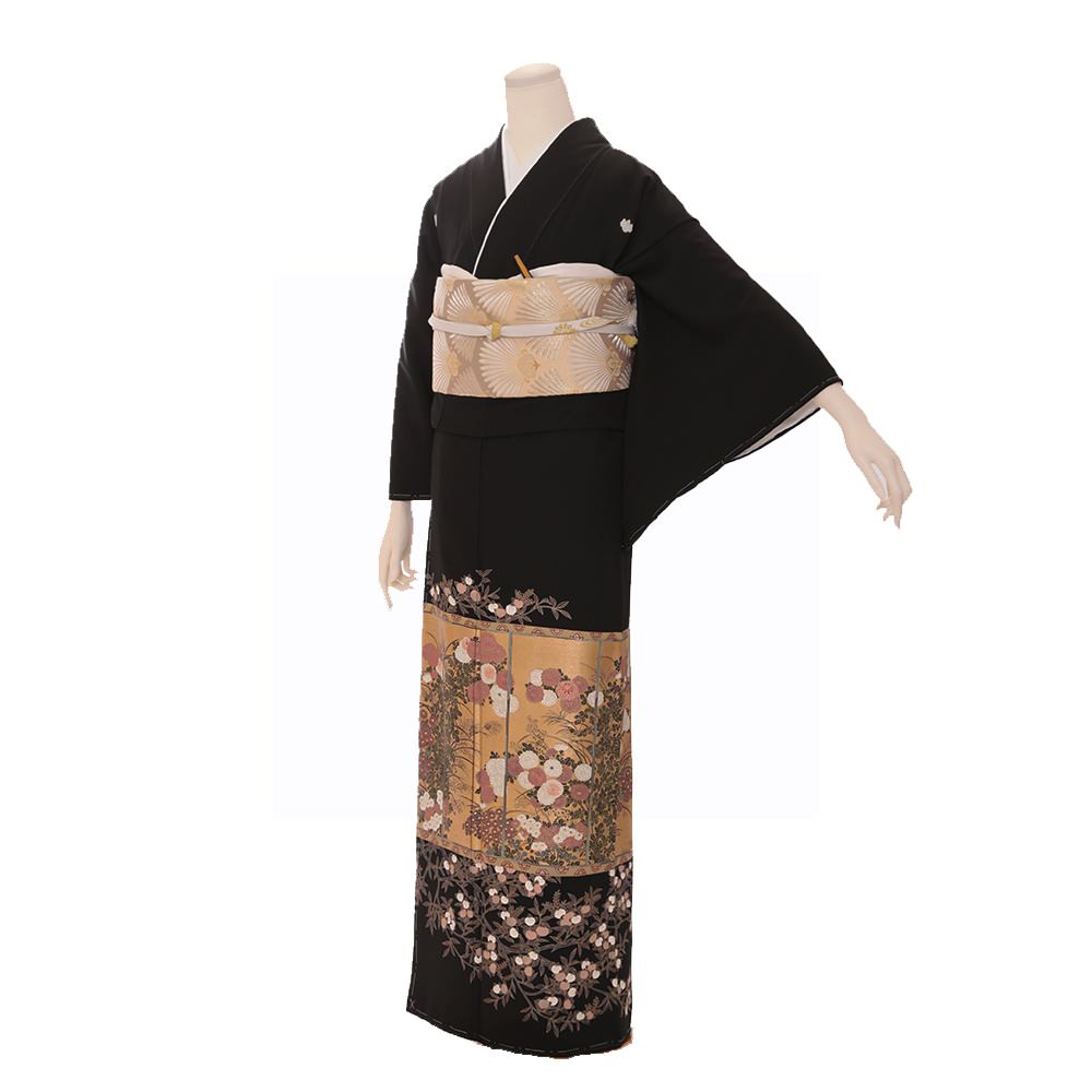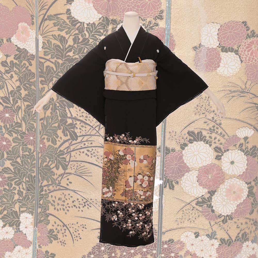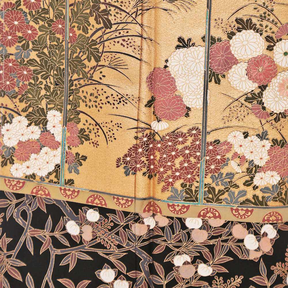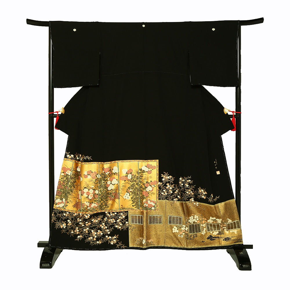 作家物の一品。橘が描かれた中に、金彩や螺鈿加工を用いた屏風が配され、大小様々な菊文があしらわれた豪華な一枚。五三桐の五ッ紋入り。