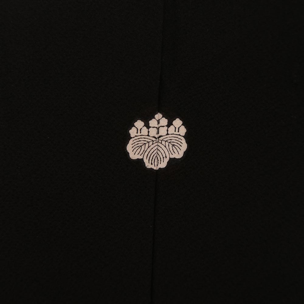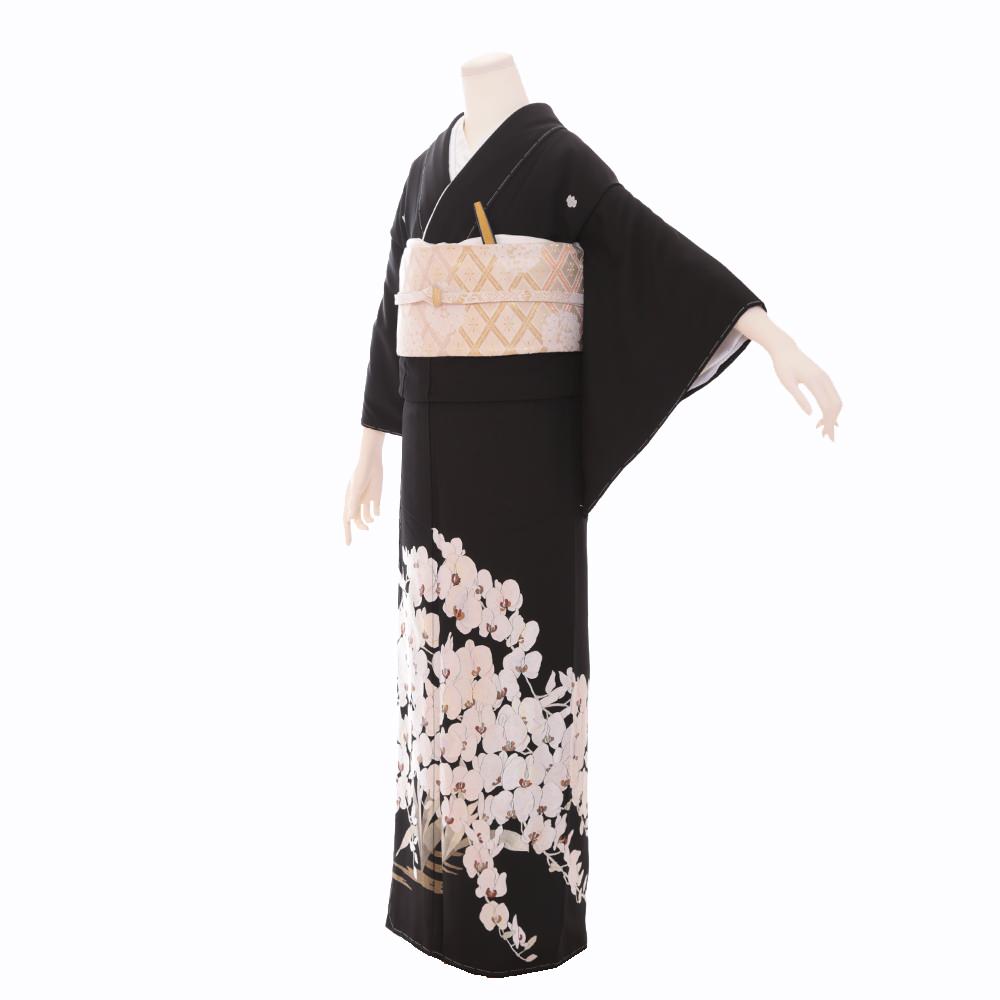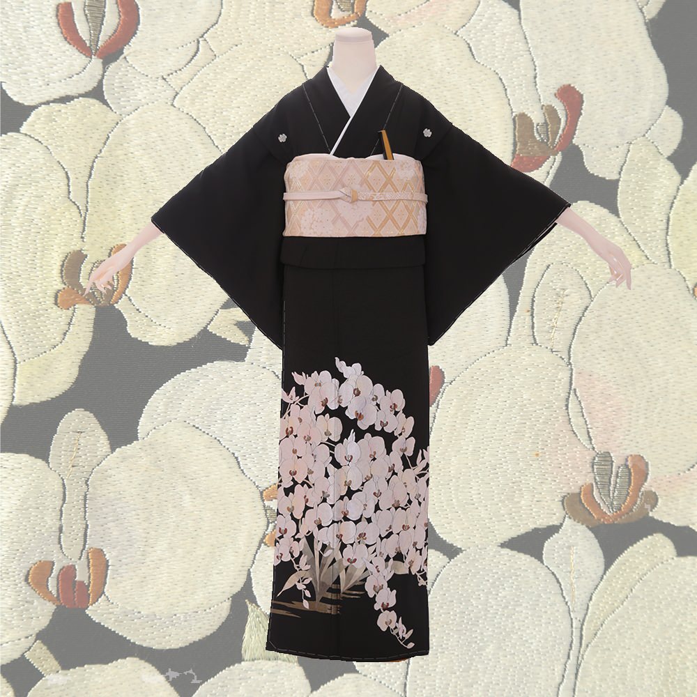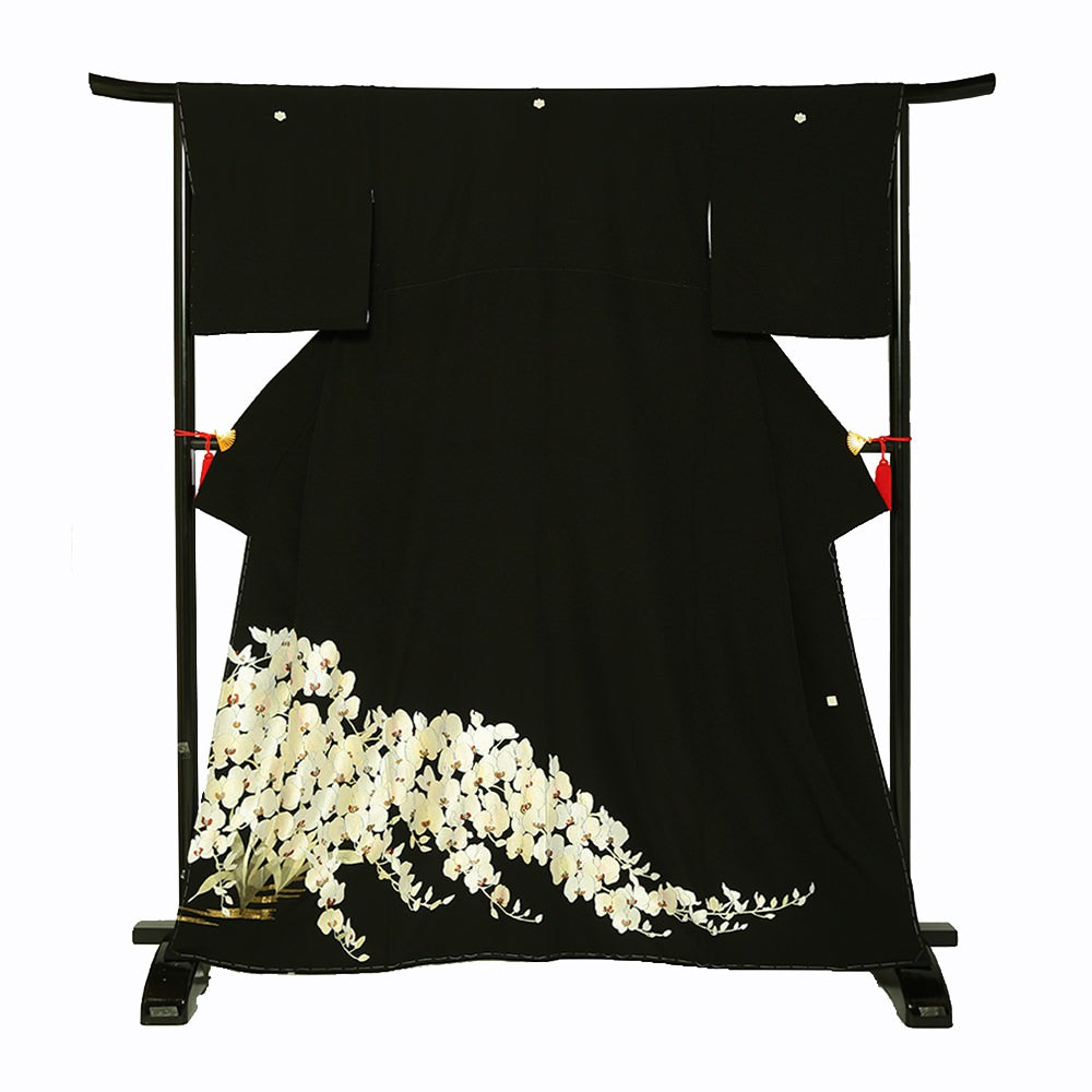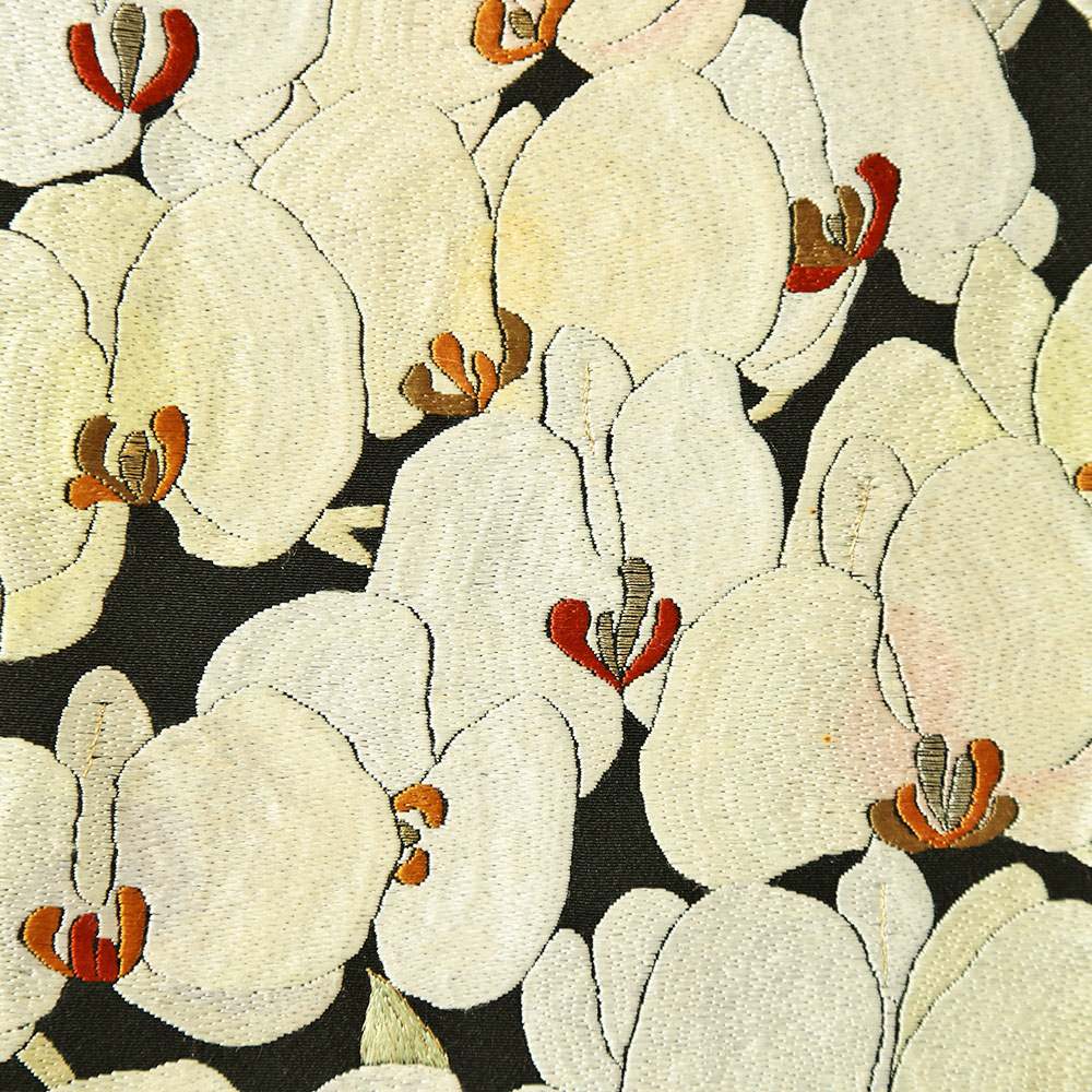 作家物の一品。総刺繍が施された蘭の花が大胆に配された華やかかつ個性的な一枚。五三の桐の五ッ紋入り。