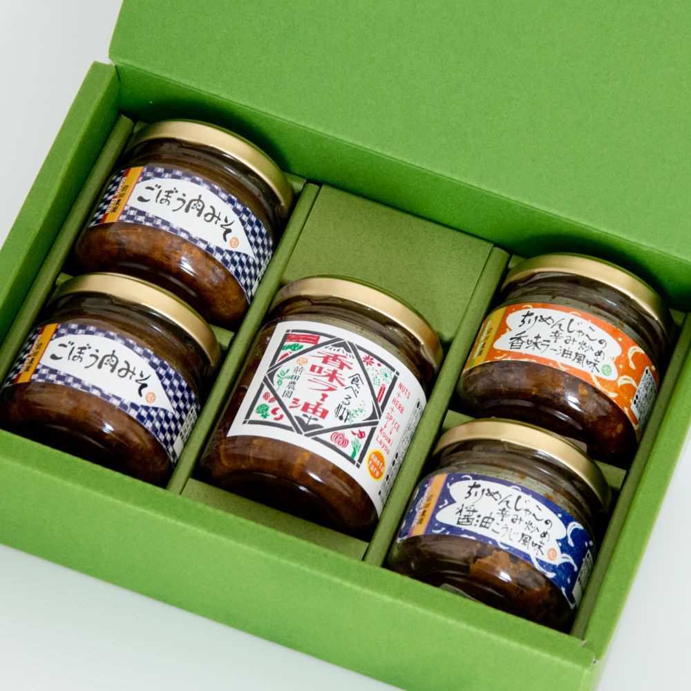 スパイシーなのにまろやかで、豊かな香りが広がります。そして鳥取境港産にこだわったちりめんじゃこを使用した「ちりめんじゃこの辛み炒め香味ラー油風味」、「ちりめんじゃこの辛み炒め醤油こうじ風味」のを含んだ4種セット。
