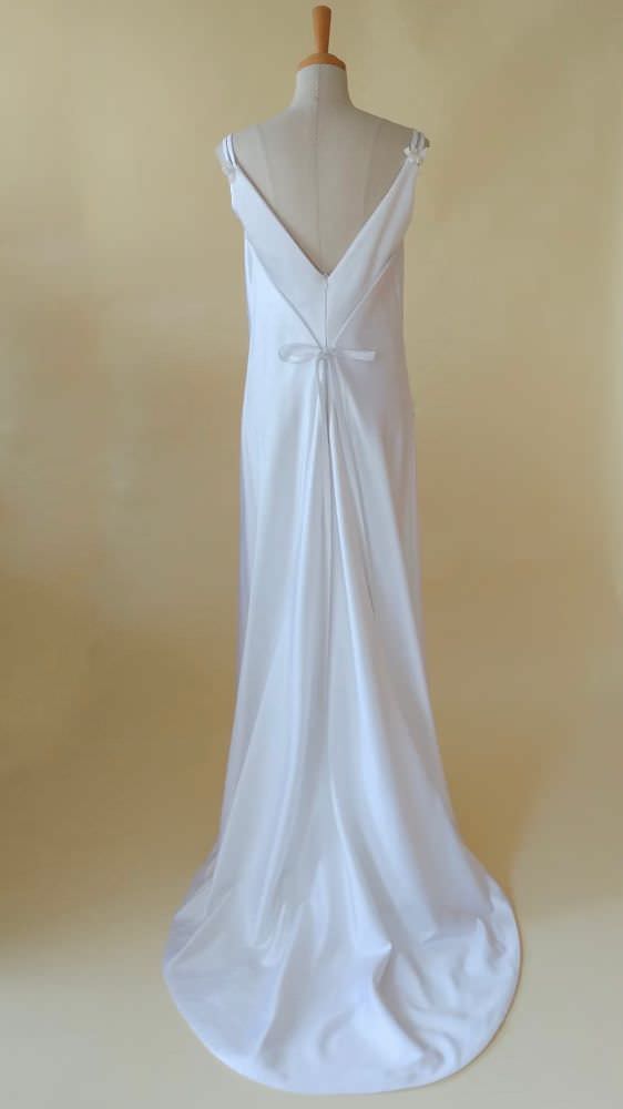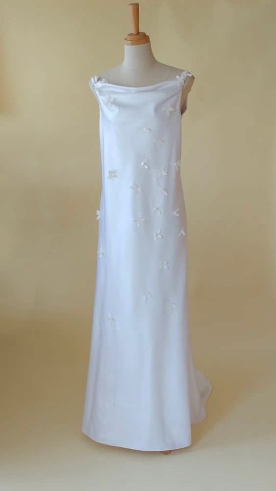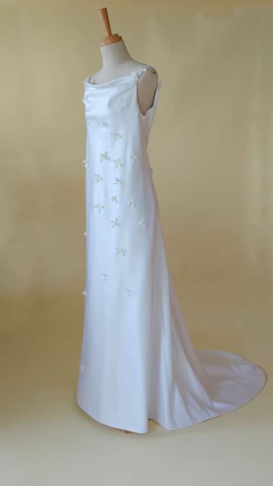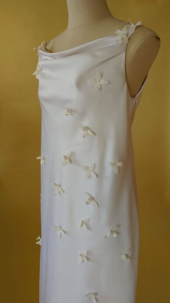 イタリア製サテンを使用し、胸元のドレープをポイントに総バイヤス仕立て。花嫁の花としても知られるブバリア(ブバルディア)の花のモチーフを全体にちりばめて、可憐で上品な仕上がりに。