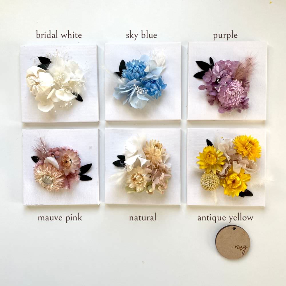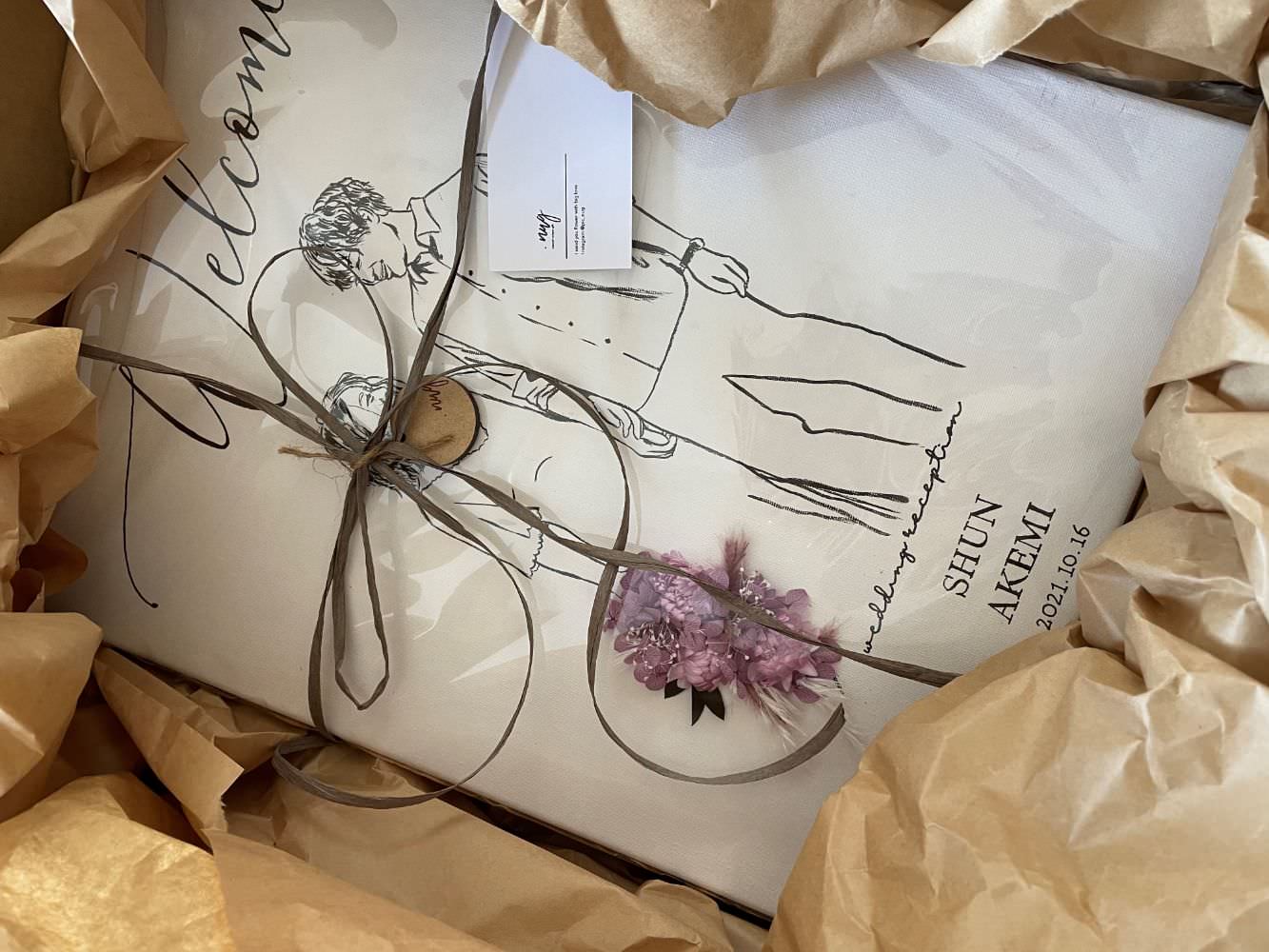 ドライフラワーのアレンジメントとキャンバスボードのカリグラフィーを専門とするハンドメイドショップ「.nug」から、幸せなお二人を祝福する、とっておきの自信作です。