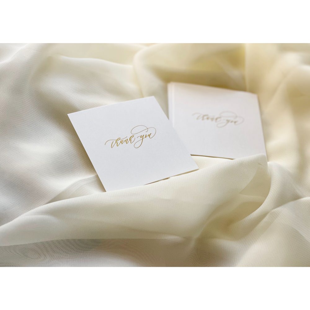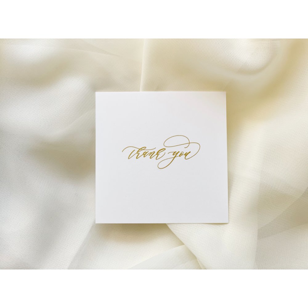 ふわりとした手触りのマシュマロペーパーを用いており、光沢を抑えたマットゴールドでthank youと印字しております。