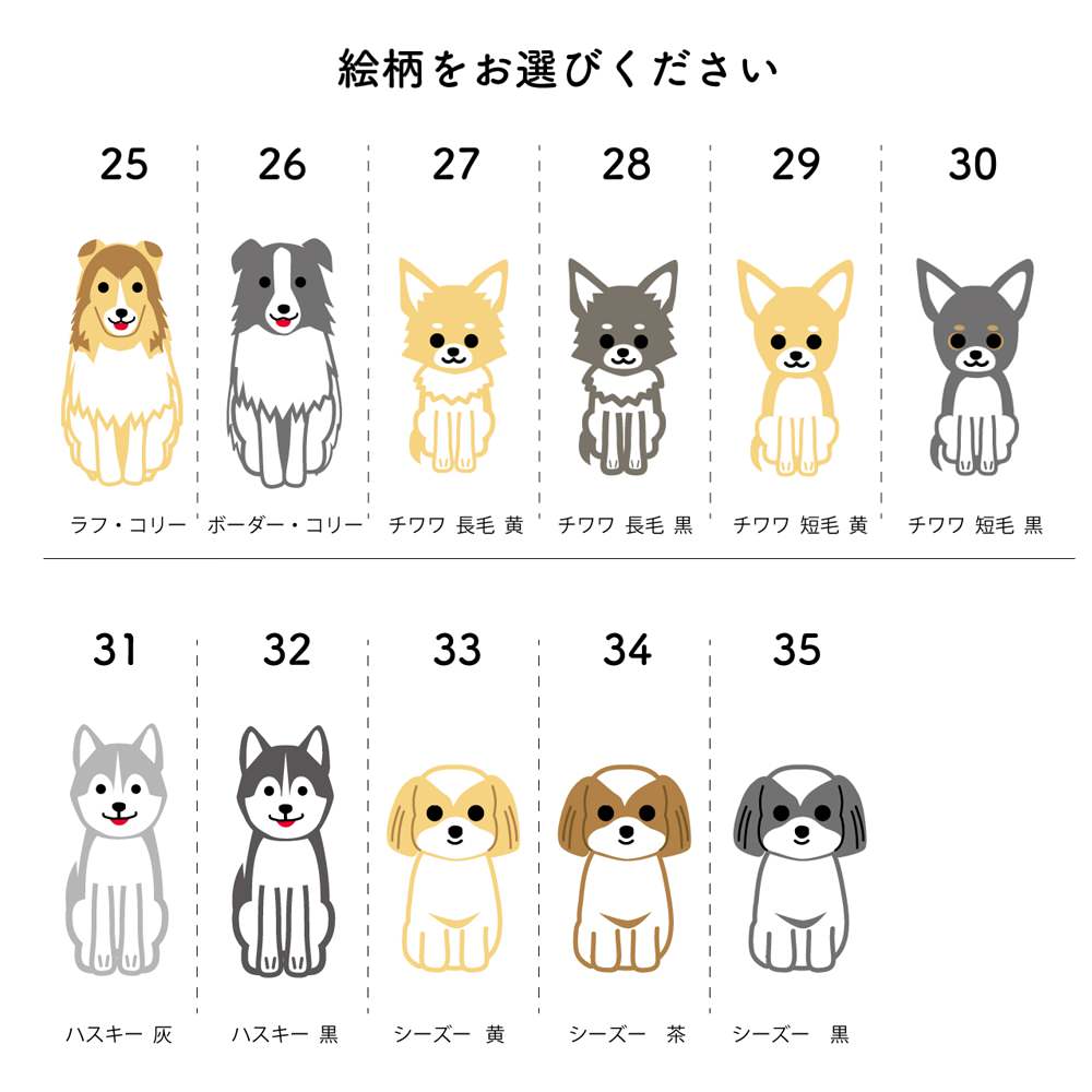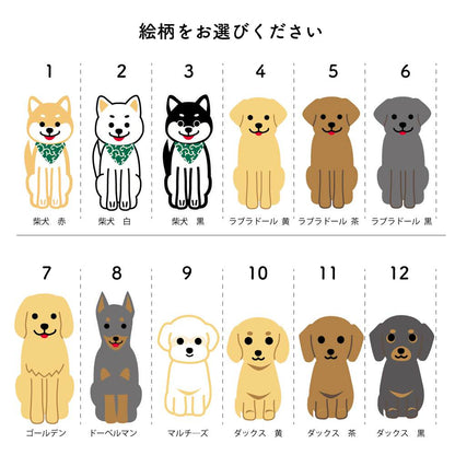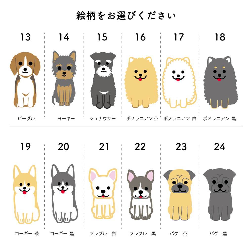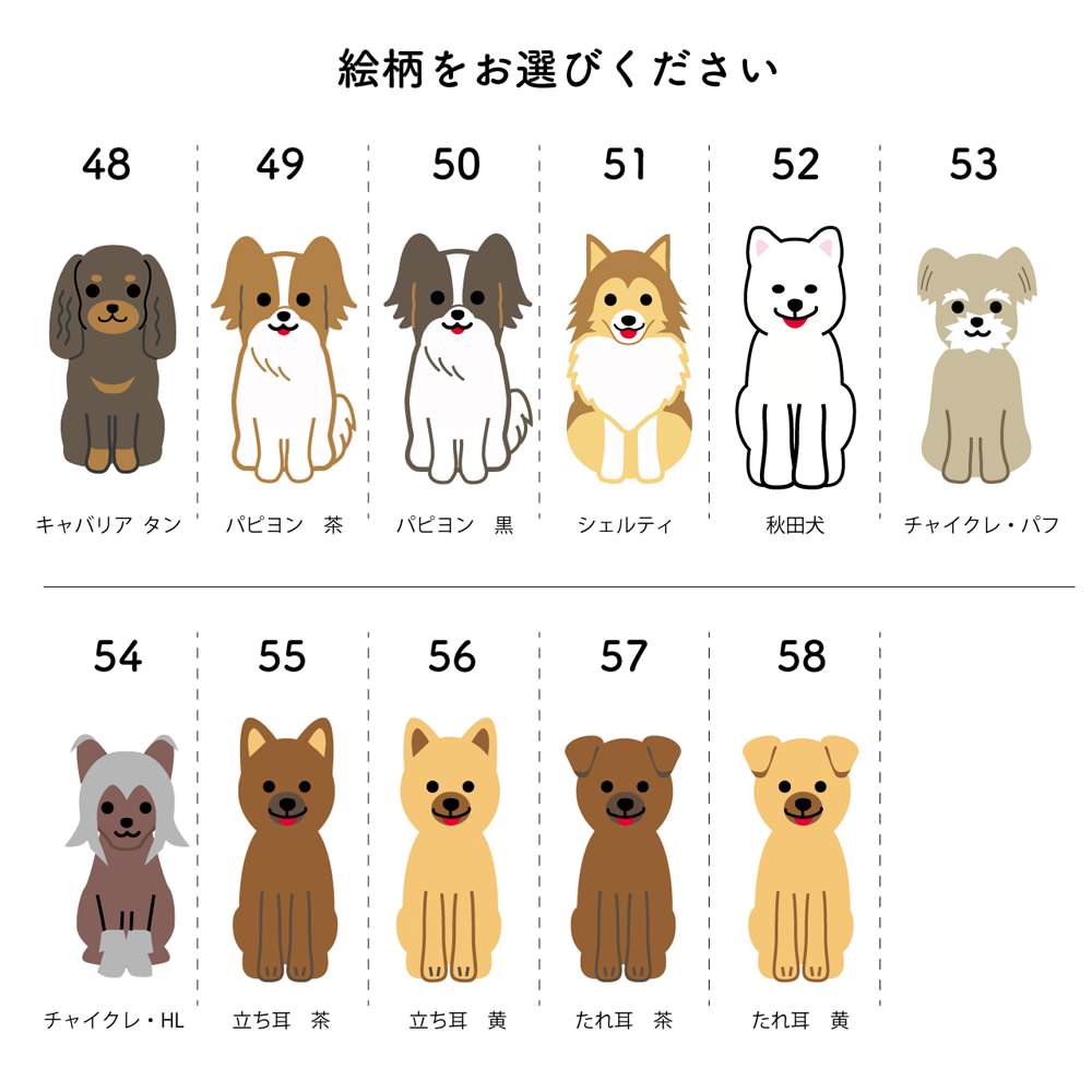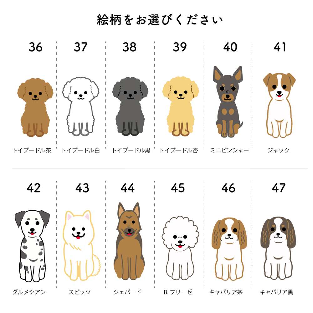 58種類の犬種からお好きな絵柄をお選び頂き、お好きな文字を入れて頂けます。