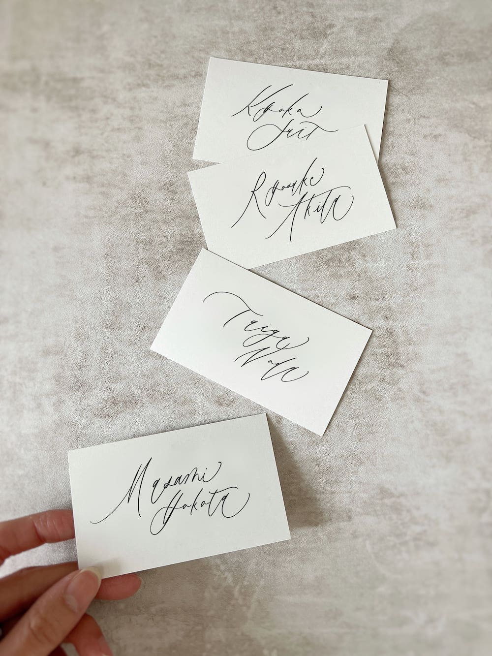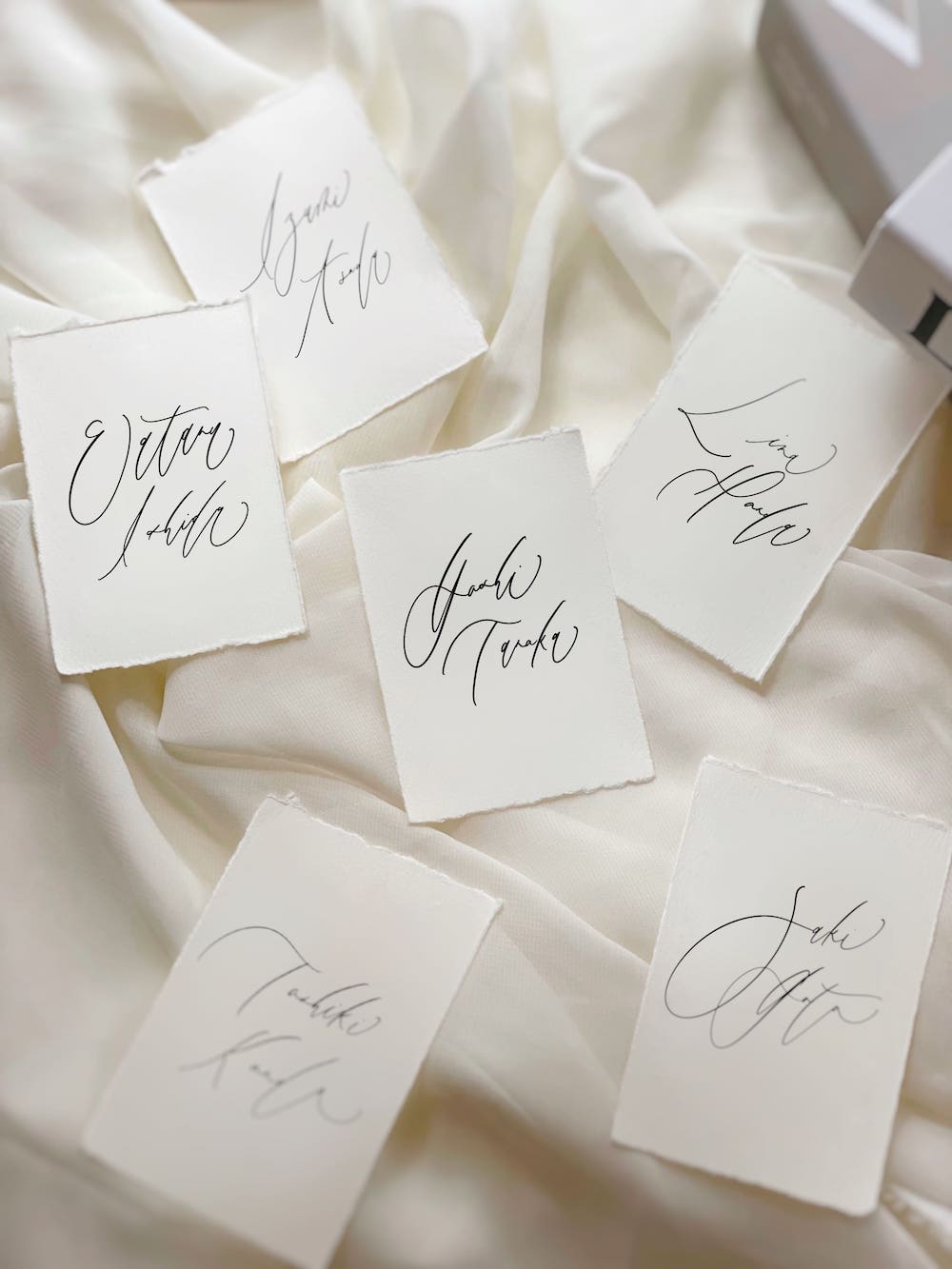 ふわりとした手触りのコットンペーパーを使用した、シンプルな中にもエッジが効いたお洒落な席札。