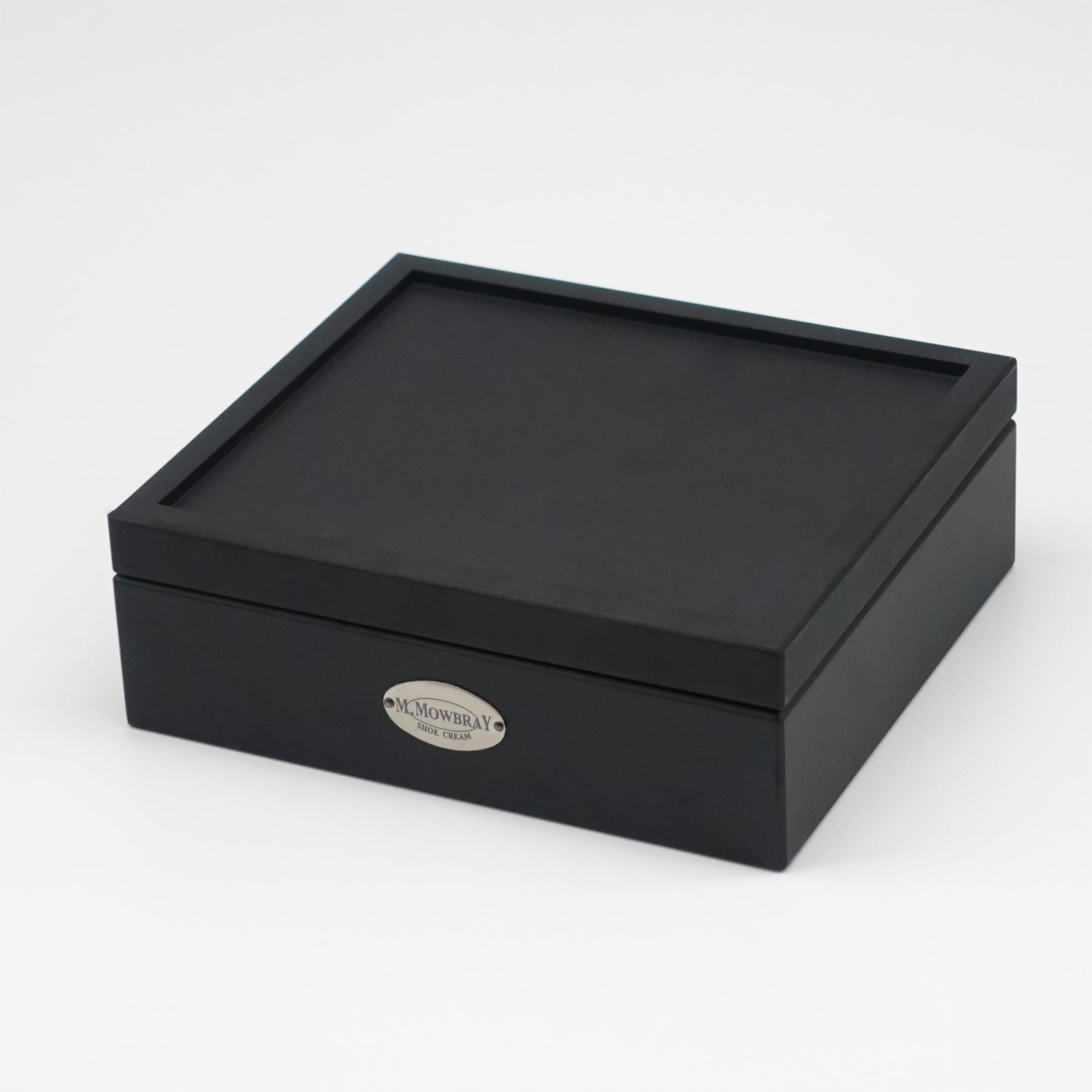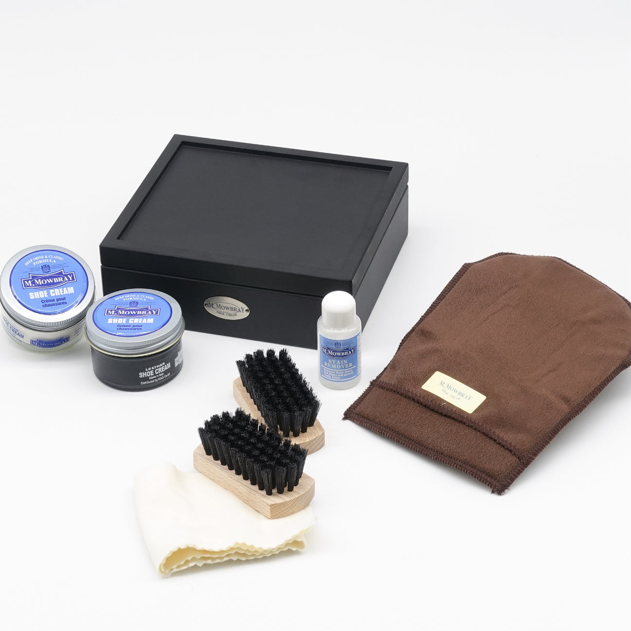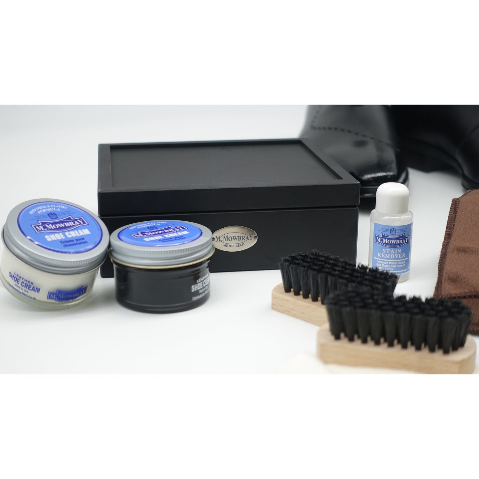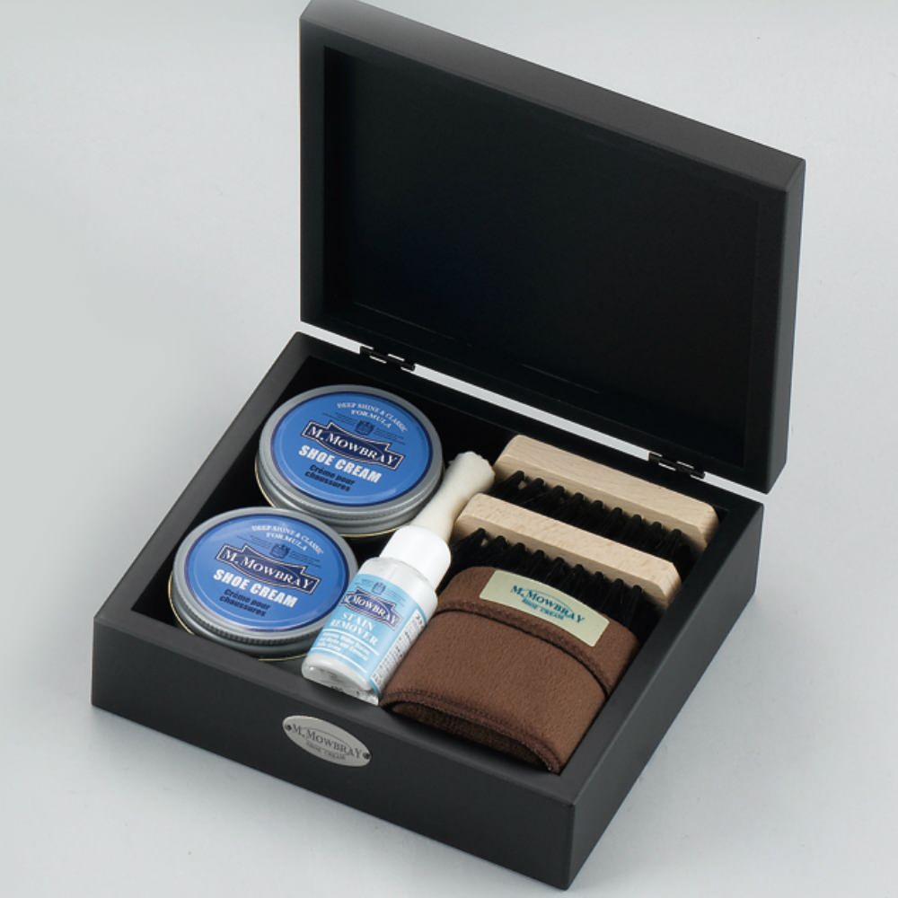 ブラックのつや消しボックスに入ったM.MOWBRAYブランドのシューケアセットです。