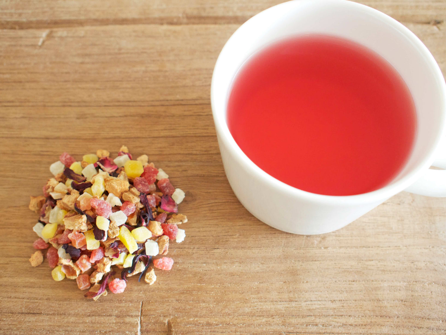 ドライフルーツを茶葉にしているので、お湯を注ぐと完熟フルーツの芳醇な香りが立ち上り、蒸らすと果実のやさしいお茶が抽出できます。