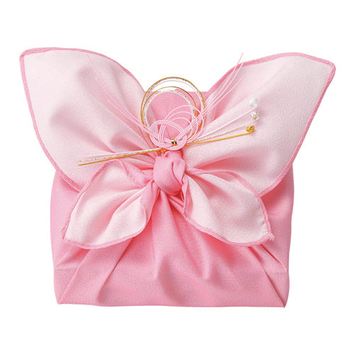 蝶は花と結婚し、決まった花から蜜をもらう代わりに、受粉の手伝いをします。胡蝶は決まった道を通り、結ばれた花に通う一途な生き物の「蝶」をアレンジした、「まるじょうオリジナル包装」の作品です。可愛いピンクは大和撫子の色、純愛の白と組み合わせの風呂敷です。