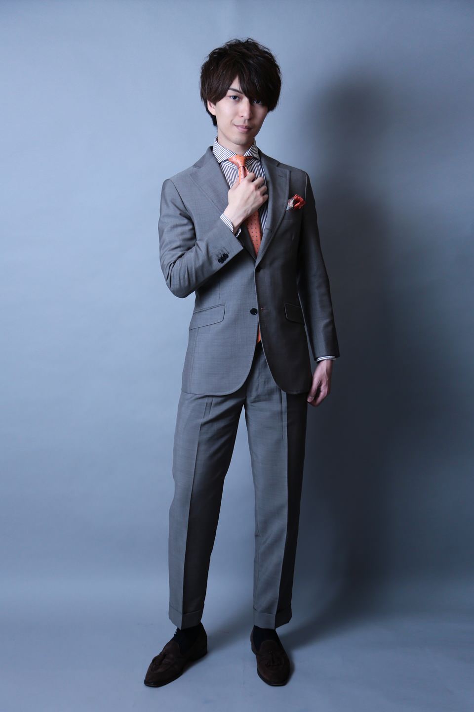 タキシードとしてオーソドックスなショールカラーやピークドラペルの他にスーツの衿の形として親しまれているノッチドラペルで仕立てることも可能です。