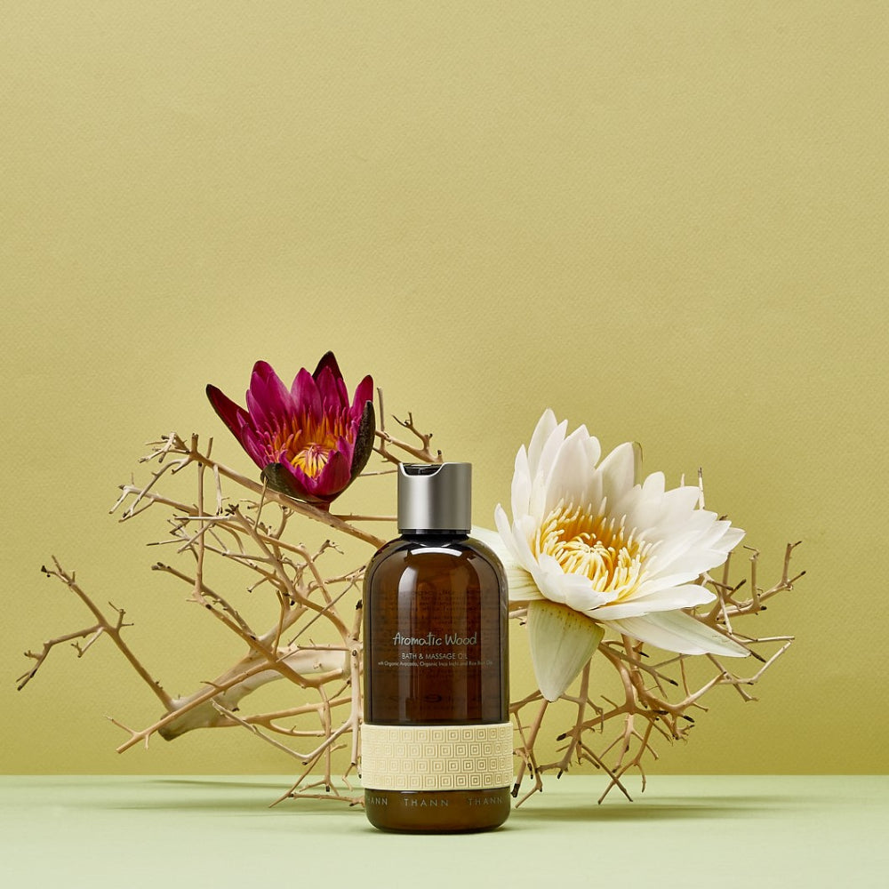 肌を柔らかく保つコメヌカ油ベースのバス&マッサージオイル。肌にすっとなじみ、柔らかくうるおします。