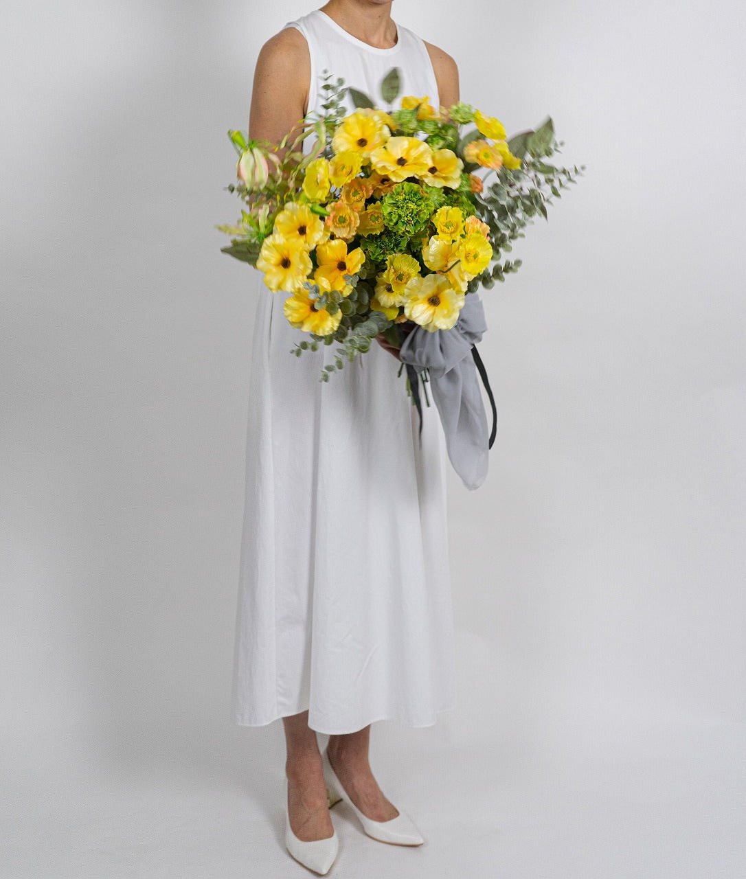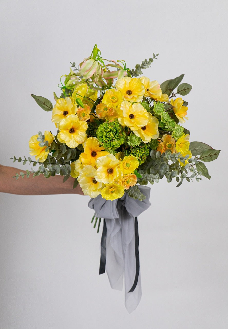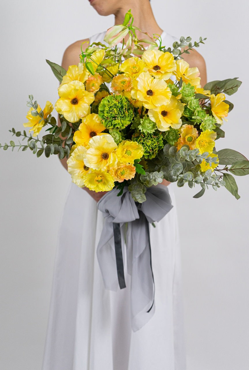 大胆にイエローの花とその魅力を際立たせるグレーッシュのグリーンを束ねるナチュラルスタイルのブーケは、おしゃれで可愛いけれどこなれ感もある、人気のテイスト。