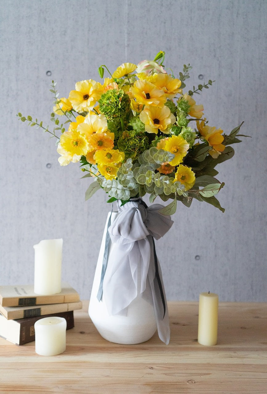 2021年トレンドカラーのイエロー×グレーを使ったナチュラルでボリュームのあるブーケ。