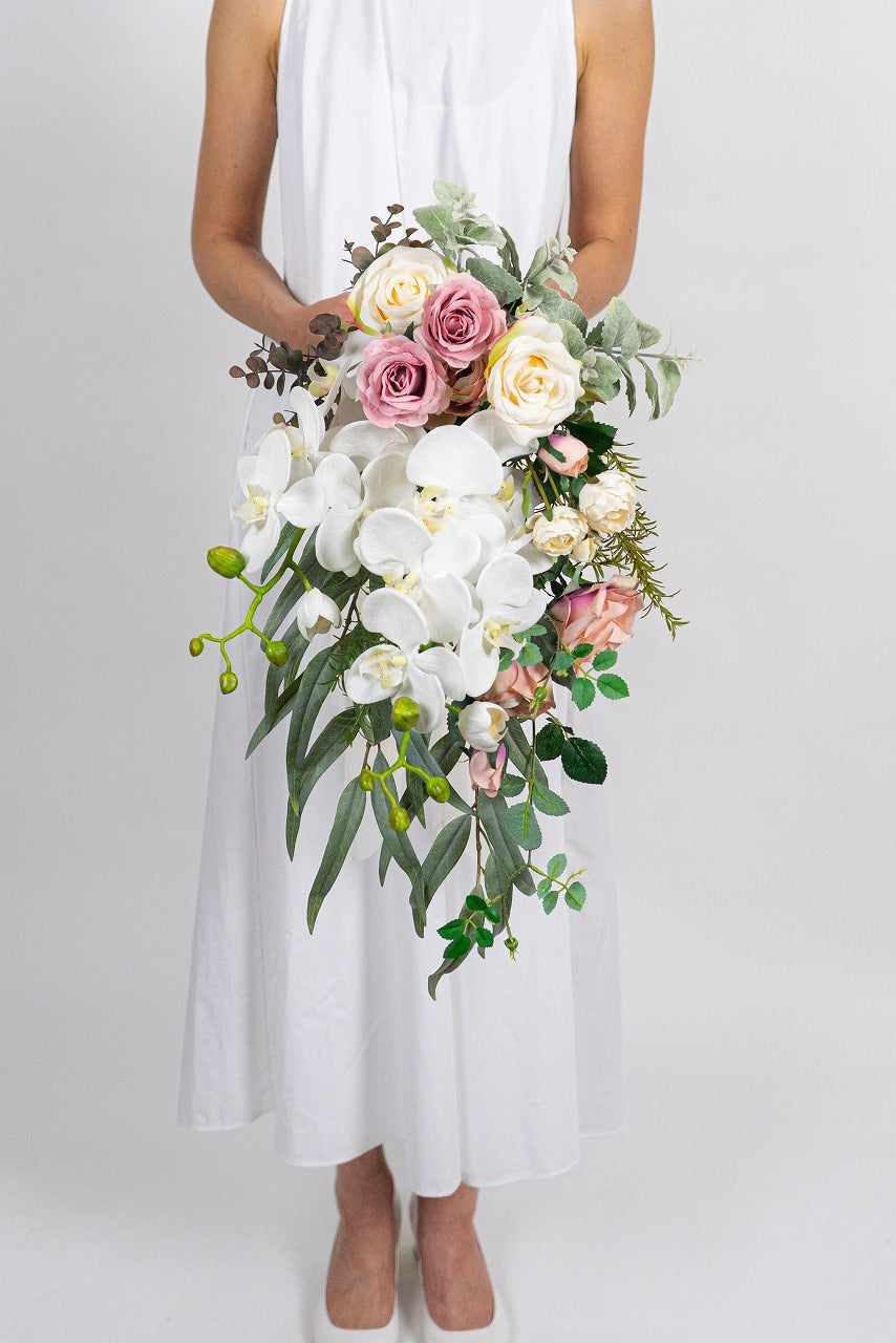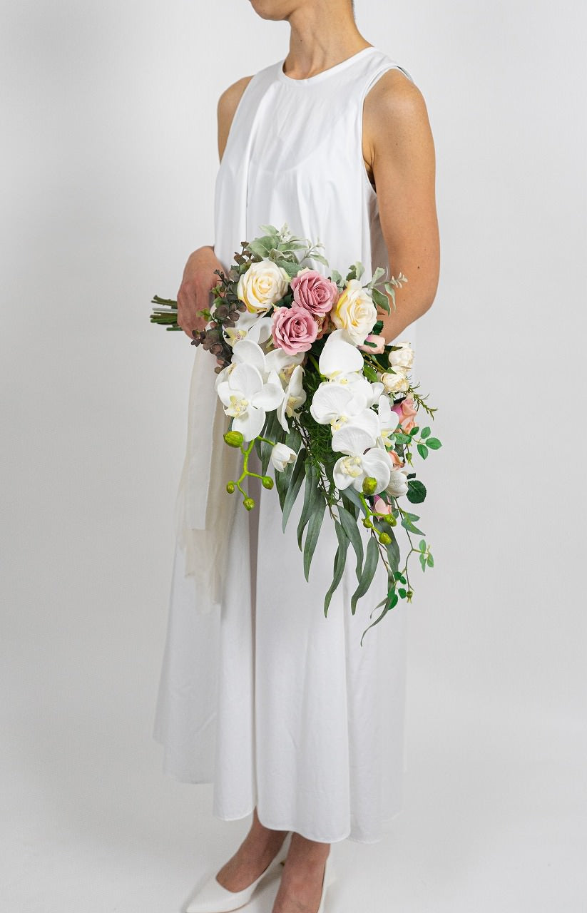 下に流れるキャスケードブーケのようなクラッチブーケです。バラを使いロマンティックな雰囲気にコチョウランをポイントに入れて垢ぬけた印象のおしゃれブーケに。